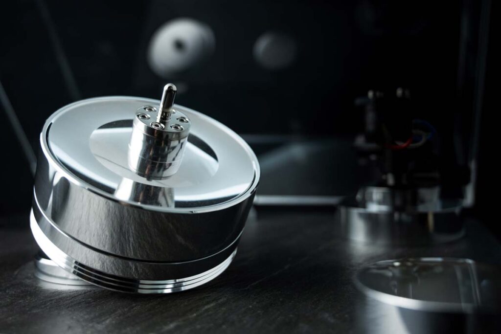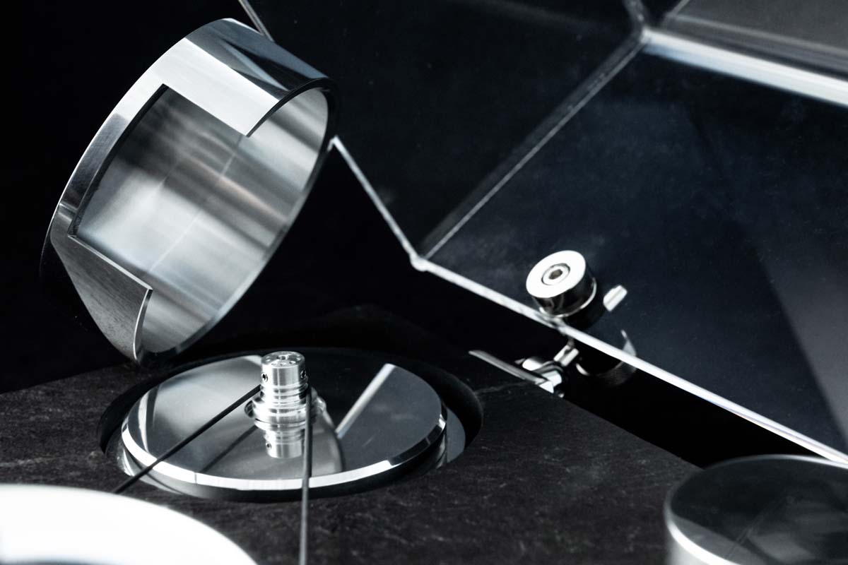 Im Bellini kommt zudem das bewährte hydrodynamische TMD-Lager mit Magnetkopplung zum Einsatz. Die Merkmale des Lagers wie stehende Achse, der Ölsumpf und die Umlaufschmierung sowie die Lagerkugel hätten sich schließlich seit über 30 Jahren bewährt, so Räke. Das TMD-Lager besteht aus zwei Hälften, wobei die untere Hälfte an der Achse befestigt ist, die durch den Riemen angetrieben wird. Der obere Teil wird seitlich durch ein hochpräzises Kugellager gestützt und trägt den Teller auf seiner Keramik-Lagerkugel. Die Kopplung zwischen den beiden Hälften erfolgt durch im Oberteil eingelassene Neodym-Magnete, sodass die Drehbewegung durch den Riemen rein magnetisch übertragen wird. Das Lager wird in eine dafür vorgesehene Öffnung des Chassis gestellt, hat hierzu also keinen direkten Kontakt, was zudem sehr aufgeräumt aussieht.