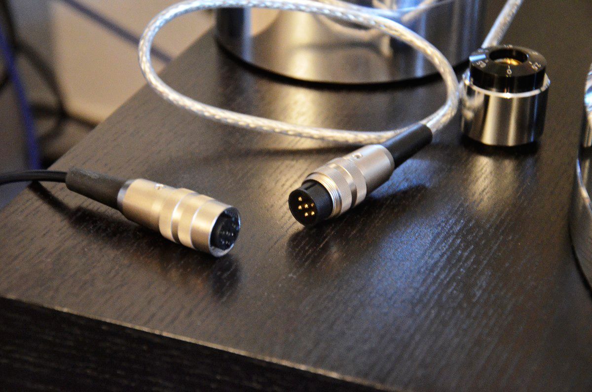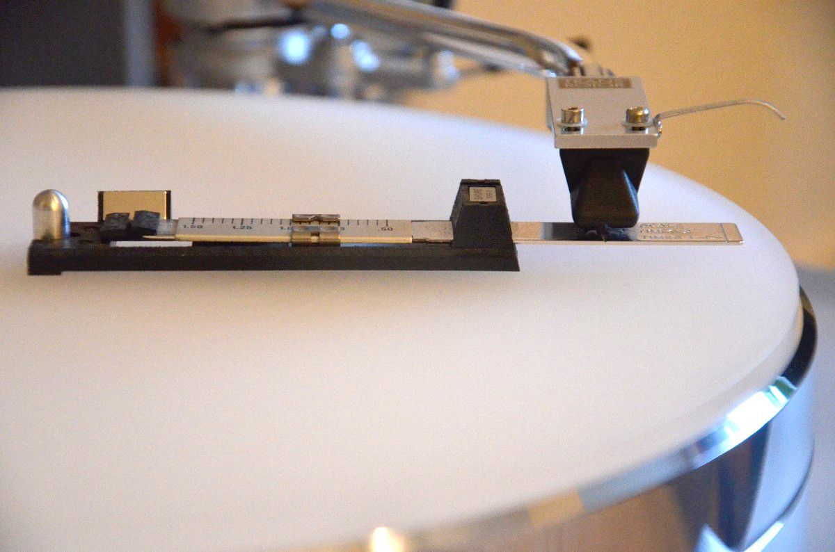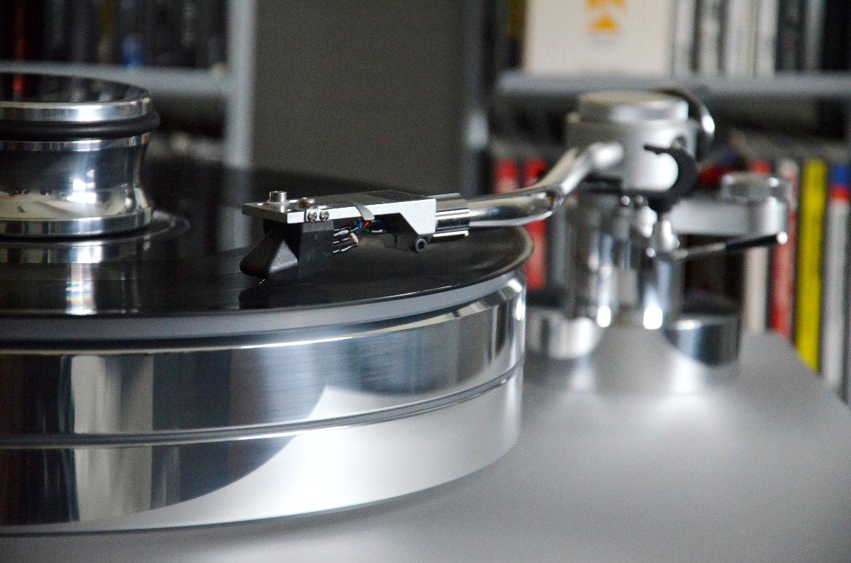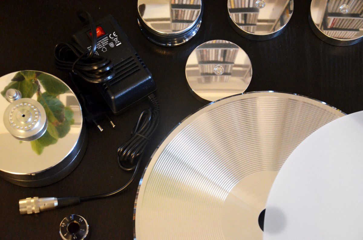 Mir erscheint sinnvoll, aus den drei „Untersetzern“ ein gleichseitiges Dreieck zu bilden, über dessen Mittelpunkt das Tellerlager zu liegen kommt. Das Lager besteht aus einem Edelstahldorn, der in einer Messingbuchse auf einer gehärteten Stahlkugel läuft. Der 60 Millimeter starke und 10 Kilogramm schwere Teller aus einer hochglanzpolierten Aluminiumlegierung wird auf einen Kragen des Lagers aufgesetzt. Eine wellenähnliche Fräsung auf der Unterseite des Plattentellers soll dazu beitragen, dass dieser auch im aufgesetzten Zustand nicht zum Klingeln neigt – doch um das vollständig zu erreichen, muss auch die Tellerauflage aus weißem Acryl, eine Schallplatte sowie das Plattenteller-Gewicht aufgelegt werden. Letzteres sorgt für die notwendige Haftung zwischen Teller und Platte und wird als essenzieller Bestandteil dieses Plattenspielers serienmäßig mitgeliefert.