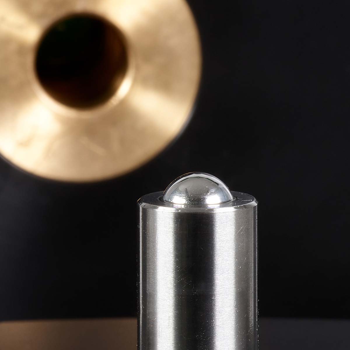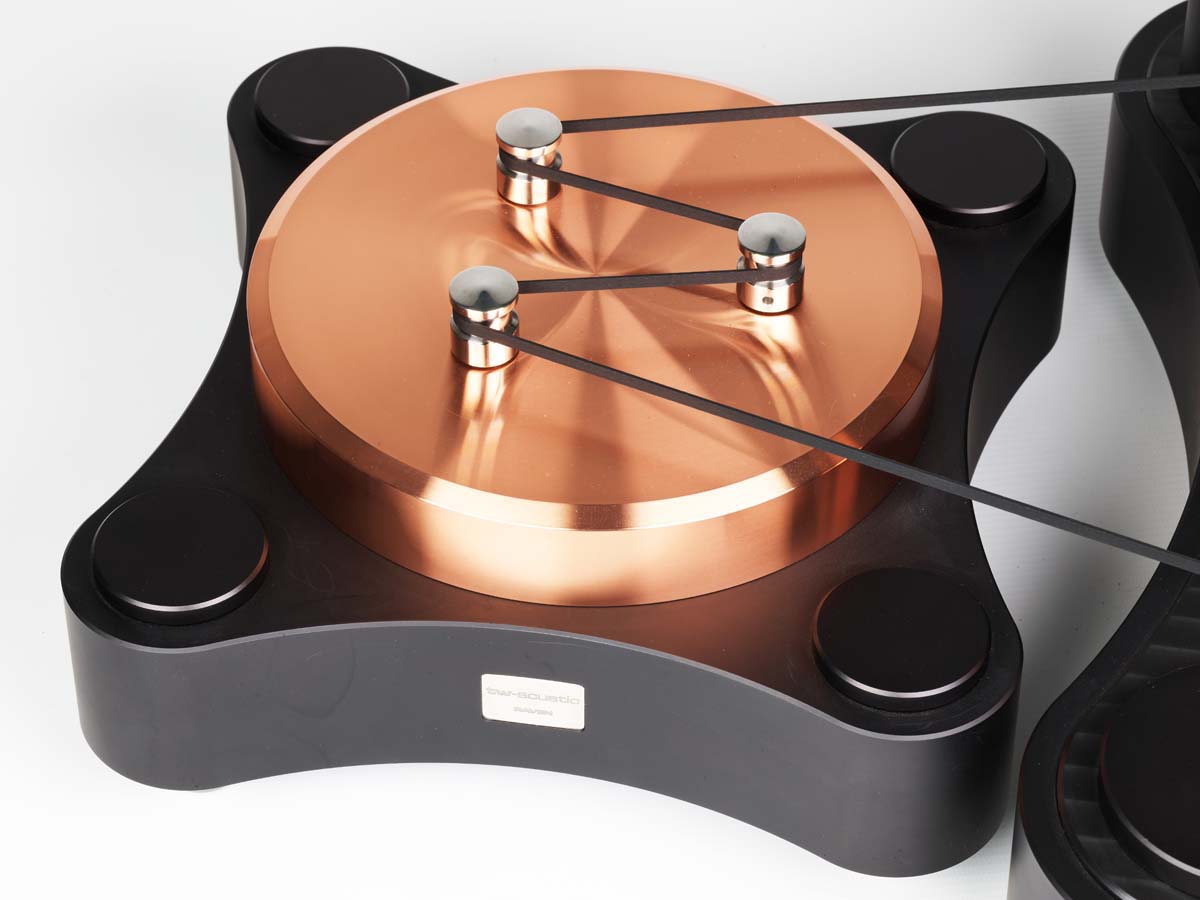 Nachdem ein äußerst unkooperativer Spediteur die 90 Kilogramm schwere Palette vor die Haustür platzierte, gelang es mir mithilfe einer Sackkarre die nicht sehr großen aber umso schwereren Kisten die Treppe hochzuwuchten. Allein 30 Kilo wiegt das aus einer massiven Aluminium-Basis mit einem passgenauen POM-Inlet bestehende Chassis. Das speziell angefertigte Polyoxymethylen wird unter anderem mit Kupferstaub angereichert, um die akustischen Eigenschaften zu optimieren. Die Oberfläche weist eine dezent gestreifte Struktur auf, die dem Laufwerk die monolithische Wuchtigkeit nimmt. Mittels Inbus verschraubte ich die 16 Millimeter durchmessende Tellerachse, in die eine Lagerkugel aus Edelstahl eingepresst ist, mit dem Chassis. Dieses ruht auf vier kegelförmigen höhenverstellbaren Füßen mit abgeflachten, oberflächenschonenden Auflageflächen. Im Inneren bergen sie zwei über eine Stahlfeder verbundene Kugeln, die das Laufwerk von der Stellfläche entkoppeln. Hierdurch wird die Nivellierung erleichtert, da verbleibende Unebenheiten ausgeglichen werden. Das funktionierte ausgezeichnet, und so stand das Fundament des Drehers in kürzester Zeit perfekt ausgerichtet neben seinem kleinen Bruder auf dem Rack. Der beeindruckende, circa 20 Kilogramm schwere Plattenteller besteht aus zwei ineinandergeschobenen, verschraubten und verklebten Elementen aus Kupfer und POM. Das hochpräzise Bronze-Achslager hat wie alle Laufwerke von TW Acustic einen Lagerspiegel aus besonders hartem Kunststoff.