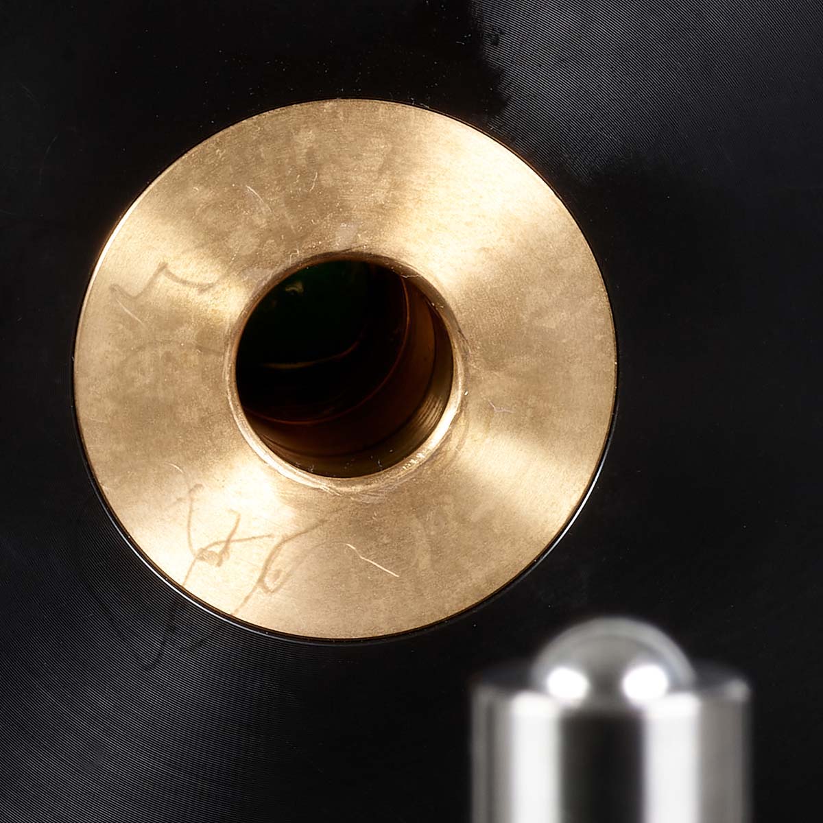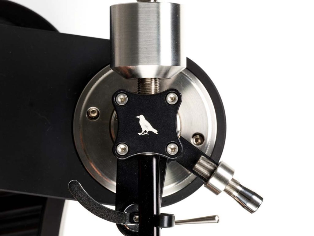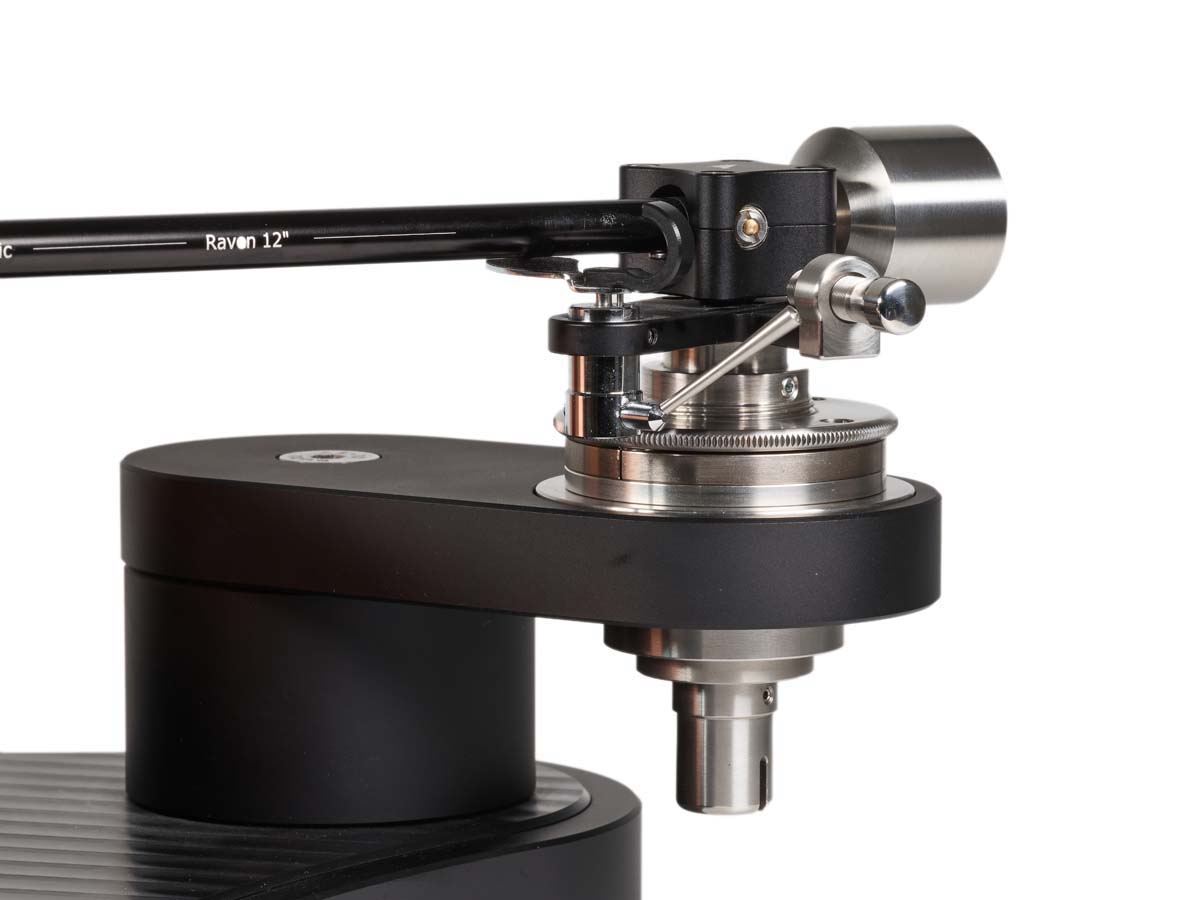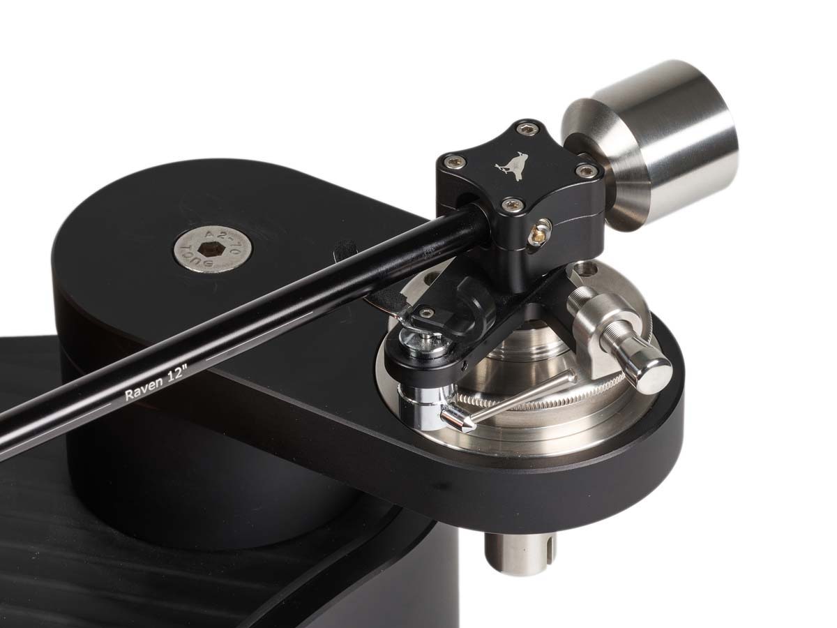 Auf allen vier ausgewölbten Eckbereichen des Chassis befinden sich 80 Millimeter durchmessende Tonarmsockel, die bei Bedarf alle genutzt werden können. Die aus 20 Millimeter starkem Aluminium gefertigten Ausleger lassen die Montage von Tonarmen aller üblichen Längen zu. Verwendet man die hauseigenen Tonarme, machen eine Kunststoffkappe mit Dorn und eine passende Öffnung in der Headshell die präzise Montage zum Kinderspiel. Der Tonarm, beim Raven Black Night eine 12-Zoll-Version, ist mit gleicher Stringenz wie das Laufwerk konstruiert. Das aus eloxiertem Aluminium bestehende Tonarmrohr trägt vorne eine elegant-filigrane Headshell mit justierbarem Azimut. Mitgeliefert werden drei unterschiedliche Gewichte, mit denen die Auflagekraft aller üblichen Tonabnehmer über ein Gewinde feinfühlig eingestellt werden kann. Gelagert wird der Tonarm kardanisch. Die rigoros selektierten Präzisionskugellager sind genauestens montiert. Aus diesem Grund sollte auch der noch so Neugierige die Finger bzw. den Inbusschlüssel davon lassen!
