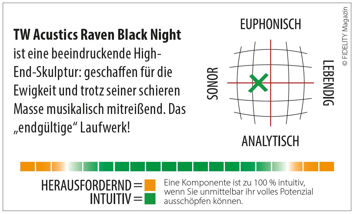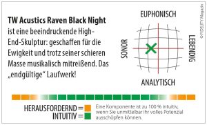 Grundsätzlich bin ich auf jedes neue Testobjekt gespannt. Ich kann jedoch nicht verhehlen, dass ich beim TW Acustic Raven Black Night von besonders heftiger Neugierde gepackt wurde. Da ich seit einem Jahr stolzer Besitzer des kleinsten Raben-Modells GT2 bin, dessen Qualitäten mich ständig begeistern, war ich gespannt, inwieweit die noch zu übertreffen sind. Immerhin wiegt der Black Night doppelt so viel wie sein kleiner Bruder (70 Kilo, das nenne ich ein veritables Masselaufwerk!) und kostet etwa das 3,7-Fache.