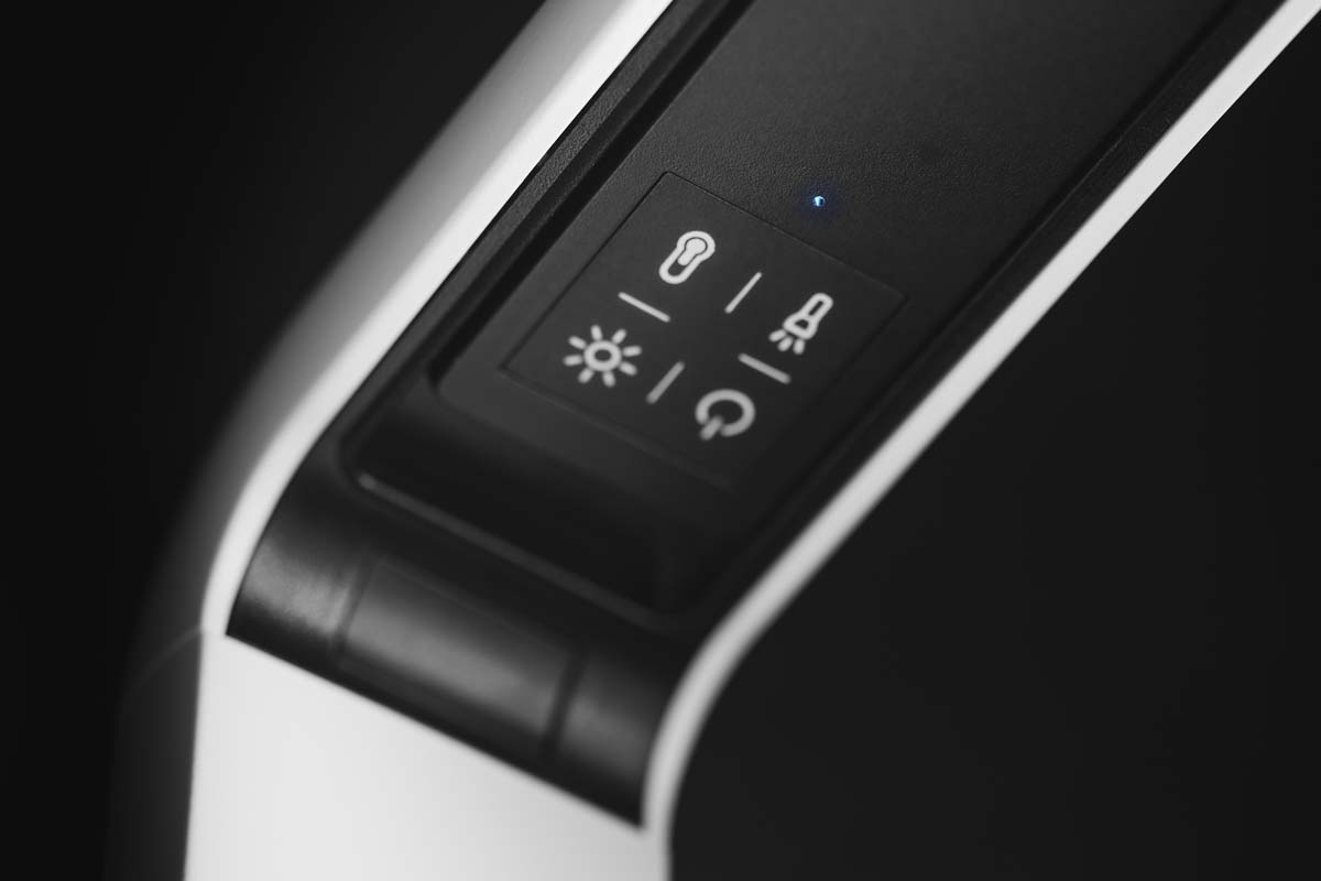Auf der Oberseite wartet ein schwarz mattiertes Bedienfeld mit eindeutiger Symbolbeschriftung darauf, dass man den UberLight Frame mit einem Fingertipp einschaltet, die Farbe wechselt, ihn dimmt … Das geht dank der auf der Unterseite eingeklipsten Fernbedienung, die ihren Mini-Akku lädt, solange sie nicht aus dem Rahmen genommen wird – auch, wenn man schon bequem im Hörsessel sitzt.