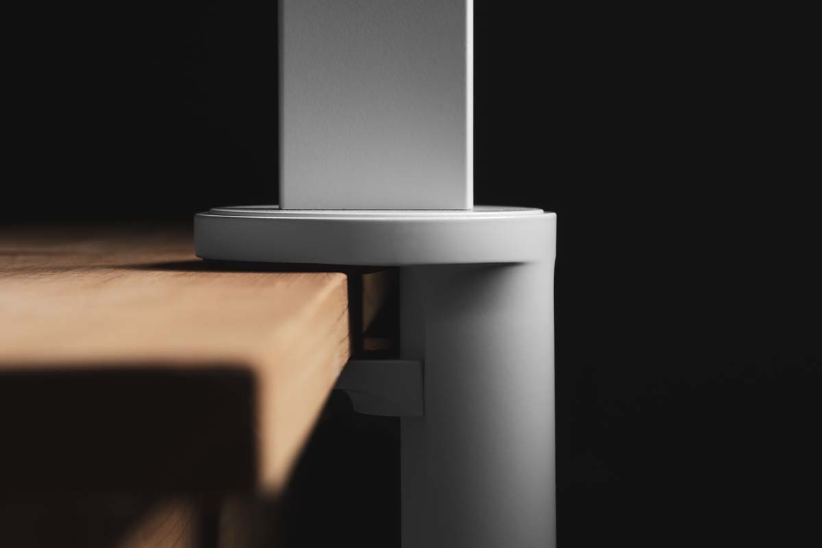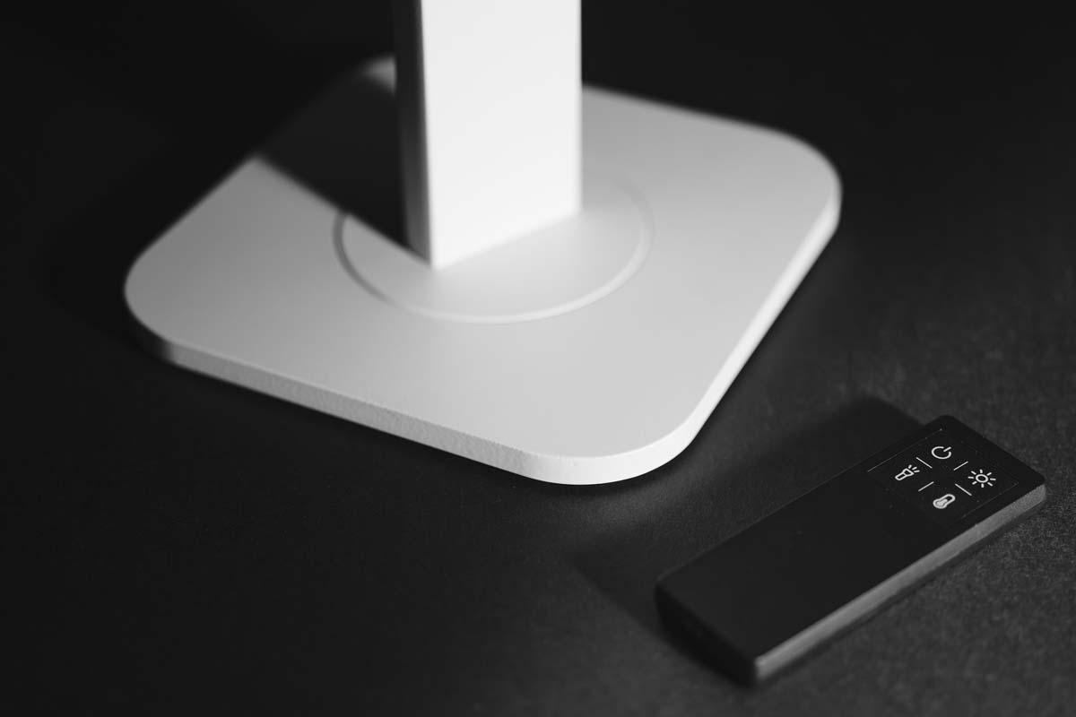 Denn in Sachen Befestigung und Aufstellung ist der UberLight Frame ein Musterbeispiel für elaborierte Ingenieurskunst. In dem großen und ziemlich schweren Paket finden sich Sockel unterschiedlicher Größen ebenso wie eine stabile Klemme zum Festschrauben an der Tischkante. Ich habe mich für die annähernd quadratische Bodenplatte entschieden, mit der der UberLight Frame – den Namen hat er von seiner Rahmenkonstruktion, die Bedienpanel, LED-Leuchtband und Mini-Fernbedienung elegant und stabil integriert – auf meinem „Axamo“ eines skandinavischen Möbelhauses stabil und sicher steht.