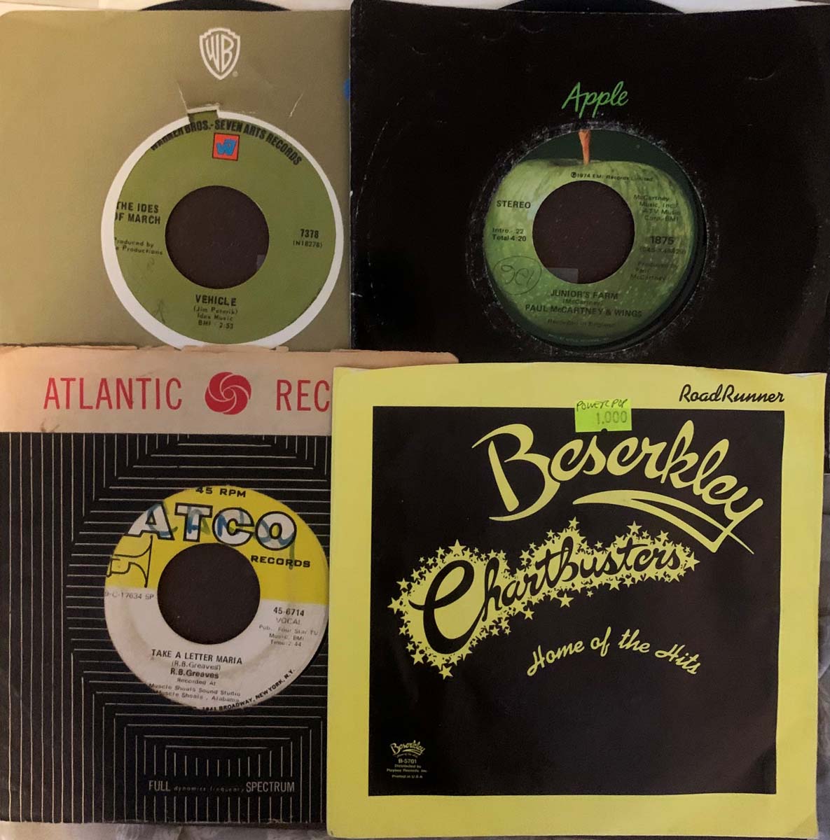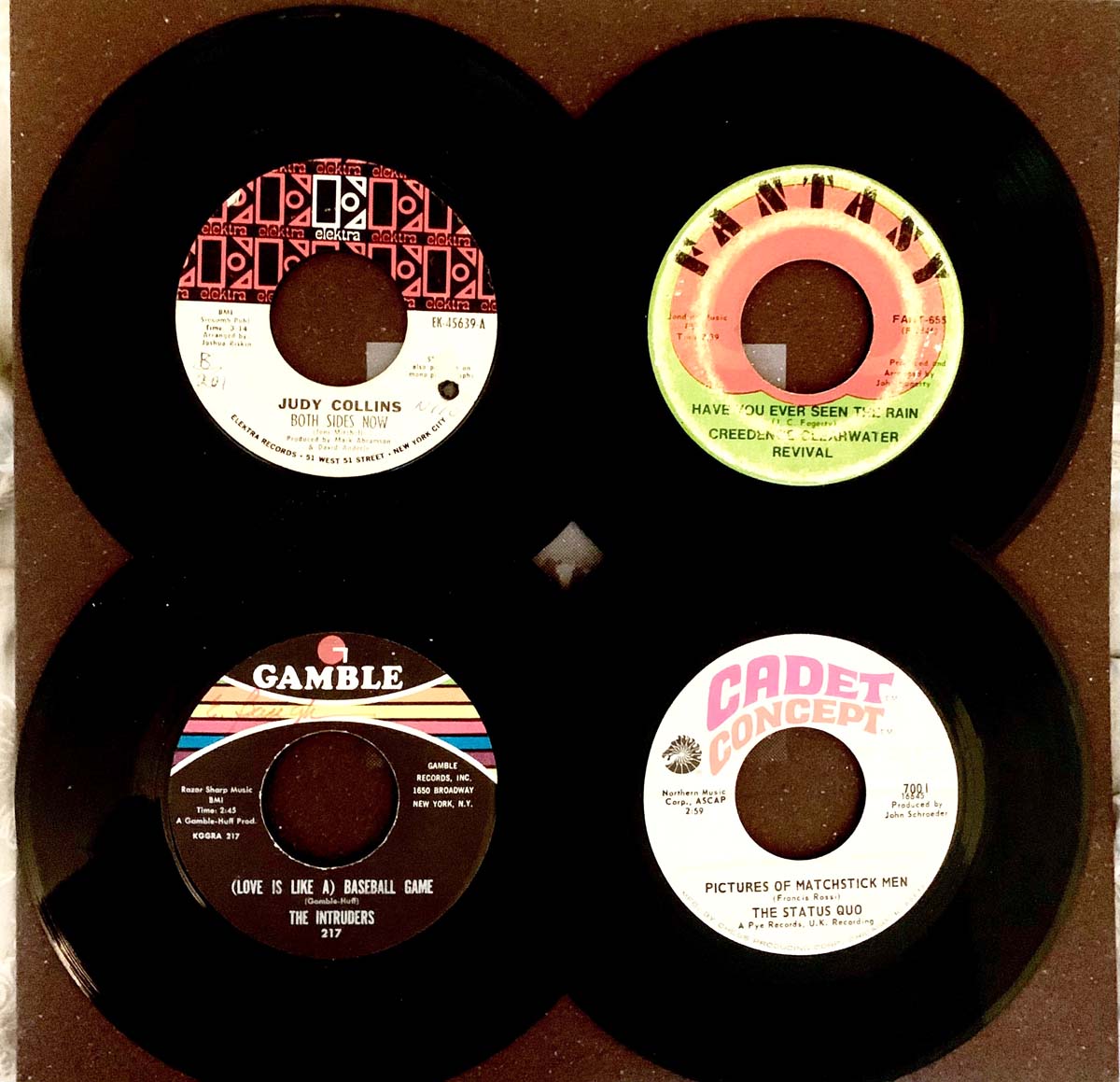 Nach mindestens einem Dutzend Fahrten, die mir in den nächsten neun Monaten einige hundert LPs eingebracht hatten, wandte ich mich schließlich den 50-Cent-Singles zu, die sich als wahre Fundgrube an heißgeliebten One-Hit-Wonders aus den 1960er bis 1970er Jahren für sehr vernünftiges Geld entpuppten. Hier nur einige Beispiele unter den Dutzenden, die ich an jenem Tag kaufte und die meinen eklektischen Geschmack widerspiegeln: Mungo Jerrys „In the Summertime“; Tommy Edwards’ „It’s All in the Game“; The Marmalades „Reflections of My Life“; The Angels’ „My Boyfriend’s Back“; The Idles of March’s „Vehicle“; The Status Quos „Pictures of Matchbook Men“; The Crazy World of Arthur Browns „Fire“; David Essex’s „Rock On“; Billy Swans „I Can Help“; Roy Head’s „One Night“; Kim Carnes’ „Bette Davis Eyes“; und Abba-Mitglied Fridas Solohit „Something Going On“.