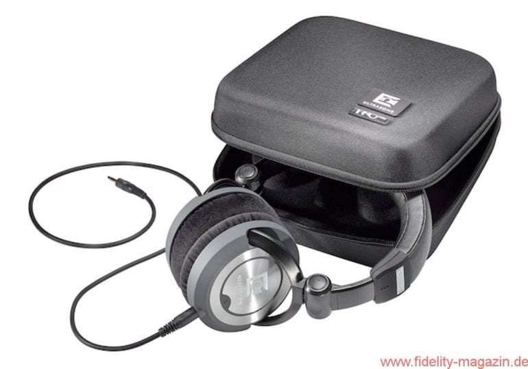 Der Anspruch des Ultrasone PRO 750i zeigt sich bereits im großzügigen Lieferumfang des hochwertigen Kopfhörers. Neben dem circa drei Meter langen Spiralkabel, das mit seinem 6,3 mm Klinkenstecker für den stationären Gebrauch prädestiniert ist, befindet sich darin auch ein circa 0,8 Meter langes Kabel mit 3,5 mm Klinkenstecker. Letzteres ist speziell für den mobilen Gebrauch konzipiert, beispielsweise an einem Notebook, Tablet oder Smartphone. Für den sicheren Transport wird die ebenso stylische wie stabile Pro Box mitgeliefert. Zusätzlich legt Ultrasone dem Kopfhörer ein zweites Paar Ohrpolster bei.