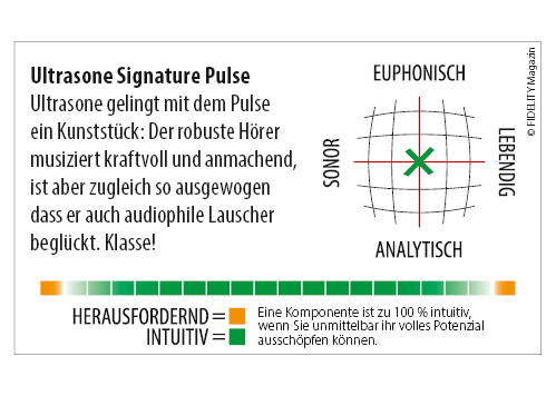 Ultrasone gelingt mit dem Signature Pulse ein Kunststück: Der robuste Hörer musiziert kraftvoll und anmachend, ist aber zugleich so ausgewogen dass er auch audiophile Lauscher beglückt. Klasse!