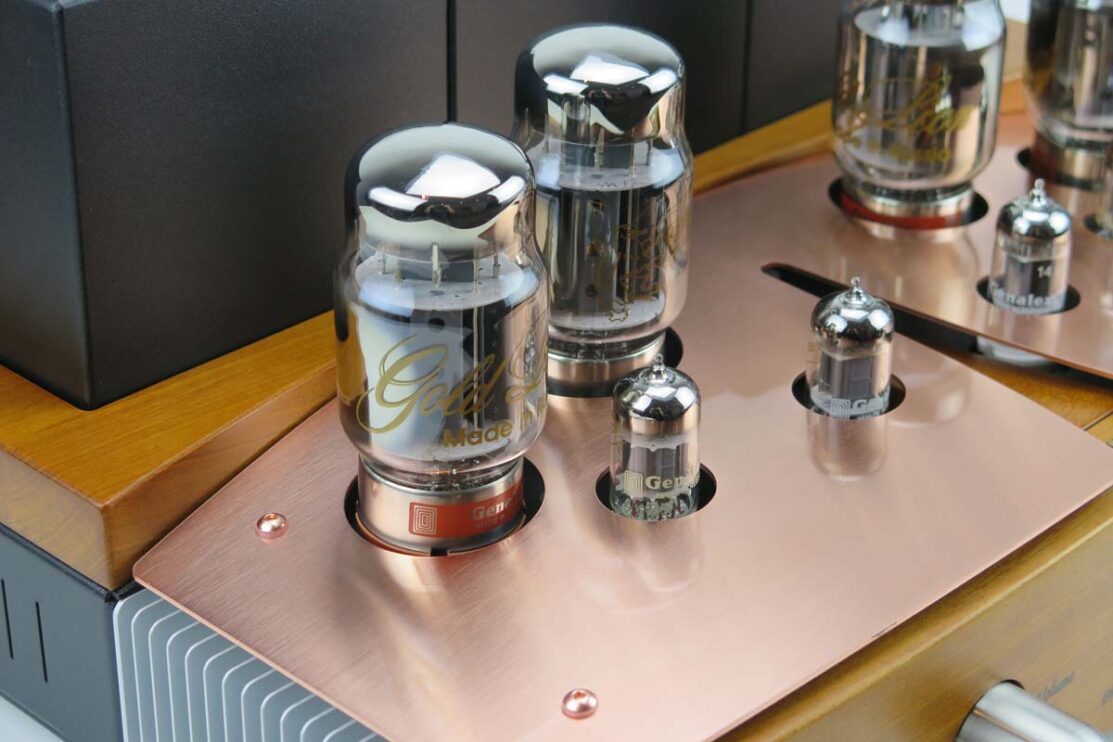 Röhren: 4 x KT88, 2 x ECC 82, 2 x ECC 83 (sämtlich Genalex Gold Lion, speziell selektiert)