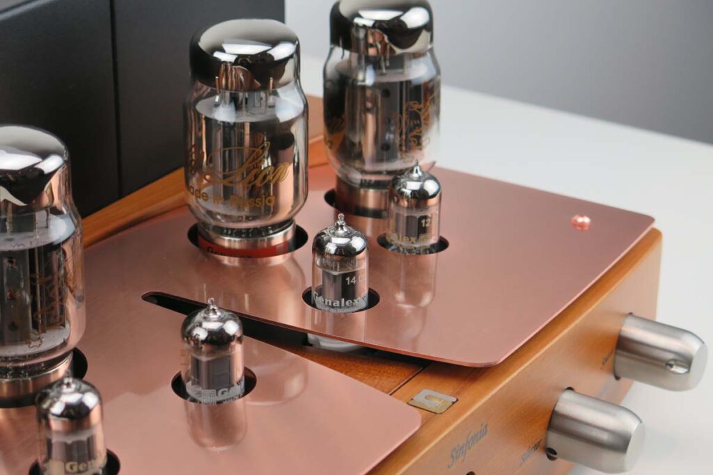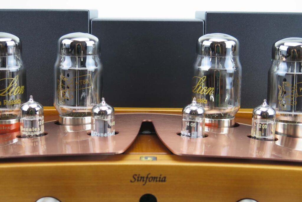 Genug der Schwelgerei, ich möchte zu den inneren Werten des Verstärkers kommen. Der Sinfonia Limited Edition Anniversary ist ein Röhren-Vollverstärker, der seine 27 Watt Ausgangsleistung im puren Class-A-Betrieb erzielt. Jeweils zwei KT88 Genalex Gold Lion pro Kanal in Single-ended-, Parallel-/Ultralinearschaltung sind hierfür zuständig. Diese stecken in Sockeln mit goldbeschichteten Kontakten. Die ECC82-Eingangsstufen und ECC83-Treiberstufen sind ebenfalls edle Genalex-Glaskolben. Sämtliche Röhren sind gematcht und streng selektiert. Im Signalweg werden ausschließlich hochwertige Mundorf-Kondensatoren verbaut. Um die gegenseitige Beeinflussung der Stereokanäle auszuschließen, ist die gesamte Schaltung in Dual-Mono-Bauweise konzipiert. So liegen im mittleren Trafoblock zwei Ringkerntrafos übereinander, die für die kanalgetrennte Stromversorgung zuständig sind.