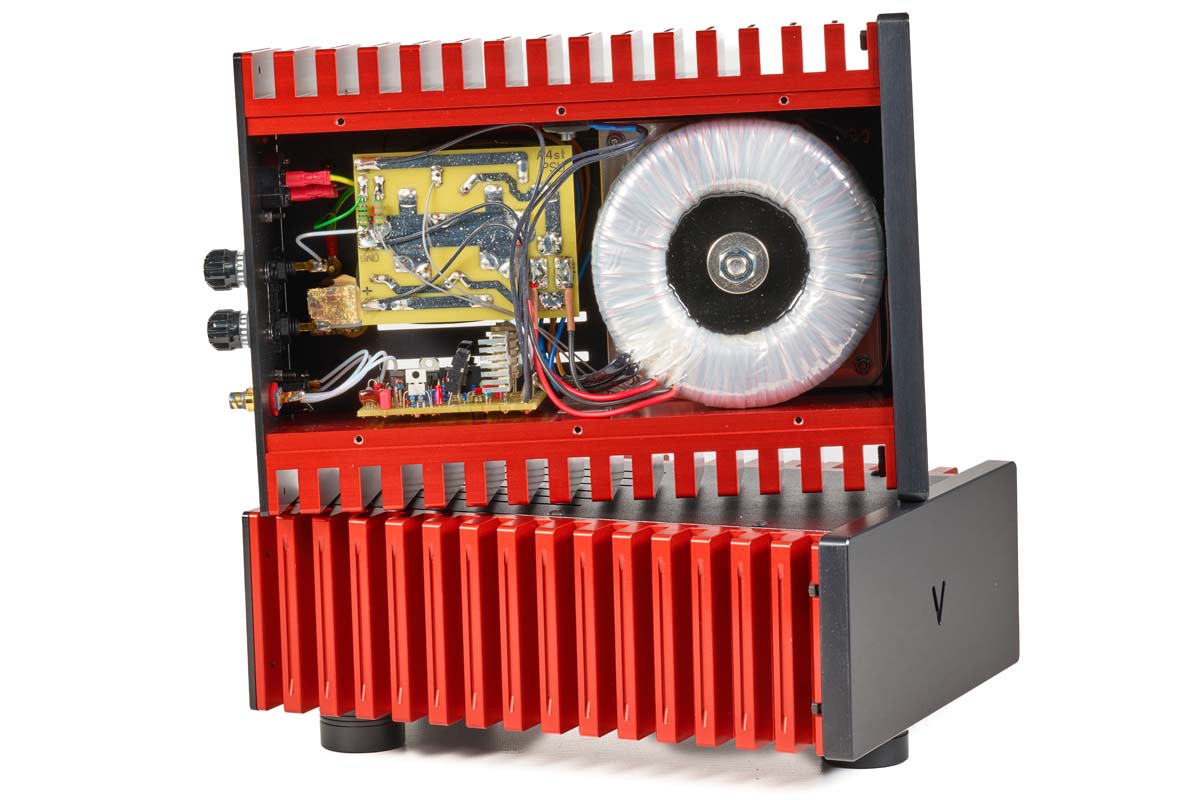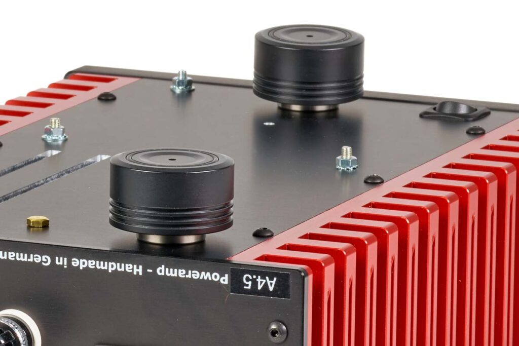 Als mir Monoendstufen als Testobjekte angekündigt wurden, schoss mir der Gedanke an ein Paket von wahrscheinlich 50 oder mehr Kilogramm und daraus resultierenden Rückenschmerzen durch den Kopf. Erleichtert stellte ich dann aber fest, dass es sich um handliche, wenn auch äußerst massive Endstufen von jeweils „nur“ 13 Kilo handelte. Schon bei der Installation machten die Valvet-Monoblöcke einen exzellenten Eindruck. Die perfekt verarbeiteten Gehäuse der Valvet A4.5 strotzen vor Solidität. Besonders die schwarz eloxierte, 15 Millimeter starke Aluminiumfront und die massiven Kühlrippen machen einen überzeugenden Eindruck. Letztere bilden die Flanken der kompakten Quader. Das seidig glänzende ziegelrote Eloxal verleiht ihnen eine pfiffig-elegante Note. An sich bin ich kein Freund von bunten HiFi-Gerätschaften, aber gerade mit dem in die Front eingefrästen und im Betrieb rot hinterleuchteten Valvet-„V“ finde ich das Design unwiderstehlich.