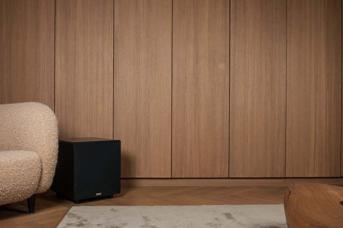 Damit die Leistung auch in gewohnt präziser Weise in Tiefton umgesetzt wird, müssen auch die Gehäuse genau abgestimmt sein: Die massive Front ist deshalb aus einer 21-lagigen Multiplex-Platte mit einer Materialstärke von ganzen 50 Millimetern gefertigt, um besonders niedrige Verzerrungswerte zu erreichen. Zudem sitzt die formschöne Treiberabdeckung fest und ohne Magnethalterung, damit das an- und abmontierbare Teil auch bei hohem Pegel an Ort und Stelle bleibt.