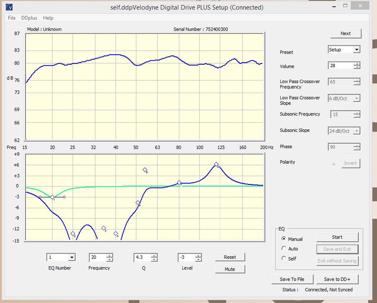 Die einfachste Version des Setups bietet die Funktion „Self-EQ“. Dazu wird das mitgelieferte Mikrofon eingesteckt, am Hörplatz aufgestellt und die Automatik aktiviert. Der Subwoofer erzeugt selbst die erforderlichen Sweeps, „hört“ über das Mikrofon, was im Raum ankommt, und errechnet Korrekturkurven. Das Ergebnis ist um Welten besser als die Presets, am Screenshot kann man sehen, dass hier an einigen Rädern gedreht wurde. Der Raum ist nun mit einbezogen, an bösen Resonanzen nimmt sich der Sub zurück, unterfüttert dafür andere Bereiche.
