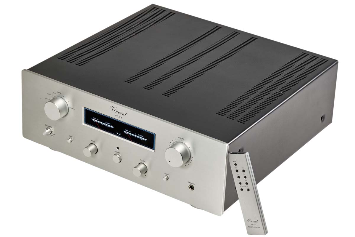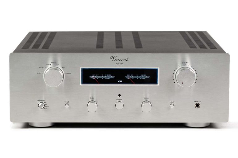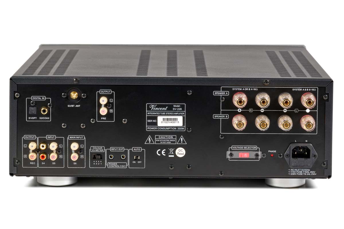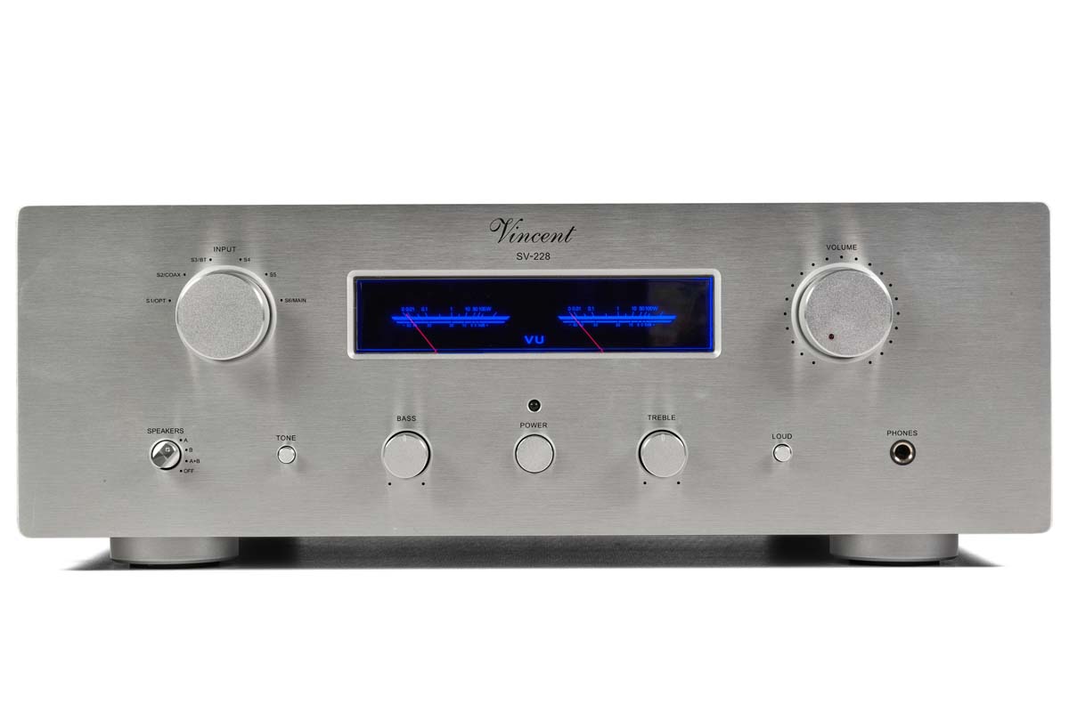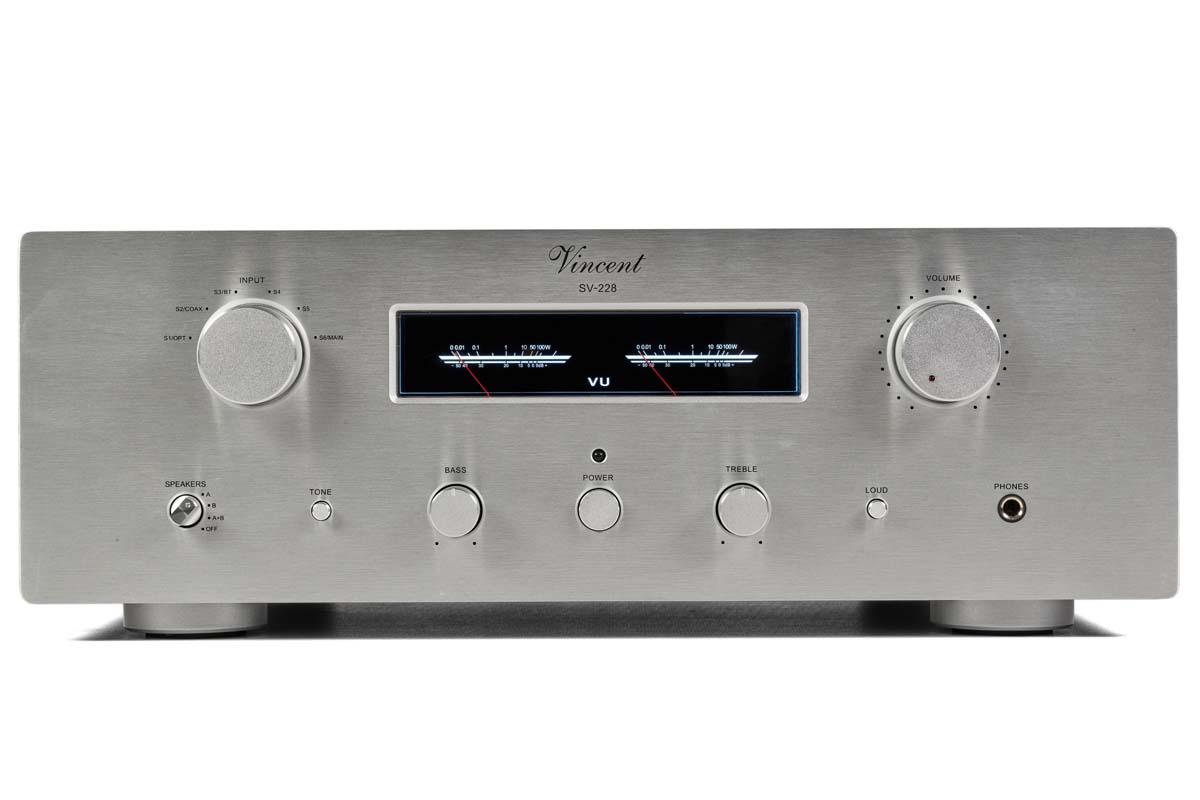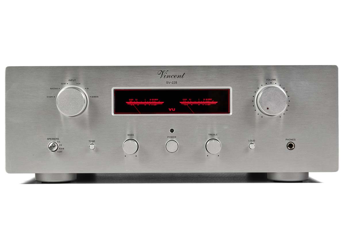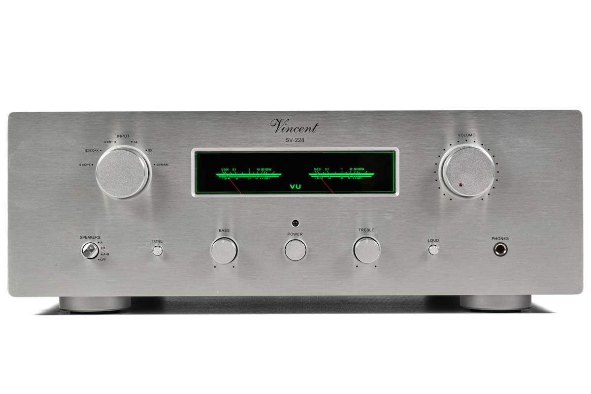 Der SV-228 gehört zur „powerLine“ der deutschen Marke mit fernöstlicher Fertigung. Entwickelt wird seit der Gründung des Unternehmens im Jahre 1995 in Deutschland. Das gilt auch auch für den jüngsten Vollverstärker der SV-22x-Linie. Der Vorgänger SV-227 MK erinnerte mit seinem klassischen Design an hochwertige Verstärker der 80er und 90er Jahre. Der Nachfolger hat zwar die Bedienelemente beibehalten, mit den neu hinzugekommenen, farbig hinterleuchteten VU-Metern auf der Frontplatte wirkt er aber ungleich hochwertiger. Und auch im Inneren hat sich der Vincent weiterentwickelt. So sind die drei 12AX7-Röhren in der Vorstufe des Vorgängers einer Kombination aus einer 6N4-Doppeltriode und zwei ECC82-Doppeltrioden von JJ für die Vorverstärkung des Signals gewichen.