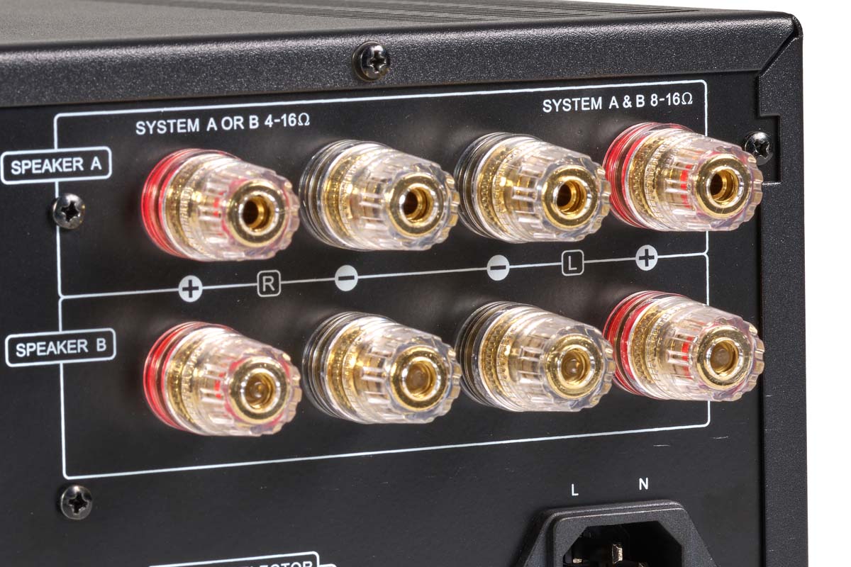 Ausgänge: 1 x Cinch (Record Out), 1 x Cinch (Vorstufenausgang), 2 Paar Lautsprecherbuchsen (paarweise schaltbar)