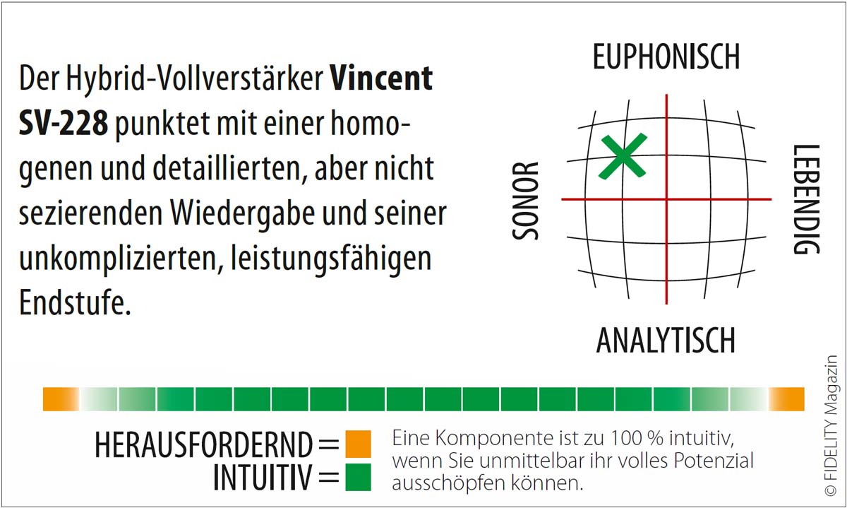 Der Hybrid-Vollverstärker Vincent SV-228 punktet mit einer homogenen und detaillierten, aber nicht sezierenden Wiedergabe und seiner unkomplizierten, leistungsfähigen Endstufe.