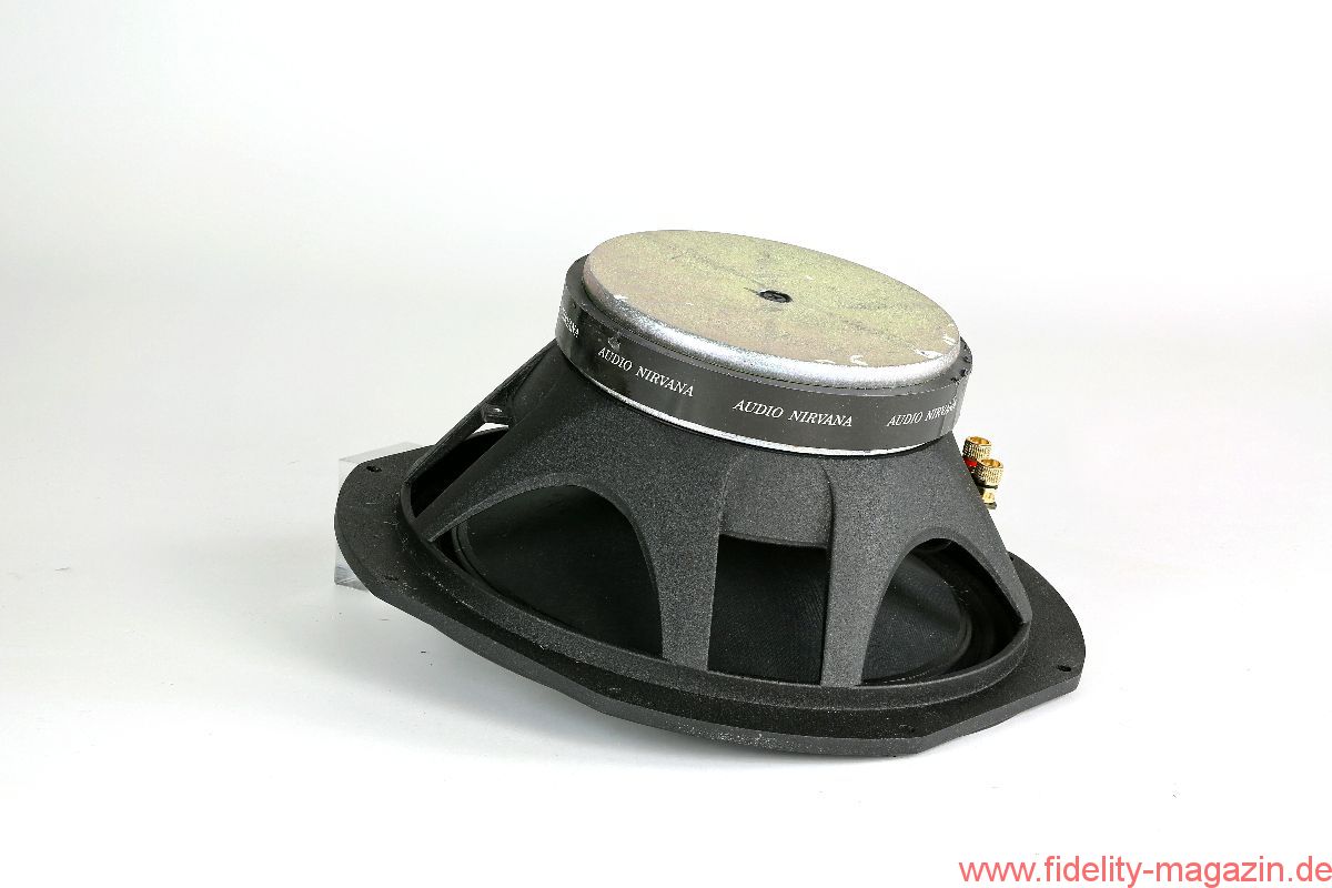 Betrachtet man die neue Vivo aber genauer, fällt eine gesteigerte Gehäusequalität auf. Furnierkanten verlaufen exemplarisch sauber, das Chassis sitzt auf einer exakt gearbeiteten Fräsung. Obwohl die Feinarbeit hier gar nicht nötig gewesen wäre, denn der Chassiskorb greift über die Kante hinaus und deckt sie somit ab. Außerdem ist die Vivo – ungewöhnlich für solche Konstrukte – richtig schwer, was auf ein komplexes Innenleben schließen lässt. Tim Hoffmann, der Vivo-Experte bei TCG, steht mir dazu Rede und Antwort. Es sind die Materialstärken, die das Gewicht in die Höhe treiben. Denn im Inneren gibt es neben konventionellem Dämmmaterial an den Wänden nur kleine Streben, um die Stabilität zu erhöhen. Ansonsten ist die Vivo V-20 eine schlichte Kiste – nur eben in besonders solider Ausführung. Einzig das in Baumwolle gewickelte Solid-Core-Kabel fällt noch auf. Ein kleiner Saugkreis – nur aus einem Widerstand, einer Spule und einem Kondensator bestehend – sitzt direkt hinter dem vergoldeten, massiven Terminal. Bei dem schon erwähnten, 25 Zentimeter durchmessenden Breitbänder handelt es sich um ein Modell des US-amerikanischen Breitband-Großhändlers Commonsense Audio (Hausmarke: Audio Nirvana), das schon von der Papierform her recht interessant und beileibe kein Billigheimer ist.