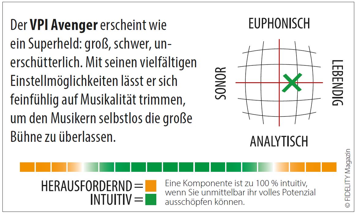 Der VPI Avenger erscheint wie ein Superheld: groß, schwer, unerschütterlich. Mit seinen vielfältigen Einstellmöglichkeiten lässt er sich feinfühlig auf Musikalität trimmen, um den Musikern selbstlos die große Bühne zu überlassen.