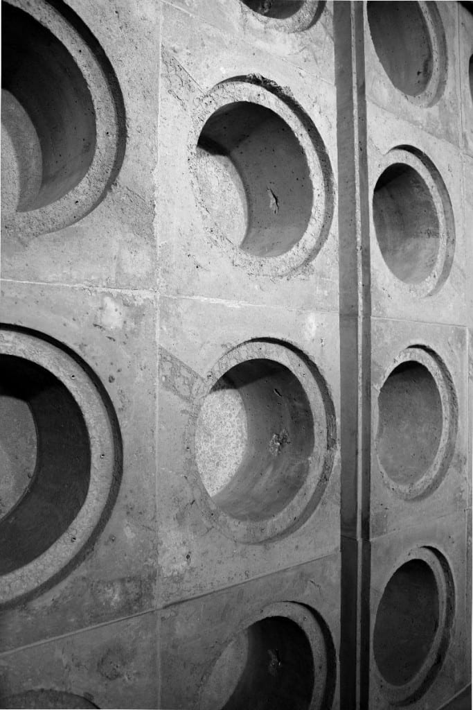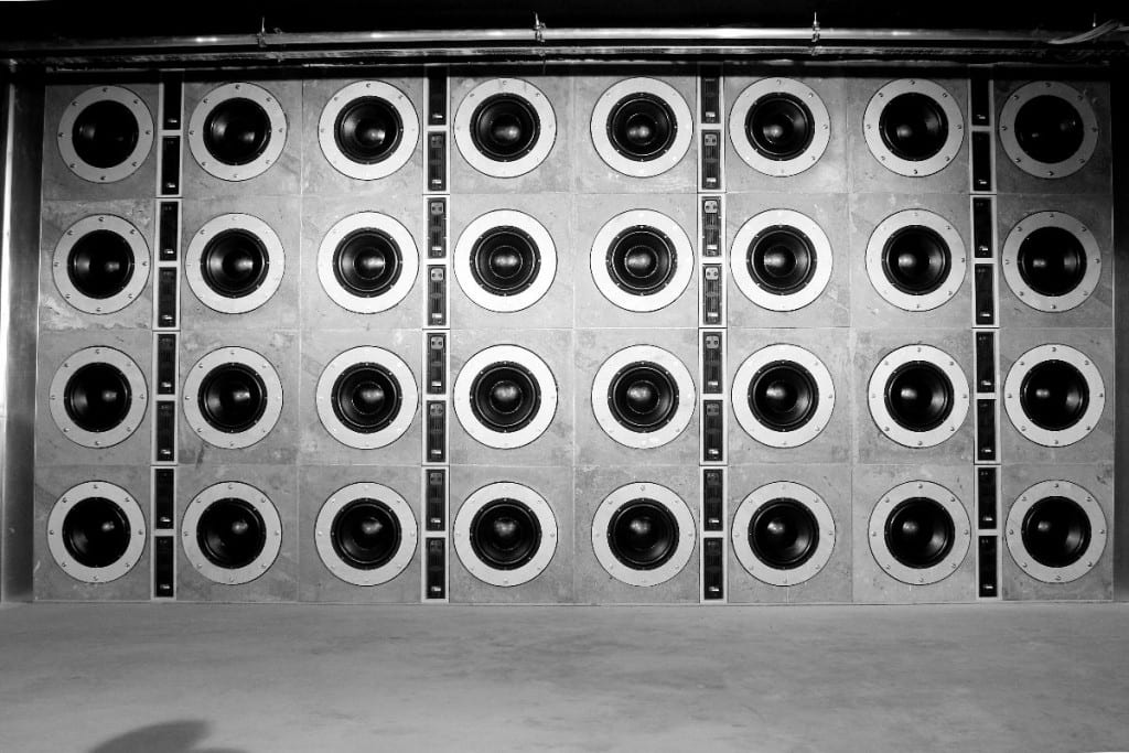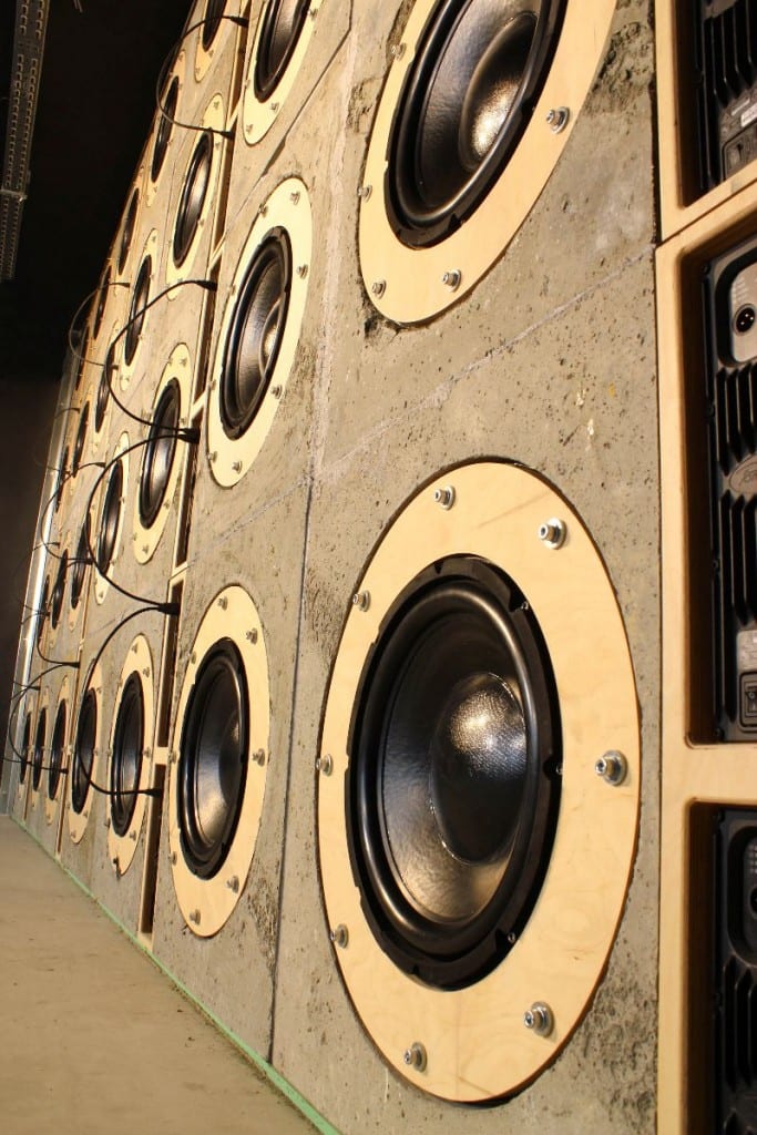 Each concrete block serves as loudspeaker enclosure with pressure-resistant rear chamber which implements the perfect impulse response of a ‘closed-box’ design and maximizes the radiation resistance of the woofers through the acoustically hard surface. A self-enveloped 15″ speaker was produced and adapted to the unusual demands of this project. The single chassis are designed to act together like one single swinging wall — in a similar principle to a piston in a cylinder.
