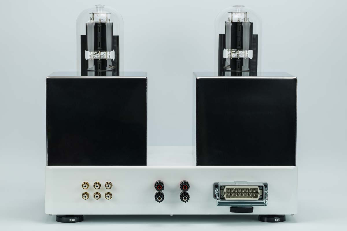 Der Gaia ist kein Verstärker, der sich unauffällig in eine Anlage einfügt. Er beansprucht Raum, optisch wie physisch. Die massiven Röhren stehen in vergoldeten Sockeln, spiegeln sich in den verchromten Gehäusen der dahinterliegenden Ausgangsübertrager und lassen keinen Zweifel daran, dass hier ernsthafte Technik am Werk ist. Das Gehäuse besteht aus einem sauber verarbeiteten, aus dem Vollen gefrästen Aluminiumblock mit schön lackierter Oberfläche und ruht auf hochwertigen SSC-Gerätefüßen. Auch bei den Anschlüssen hat man nicht gespart: Die Cinch- und Lautsprecherklemmen stammen von WBT. Keine Designspielerei, keine Effekthascherei, sondern solide Präzision.