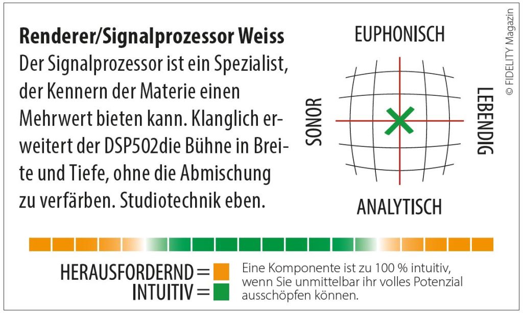 Der Signalprozessor von Weiss ist ein Spezialist, der Kennern der Materie einen Mehrwert bietet. Klanglich erweitert der DSP502die Bühne in Breite und Tiefe, ohne die Abmischung zu verfärben. Studiotechnik eben.