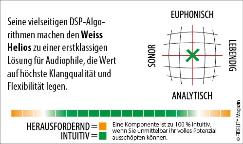 Seine vielseitigen DSP-Algorithmen machen den Weiss Helios zu einer erstklassigen Lösung für Audiophile, die Wert auf höchste Klangqualität und Flexibilität legen.