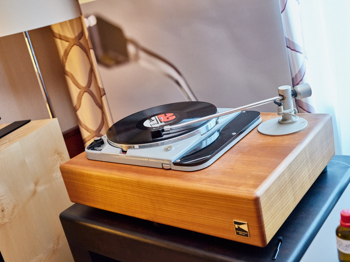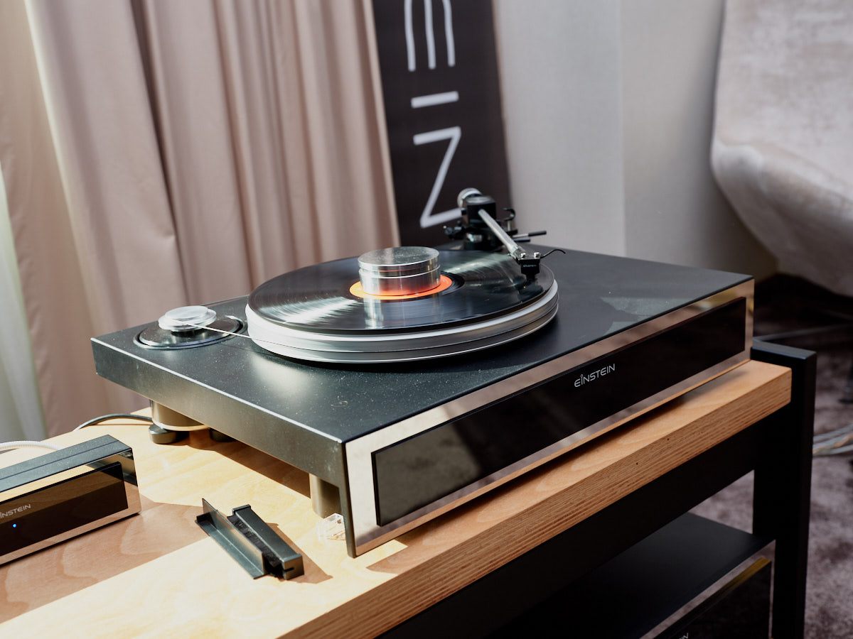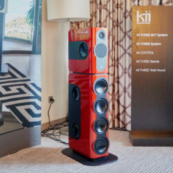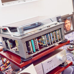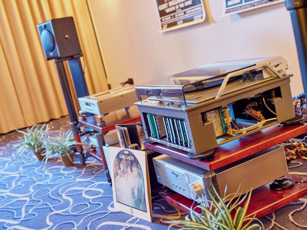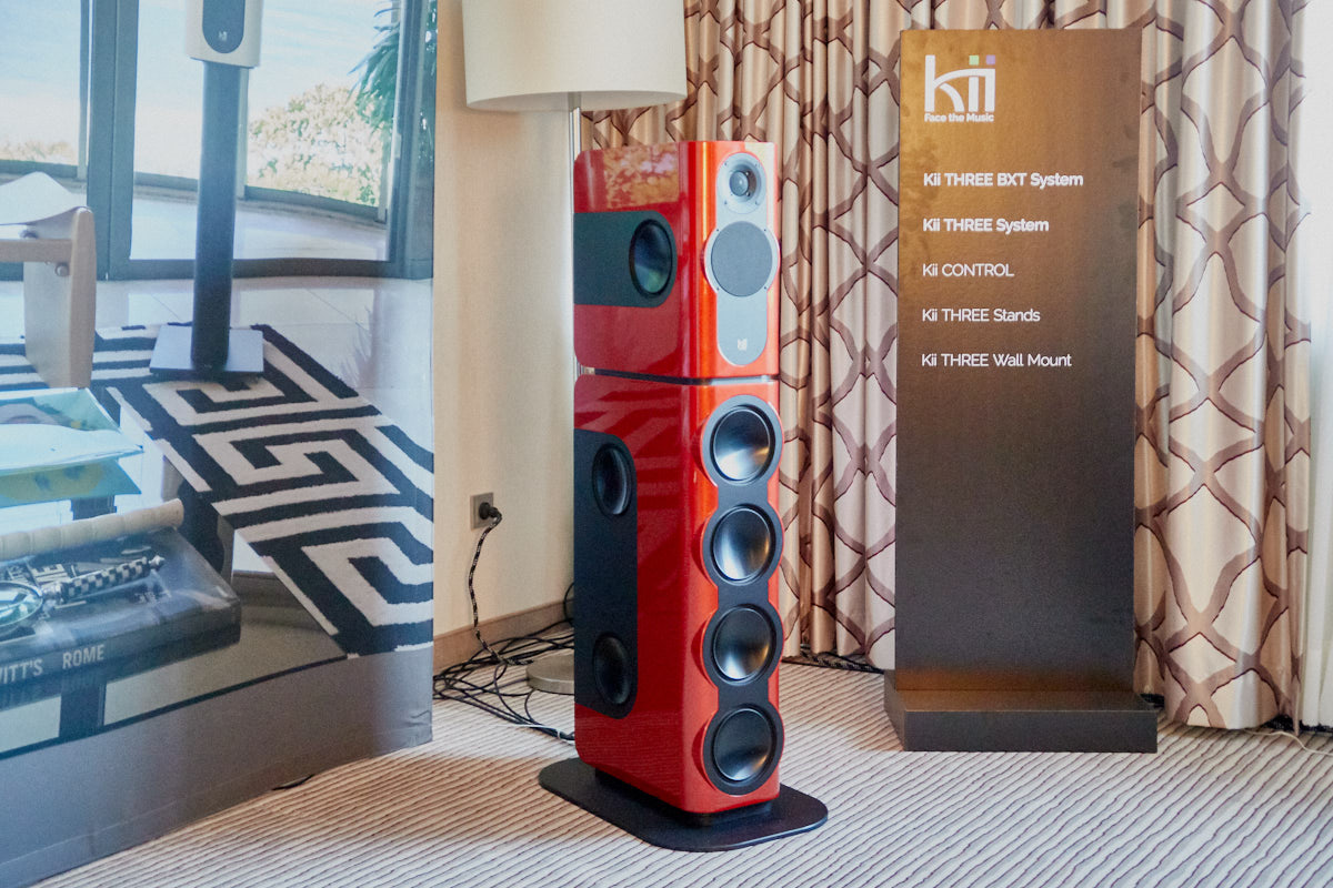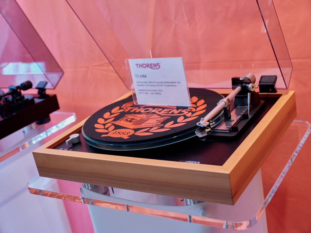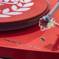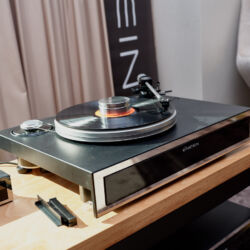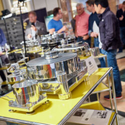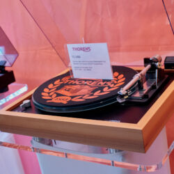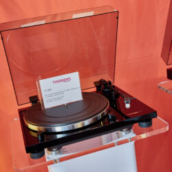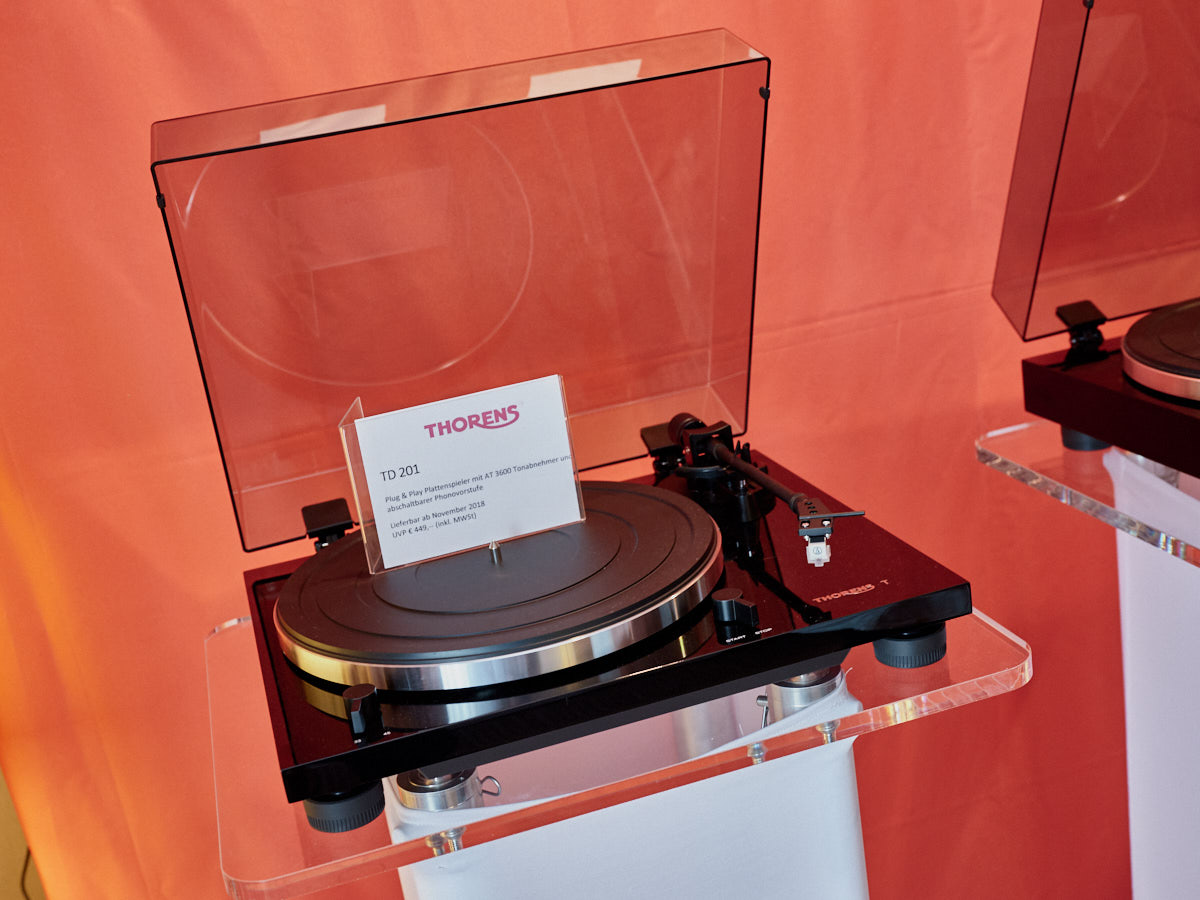 Ein weiteres Highlight war (wie bereits vor einigen Wochen auf den Süddeutschen HiFi-Tagen in Stuttgart) die Kette von Kii Audio. Für den Hersteller mit Sitz in Bergisch Gladbach war die Veranstaltung gewissermaßen ein Heimspiel. Dem erhabenen Aktivmonitor „Three“, kraftvoll begleitet von dessen neuer Tieftonerweiterung „BXT“, diente ein Thorens TD 550 als Zuspieler. Gemeinsam gelang den Komponenten eine der schwungvollsten und mitreißendsten Demonstrationen der Show. Die mittlerweile ebenfalls im Bergischen ansässigen Analog-Profis von Thorens nutzen die Show, um gleich noch ein paar Neuheiten vorzustellen: Im Ausstellungszimmer eine Tür weiter entdeckten wir unter anderem den kleinen TD 220, der für knapp 600 Euro Vinyl mit einem integrierten Phono-Entzerrer und USB kombiniert. Er kann also eingesetzt werden, um Schallplatten in einen Computer zu digitalisieren. Über einen rückwärtigen Schalter lässt sich die Elektronik vollständig deaktivieren.