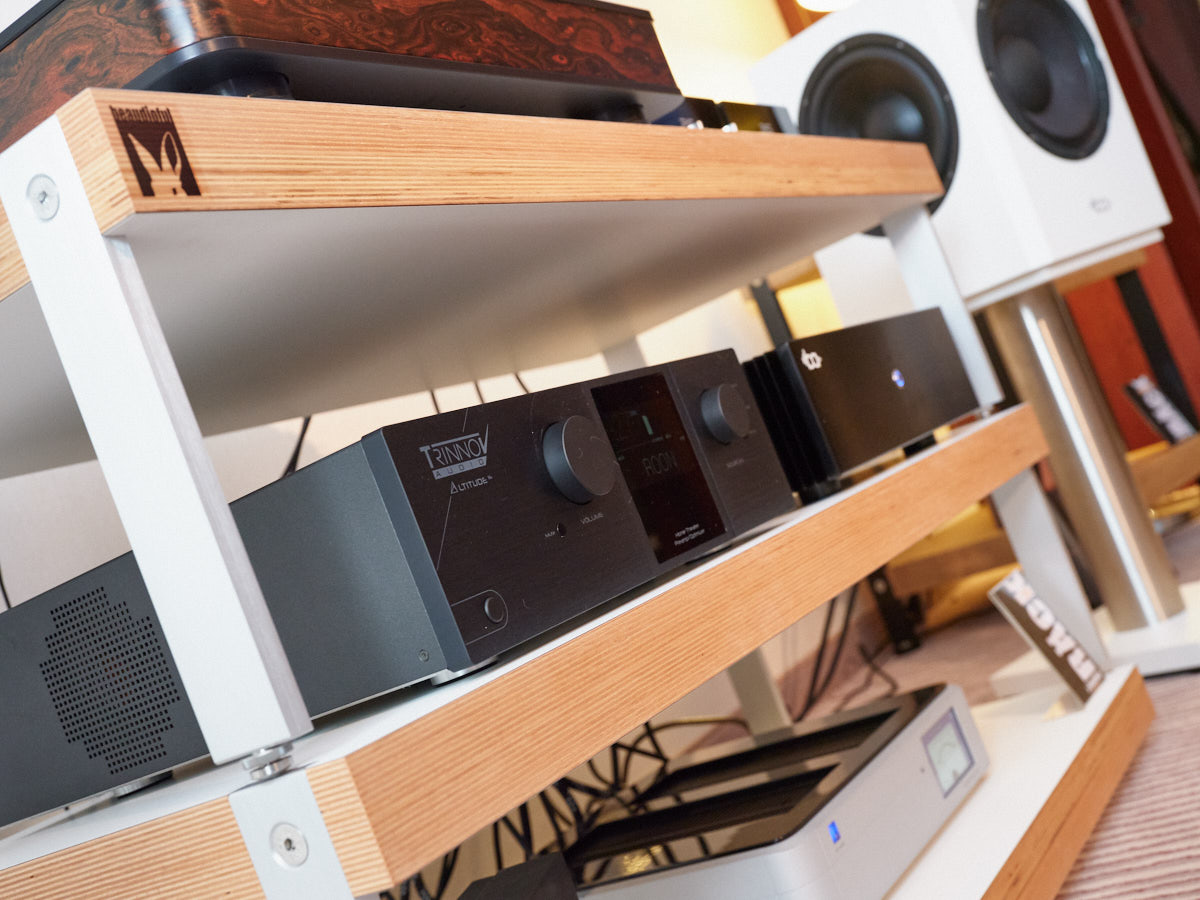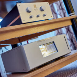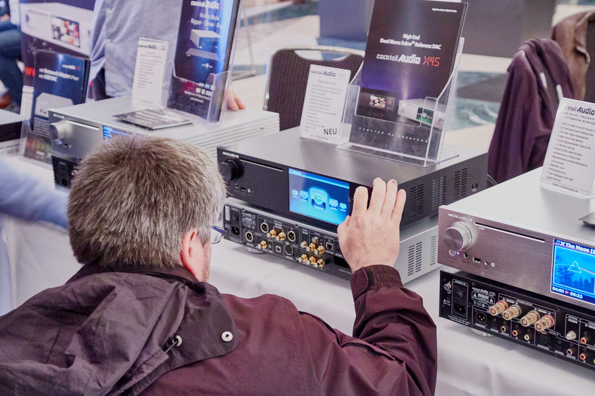 Thorens war allerdings nicht der einzige Aussteller, der auf den WDHT Premieren im Handgepäck hatte. Neben der gewohnt farbenfrohen Ausstellung unzähliger Pro-Ject-Dreher zeigte der Mülheimer Audiotrade-Vertrieb zwei neue Stax-Kopfhörerverstärker, den kompakten SRM-D10 (um 1000 Euro) für den mobilen und den größeren SRM-D50 (um 1350 Euro) für den stationären Einsatz. Beide Modelle besitzen integrierte D/A-Wandler, stellen im Sortiment der Japaner also ein Novum dar. Ergänzend gesellt sich mit dem SR-009S (um 5250 Euro) ein neuer Top-Lauscher hinzu, den man auf der Messe – wie übrigens alle Neuheiten – direkt ausprobieren durfte. Im selben Saal zeigte Cocktail Audio sein neues „Schweizer Offizierstaschenmesser“ X45, ein Musik-Server mit integrierten Endstufen und zahllosen Fähigkeiten, die sich via App oder über das riesige Display am Gehäuse steuern lassen.