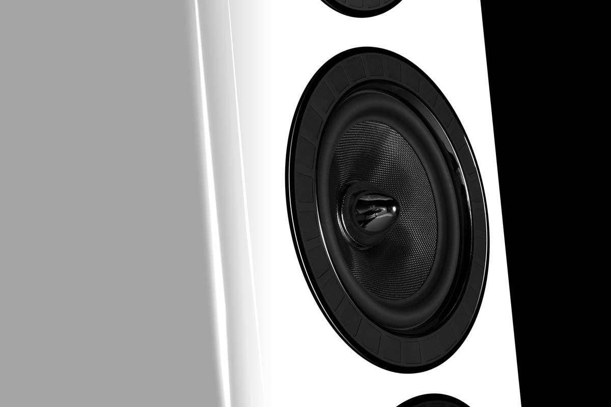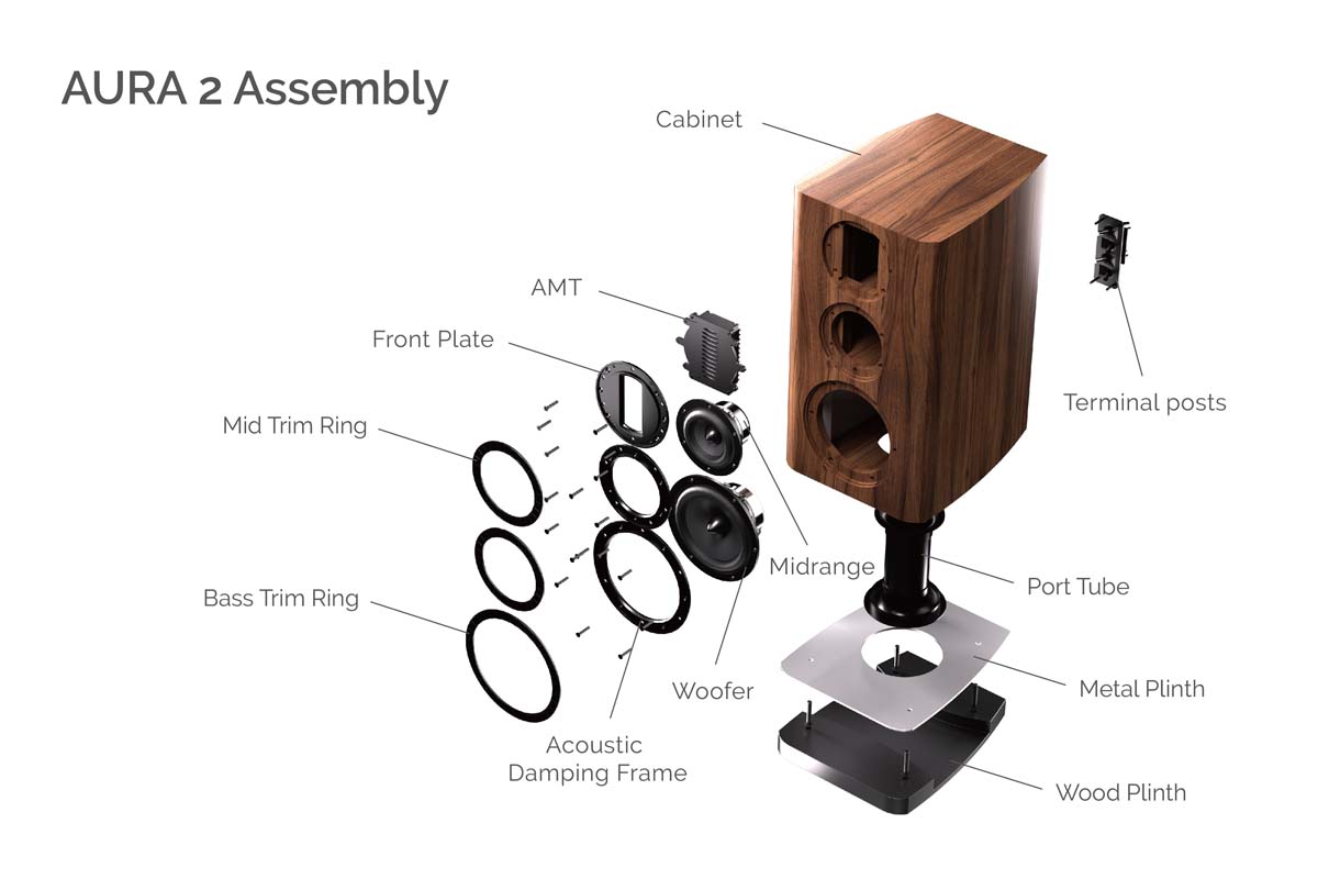 Die Gehäuse der Aura-Lautsprecher sind optisch ebenso ansprechend wie die Technologie, die sich in ihnen verbirgt. Jedes der in Schwarz, Weiß und einem Nussbaum-Naturholzfurnier erhältlichen Gehäuse wird lackiert und poliert, um ein wunderschönes Möbelstück zu präsentieren. Die sanften Rundungen des Gehäuses sind mehr als nur ein Blickfang. Sie tragen dazu bei, dass die akustische Leistung der Chassis gleichmäßig in den Raum abgegeben wird, ohne unerwünschte Reflexionen durch scharfe Kanten. Es werden mehrere Schichten unterschiedlicher Hölzer genutzt, um die Resonanz der Paneele zu reduzieren. Diese mehrschichtige Konstruktion, PROS (Panel Resonance Optimisation System), hat noch einen weiteren Vorteil – sie verhindert das Austreten unerwünschter Schallenergie aus dem Inneren des Gehäuses, die sonst die Impulswiedergabe der Chassis stören würde.