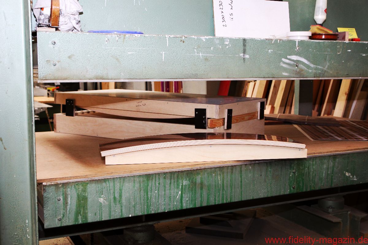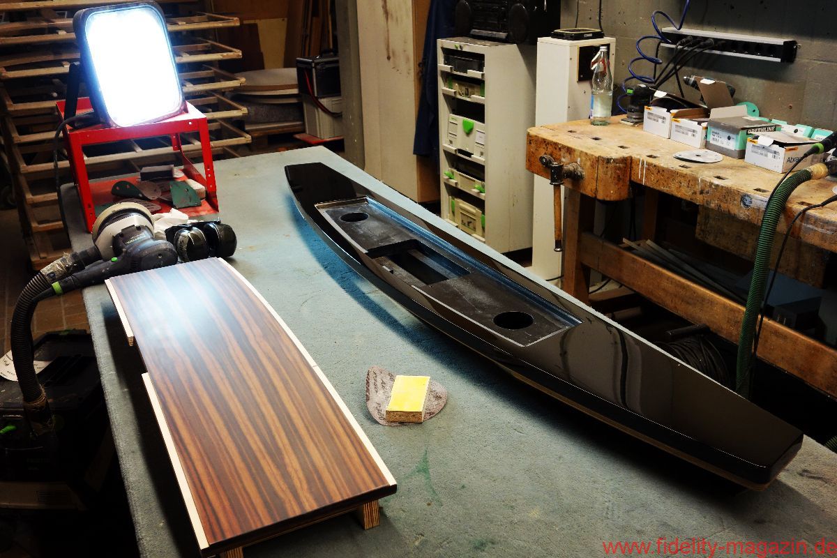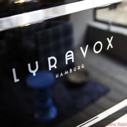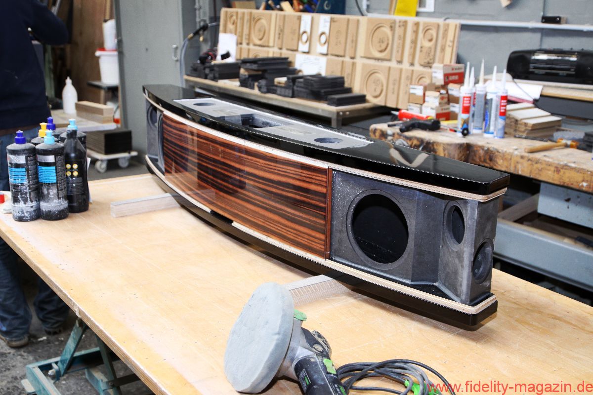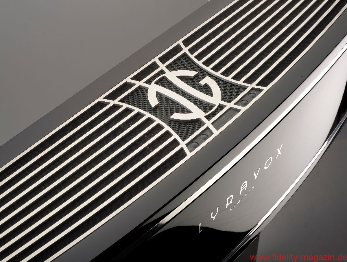 Auch das äußere Erscheinungsbild folgt den High-End-Ansprüchen der Entwickler. Optisch ist die Art-déco-Formensprache eine Hommage an die Ära der Radios und Musiktruhen der Goldenen Zwanziger Jahre. Auch die Gestaltung des Logos „Lyravox Hamburg“ ist dieser Zeit entlehnt und verdeutlicht, wofür die Marke steht: Tradition, deutsche Handarbeit, Zeitlosigkeit und Qualität. „Hamburg ist auch Teil des Logos, denn Lyravox steht auch für hanseatische Werte und für Dinge, für die Hamburg weltweit bekannt ist, zum Beispiel für Musik oder handwerkliche Produkte“, sagt von Laffert. „Wir sind bekennende Hamburg-Fans, wir lieben die Stadt, in der wir leben“, ergänzt Wietschorke. Und tatsächlich könnte auf dem Lautsprecher eigentlich auch „made in Hamburg“ stehen. Ein Hamburger Schreiner leimt die geschwungene Front Schicht für Schicht zusammen und überzieht das Furnier schließlich mit unzähligen Schichten Klavierlack, dessen finale Politur allein schon zwei Arbeitstage in Anspruch nimmt. Auch das Logo und die weiteren Metallkomponenten kommen aus der Hansestadt und sind ebenso hochwertig und individualisierbar wie Furnier und Lack, die es in zahlreichen Varianten gibt. In der eigenen Werkstatt übernimmt Lyravox dann die Endmontage.