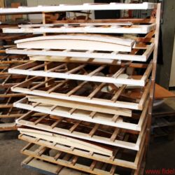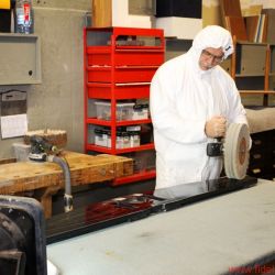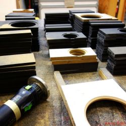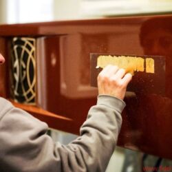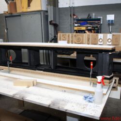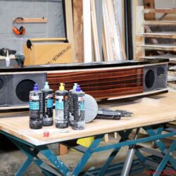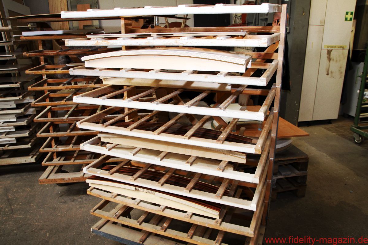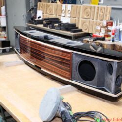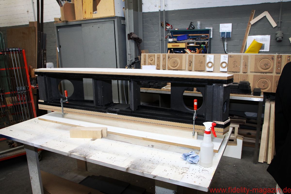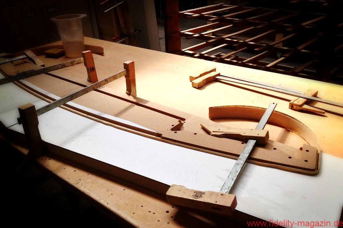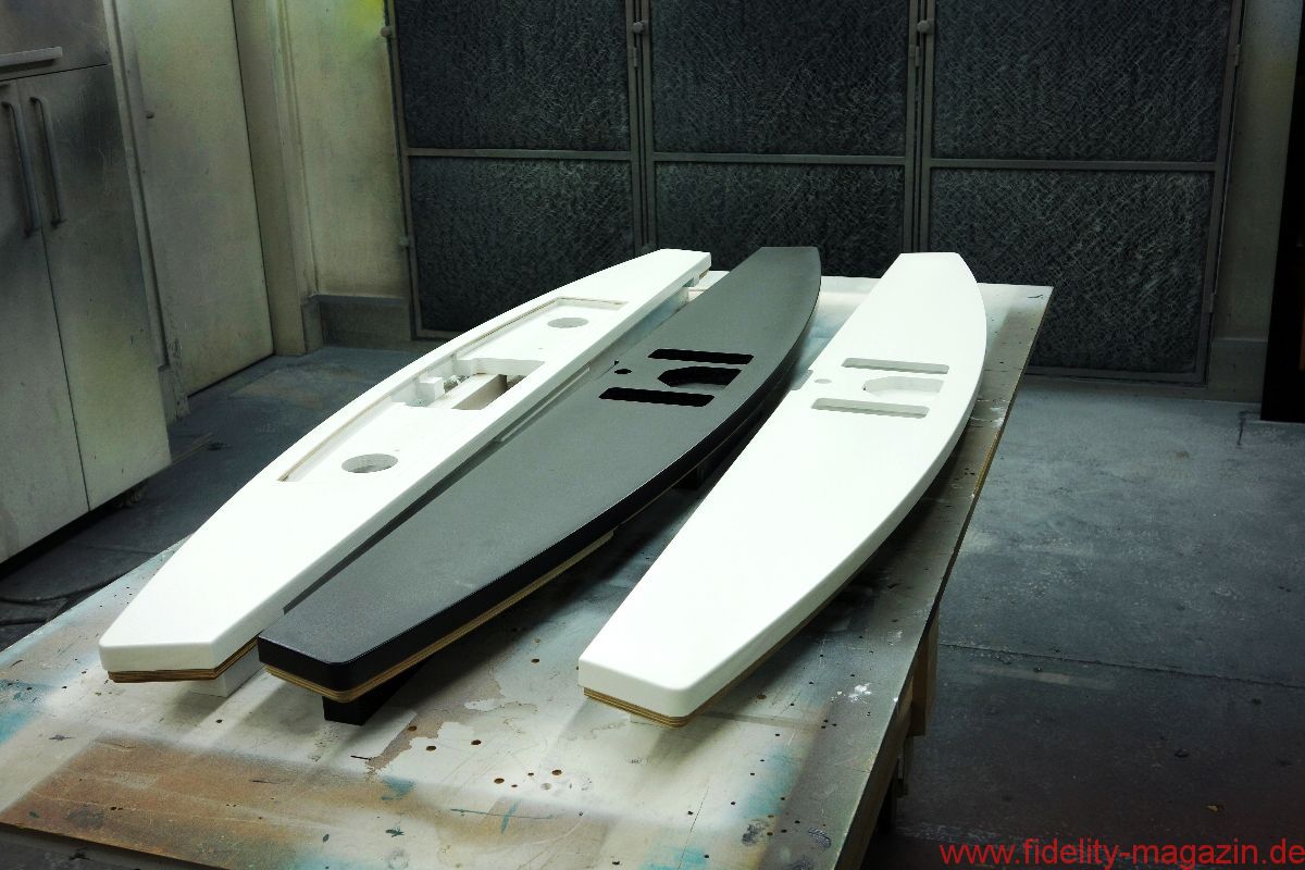 Auch das äußere Erscheinungsbild folgt den High-End-Ansprüchen der Entwickler. Optisch ist die Art-déco-Formensprache eine Hommage an die Ära der Radios und Musiktruhen der Goldenen Zwanziger Jahre. Auch die Gestaltung des Logos „Lyravox Hamburg“ ist dieser Zeit entlehnt und verdeutlicht, wofür die Marke steht: Tradition, deutsche Handarbeit, Zeitlosigkeit und Qualität. „Hamburg ist auch Teil des Logos, denn Lyravox steht auch für hanseatische Werte und für Dinge, für die Hamburg weltweit bekannt ist, zum Beispiel für Musik oder handwerkliche Produkte“, sagt von Laffert. „Wir sind bekennende Hamburg-Fans, wir lieben die Stadt, in der wir leben“, ergänzt Wietschorke. Und tatsächlich könnte auf dem Lautsprecher eigentlich auch „made in Hamburg“ stehen. Ein Hamburger Schreiner leimt die geschwungene Front Schicht für Schicht zusammen und überzieht das Furnier schließlich mit unzähligen Schichten Klavierlack, dessen finale Politur allein schon zwei Arbeitstage in Anspruch nimmt. Auch das Logo und die weiteren Metallkomponenten kommen aus der Hansestadt und sind ebenso hochwertig und individualisierbar wie Furnier und Lack, die es in zahlreichen Varianten gibt. In der eigenen Werkstatt übernimmt Lyravox dann die Endmontage.