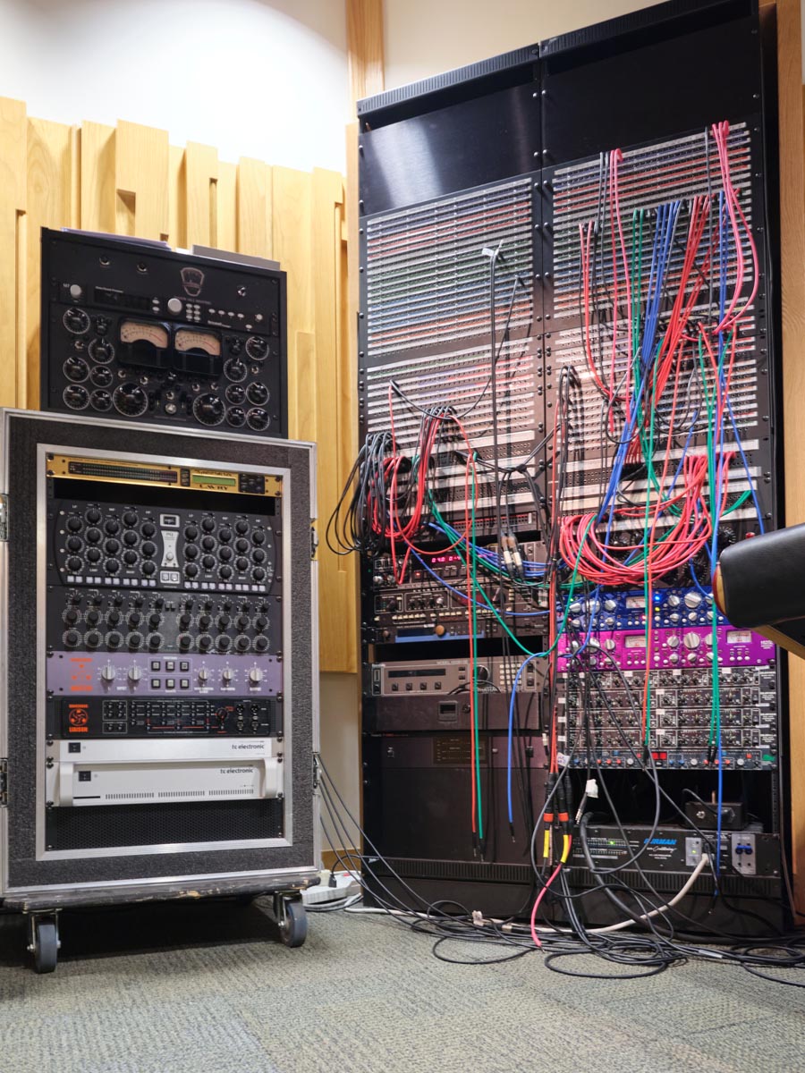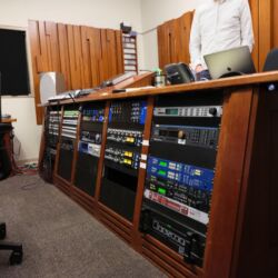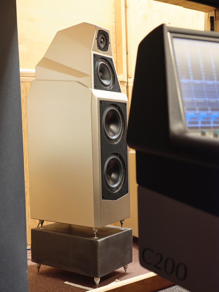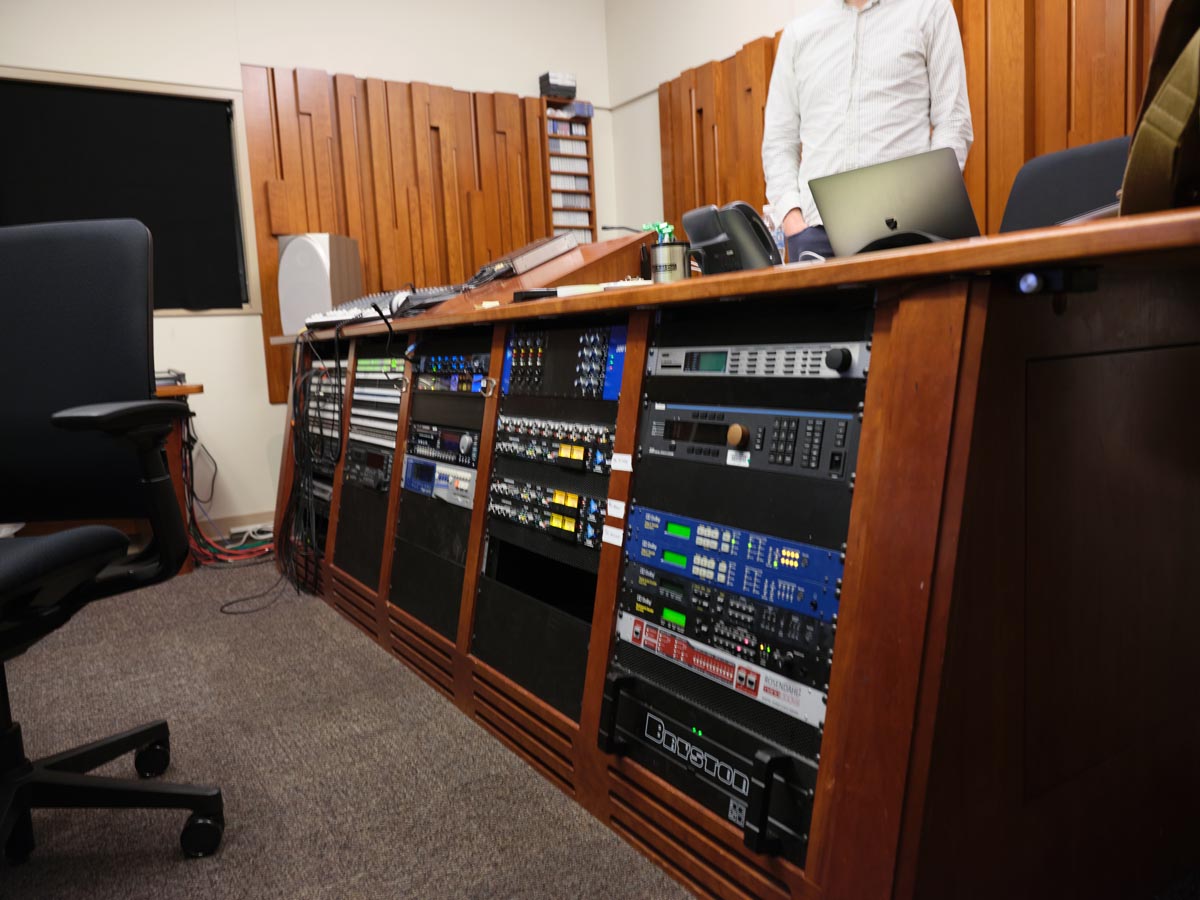 Die Audio-Profis aus der unmittelbaren Nachbarschaft sorgten für einen Qualitätssprung, der dieses Studio entscheidend von der weltweiten Masse unterscheidet: Als Frontlautsprecher der ersten Regie, die den Saalton einfängt, verwenden Trent Walker und sein Team unter anderem die Wilson Audio Sasha, deren absolute Neutralität auch der FIDELITY-Redaktion eine große Hilfe ist, wenn die Talente angeschlossener Komponenten auf dem Prüfstand stehen – die wohl nobelste Variante eines Abhörmonitors. Im Verbund mit Verstärkerelektronik von Bryston dienen die Wilsons dem Toningenieur Trent Walker als unbestechliche „Ohren“, wenn es darum geht, den „sonic fingerprint“, also die akustische Signatur des Tabernakels und des Conference Centers und der hier aufgeführten Musik zu beurteilen. Die hinteren Kanäle – es wird nicht nur ein Stereomix, sondern auch eine 5.1-Surroundaufnahme realisiert – werden von Wilson-Audio-Duette-Lautsprechern wiedergegeben, ergänzt um einen Watch-Dog-Subwoofer. In der Hauptregie für den finalen Downmix fungieren als Hauptlautsprecher Wilson Audios Alexia-Lautsprecher, ein weiteres Paar Duette für die Rückkanäle und jener Wilson-Subwoofer, dessen Name Programm ist: Thor’s Hammer. Um mit ihrer physischen Präsenz nicht von den Schallquellen abzulenken, verstecken sich die Lautsprecher hinter einer blickdichten, jedoch schalldurchlässigen Wand.