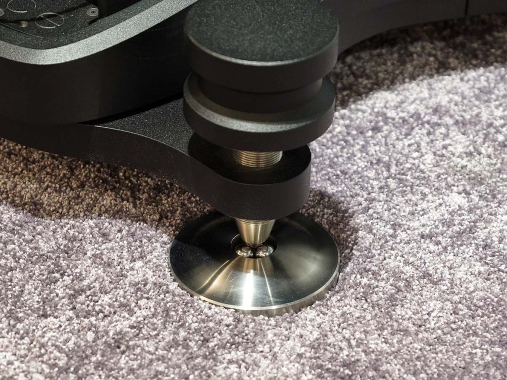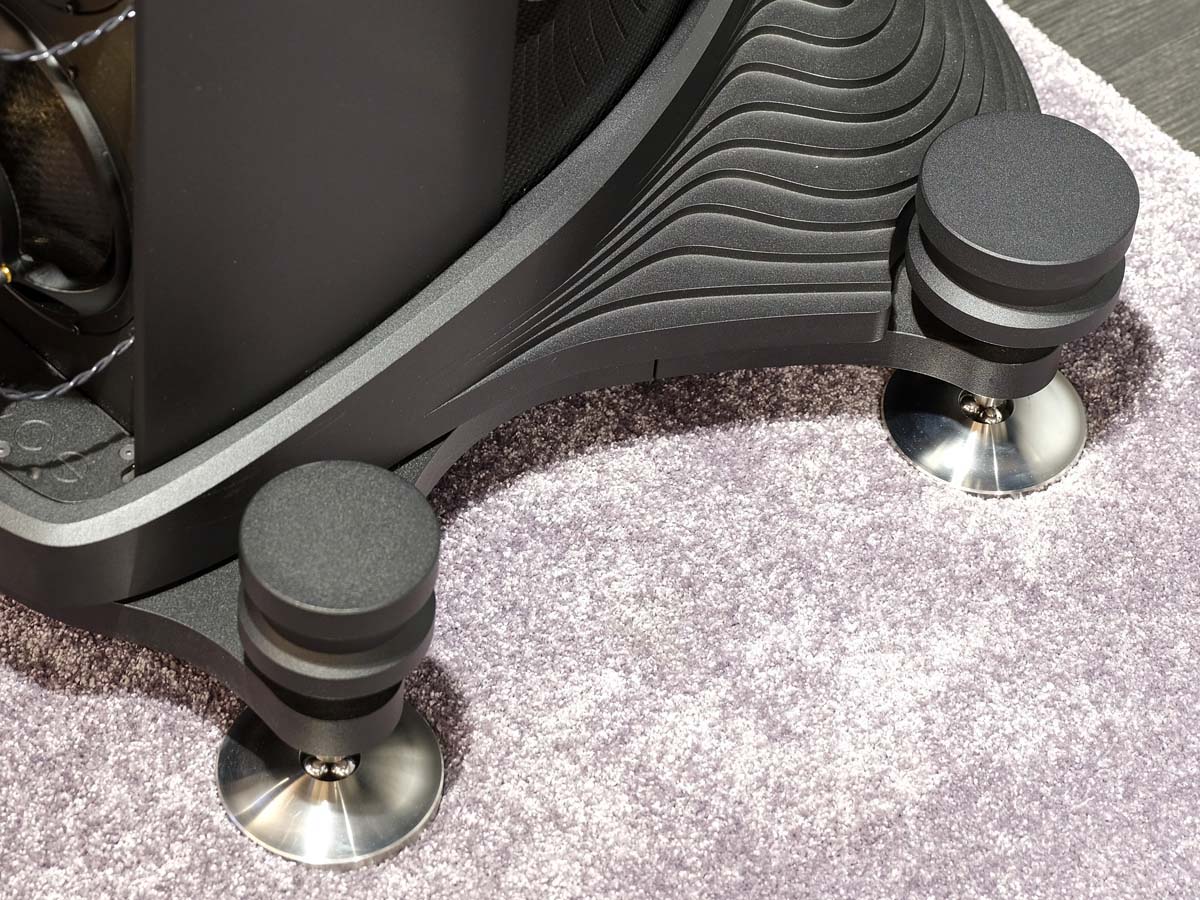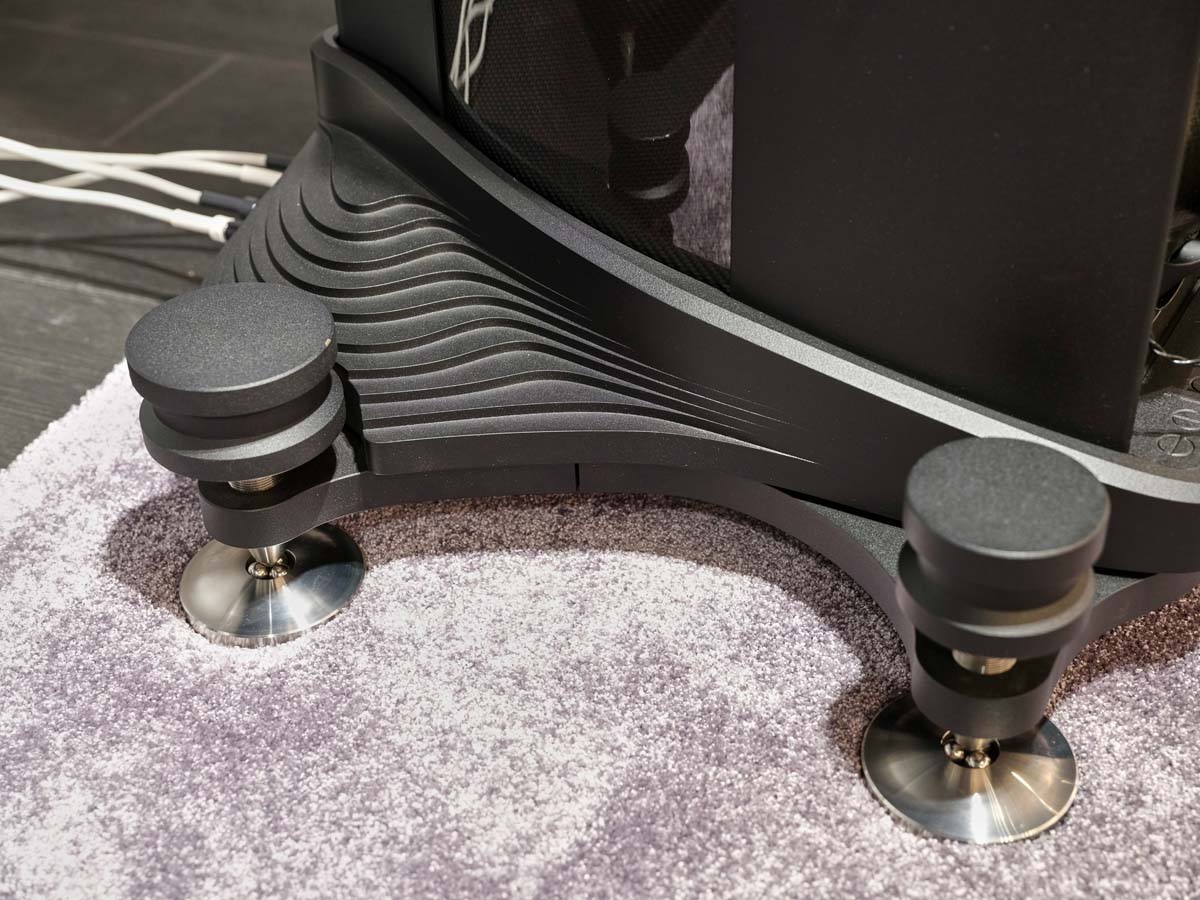 Die isobarische Konstruktion ist genial, findet aufgrund des hohen Aufwands (doppelte Zahl an Tiefbasstreibern) aber nur selten Anwendung. In der Eminence ist sie zwingende Pflicht, da alle Treiber im Monocoque des handgefertigten Gehäuses vereint sind. Eine Aluminiumspange, die den Lautsprecher mittig umgürtet, sorgt für noch mehr Ruhe, während der markante Gehäusedeckel aus Carbon lediglich als Abschluss dient. Für soliden Stand sorgt ein massiver Aluminiumfuß, der aus 70-Kilo-Material gefräst wird und nach der Herstellung immerhin noch gute 40 Kilogramm auf die Waage bringt. Mächtige Spikes bilden den unteren Abschluss. Sie ruhen im Zentrum von drei Stahlkugeln, die in den mitgelieferten Schalen fixiert sind.