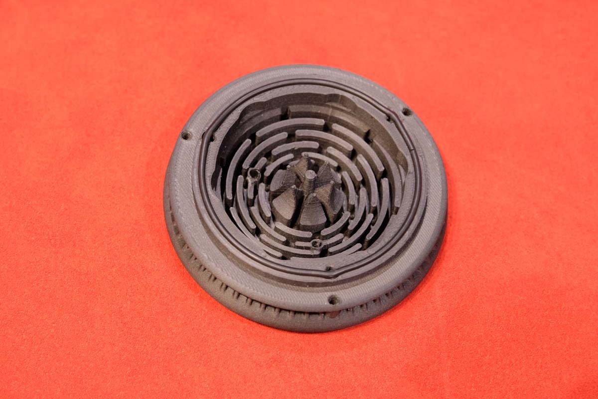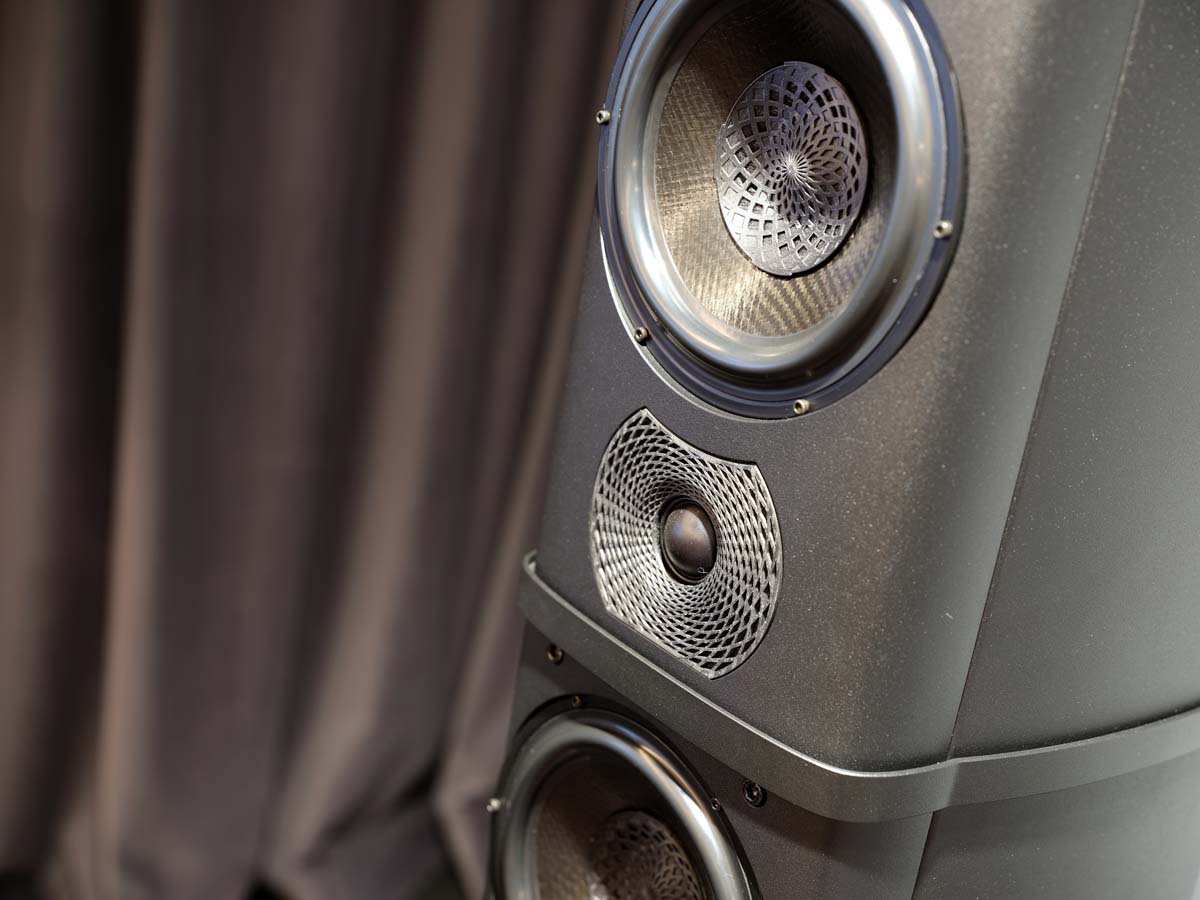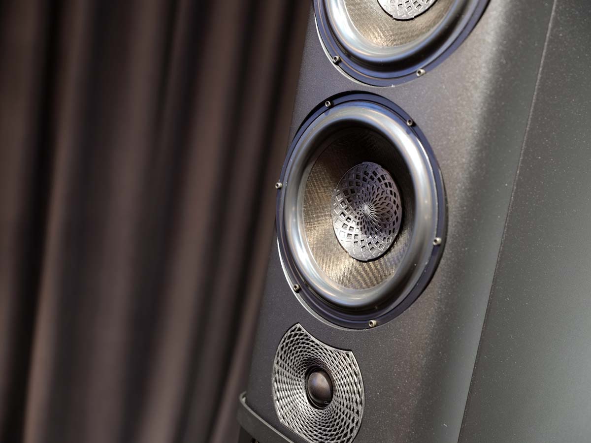 Wilson Benesch bezeichnet seinen Koloss in den offiziellen Angaben als geschlossenen 2,5-Wege-Schallwandler. Das sei irreführend, wie Luke Milnes erklärte, denn eigentlich handle es sich um 3,5 Wege. Die abweichende Angabe hat ihren Ursprung in einer Besonderheit der Eminence, die der Losung „Die beste Weiche ist keine Weiche“ entstammt: Der Mitteltöner – wir sprechen über den Treiber direkt unterhalb des Tweeters – läuft völlig ungefiltert. Wilson Benesch setzt (abgesehen vom Hochton) in allen Frequenzbereichen identische Siebenzöller (170 mm) ein: Beim neuen Tactic 3.0 handelt es sich um einen Treiber mit Carbonmembran, der Schwingungen von den tiefsten Kellerlagen bis hoch zu etwa vier Kilohertz verzerrungsfrei reproduziert. Um die Weiche dezent zu halten – tatsächlich wird ausschließlich mit Filtern erster Ordnung (6 dB) gearbeitet – verwenden die Briten Dämpfer aus ihren 3D-Druckern, die ihre Membranen mechanisch begrenzen. Diese Dämpfer kann man sehen, denn sie sind dort angebracht, wo sich bei einer normalen Membran eine Staubschutzkalotte findet. Die „Vorfilterung“ geschieht aber nicht nur über die Dicke (und somit Masse) des Materials, sondern auch über filigrane Öffnungen. Und nun bitte volle Konzentration, denn wir schließen den Kreis: