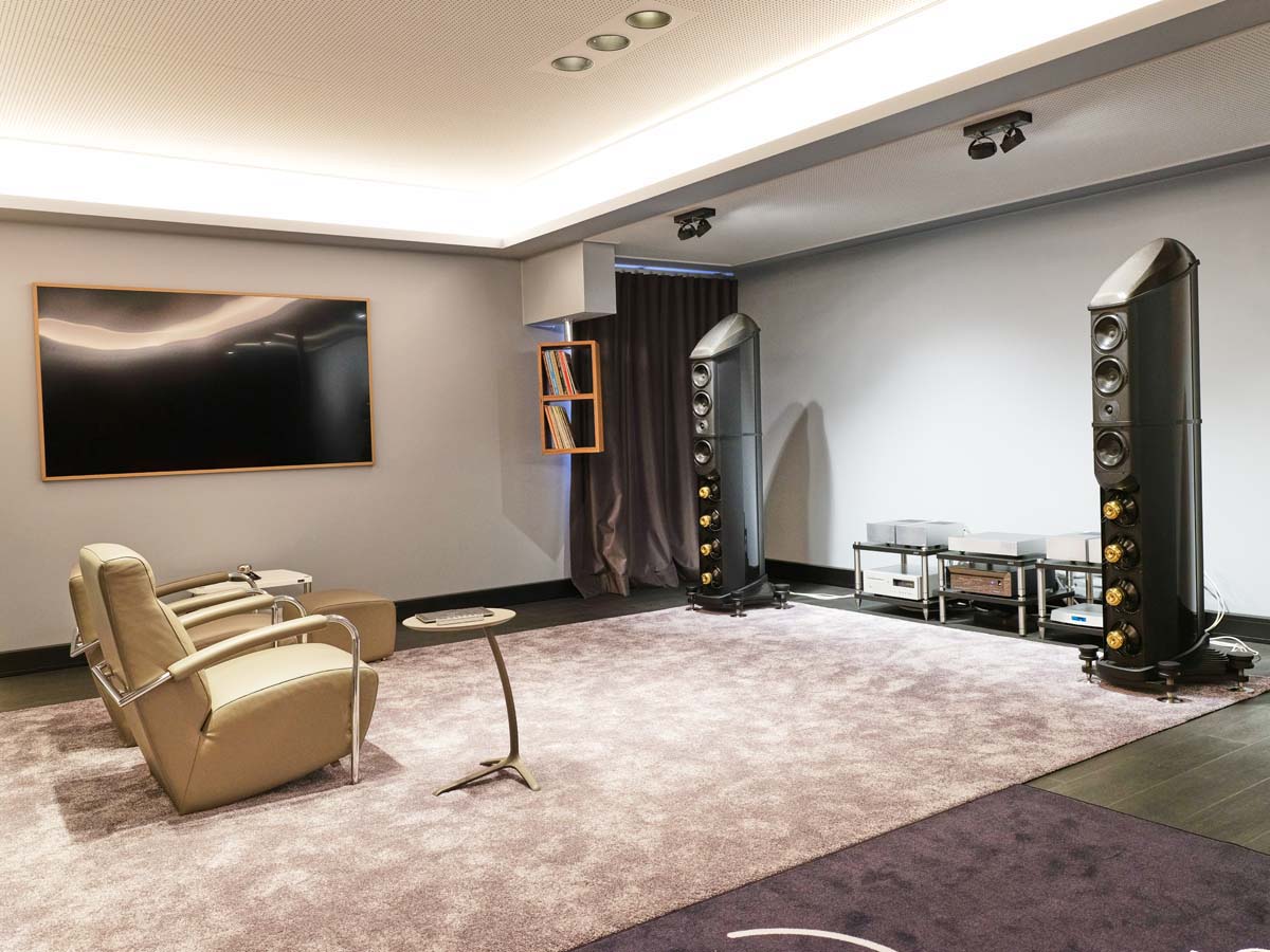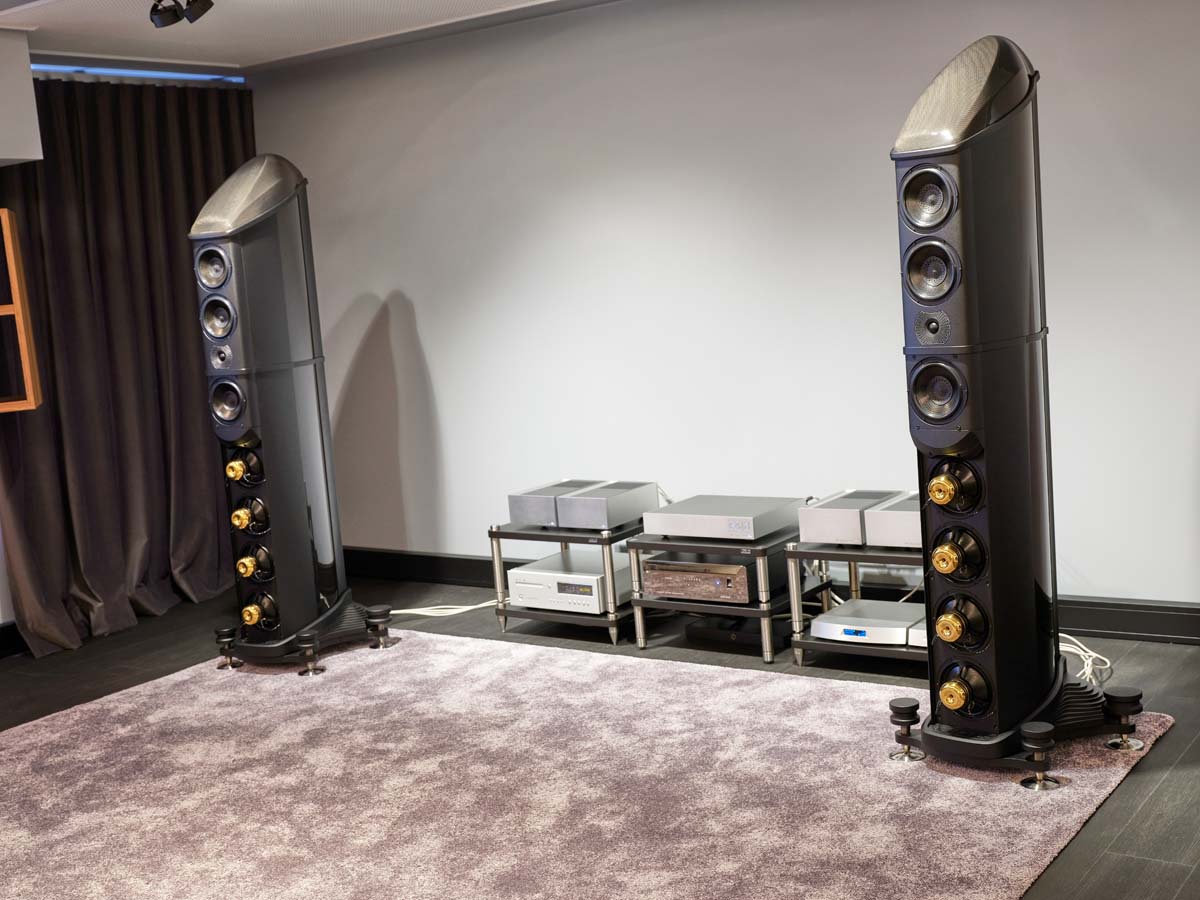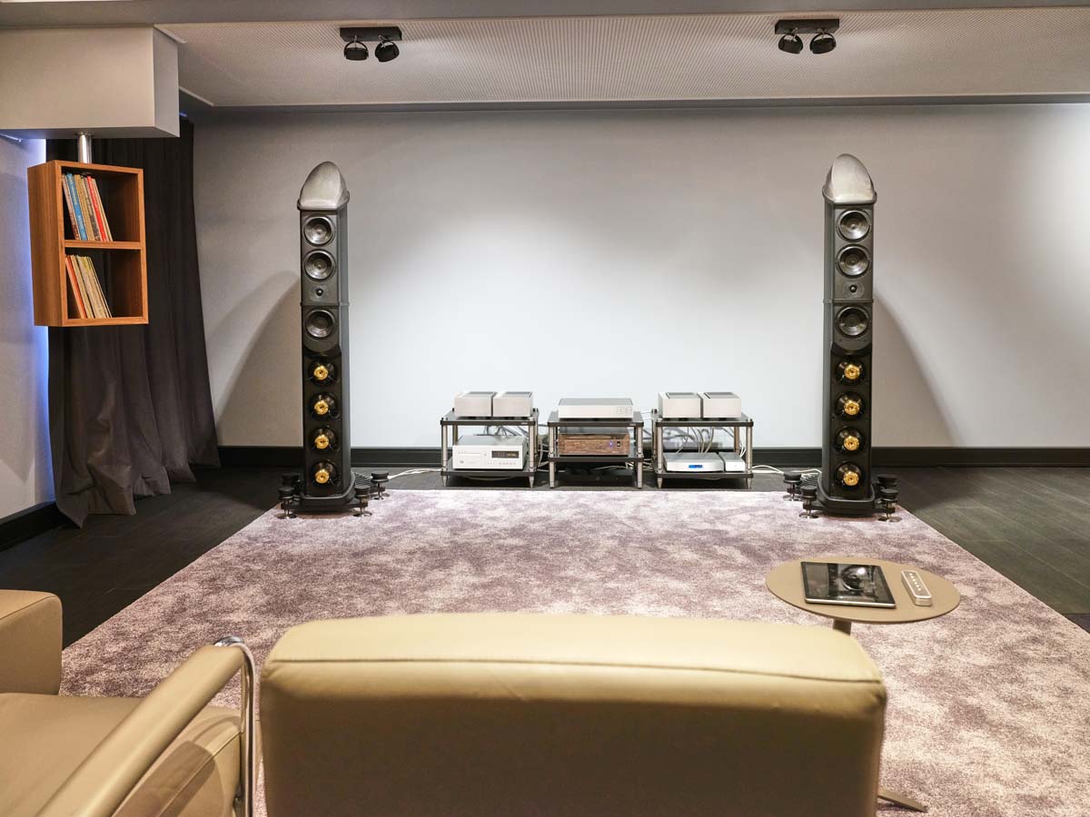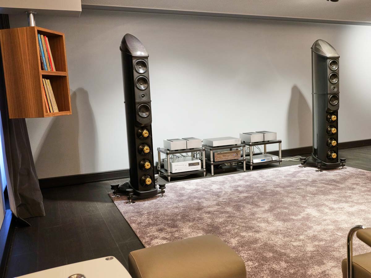 Jetzt aber zur wichtigsten Frage: Wie klingt die riesige Skulptur? Um dem ungestört auf den Grund gehen zu können, haben wir uns auch am Tag nach der Veranstaltung bei media@home Fidelity angemeldet, und tatsächlich ließ uns das Team von Hans-Joachim Acker und Frank-Michael Buck ungestört im größten Hörraum toben. Für das Event war die Box ordnungsgemäß im Raum platziert und im echten Bi-Amping mit einer Kette von WestminsterLab (1 x Quest und 4 x Rei) sowie Lumins Top-Streamer X1 verdrahtet, der von Luxmans CD-Flaggschiff D-10X gewandelt wurde. Daran ließ sich auch nicht rütteln, denn einmal aufgestellt, ist die Eminence eine veritable Immobilie. Für größere Rück- und Räumarbeiten gab es aber auch keinen Anlass. Wilson Beneschs Topmodell präsentierte sich an der Vor-/Endstufenkombi als lupenreine Superbox und gewährte uns ein Hörerlebnis, das man – auch wenn es abgedroschen klingen mag – so schnell nicht wieder vergisst. Als erstem Track lauschte ich Anna von Hauswolffs „Funeral For My Future Children“ (Ceremony), und es war geradezu atemberaubend, wie transparent und klar die Hallfahnen im Intro des Songs in eine gefühlte Unendlichkeit verschwanden. Wenig später setzt eine obertonreiche Kirchenorgel ein, die bis in die tiefsten Lagen sauber und facettenreich in den Raum gezeichnet wurde. Nach etwa 50 Sekunden platzierte die Eminence die schwedische Sängerin derart plastisch, scharf und lebensgroß vor die Klanggebilde, dass es uns eine Gänsehaut auf die Arme zauberte.
