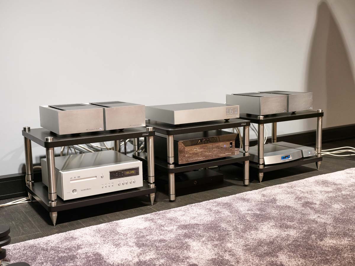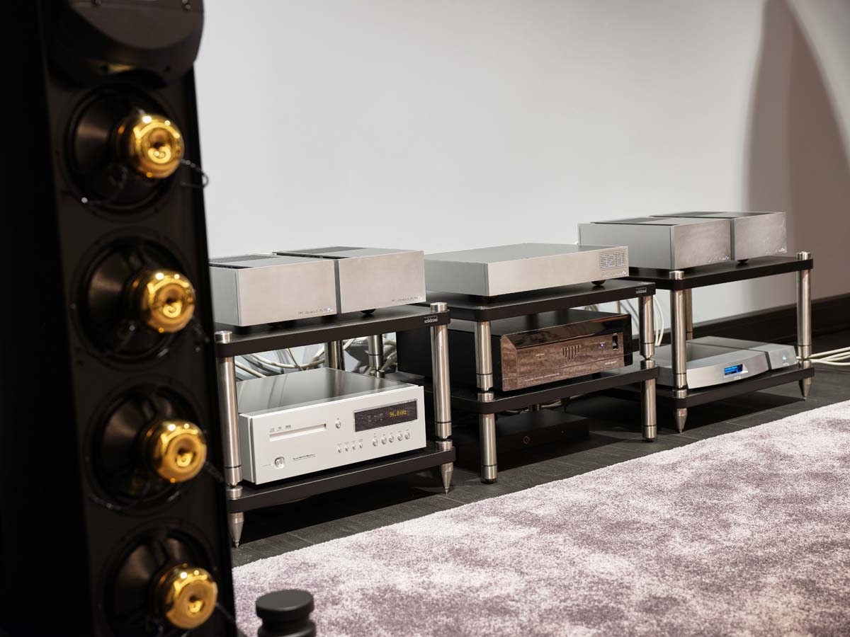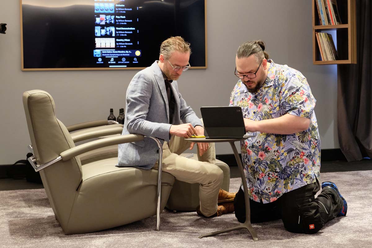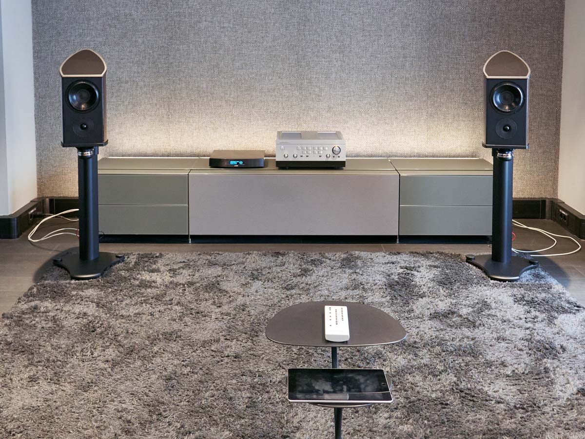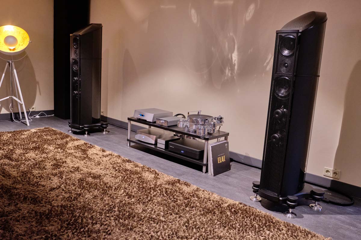 Jetzt aber zur wichtigsten Frage: Wie klingt die riesige Skulptur? Um dem ungestört auf den Grund gehen zu können, haben wir uns auch am Tag nach der Veranstaltung bei media@home Fidelity angemeldet, und tatsächlich ließ uns das Team von Hans-Joachim Acker und Frank-Michael Buck ungestört im größten Hörraum toben. Für das Event war die Box ordnungsgemäß im Raum platziert und im echten Bi-Amping mit einer Kette von WestminsterLab (1 x Quest und 4 x Rei) sowie Lumins Top-Streamer X1 verdrahtet, der von Luxmans CD-Flaggschiff D-10X gewandelt wurde. Daran ließ sich auch nicht rütteln, denn einmal aufgestellt, ist die Eminence eine veritable Immobilie. Für größere Rück- und Räumarbeiten gab es aber auch keinen Anlass. Wilson Beneschs Topmodell präsentierte sich an der Vor-/Endstufenkombi als lupenreine Superbox und gewährte uns ein Hörerlebnis, das man – auch wenn es abgedroschen klingen mag – so schnell nicht wieder vergisst. Als erstem Track lauschte ich Anna von Hauswolffs „Funeral For My Future Children“ (Ceremony), und es war geradezu atemberaubend, wie transparent und klar die Hallfahnen im Intro des Songs in eine gefühlte Unendlichkeit verschwanden. Wenig später setzt eine obertonreiche Kirchenorgel ein, die bis in die tiefsten Lagen sauber und facettenreich in den Raum gezeichnet wurde. Nach etwa 50 Sekunden platzierte die Eminence die schwedische Sängerin derart plastisch, scharf und lebensgroß vor die Klanggebilde, dass es uns eine Gänsehaut auf die Arme zauberte.