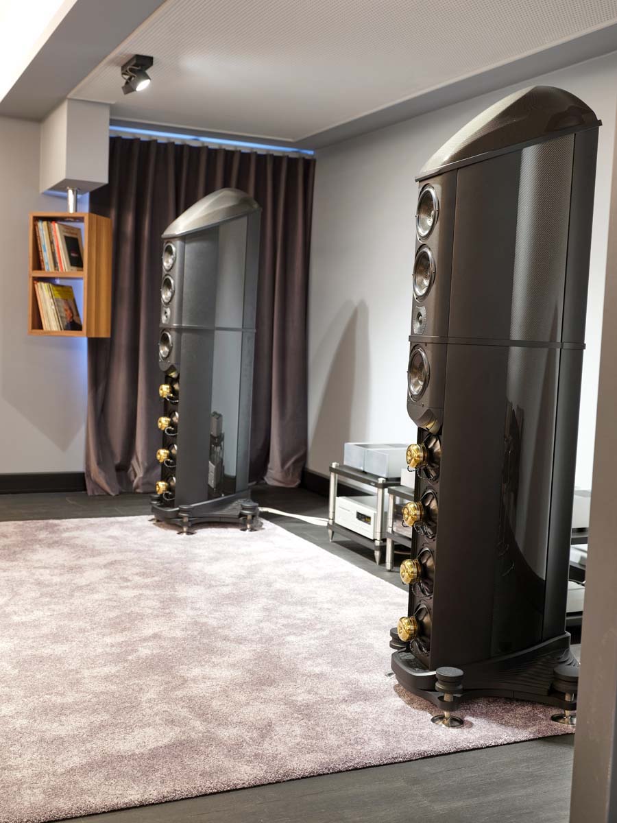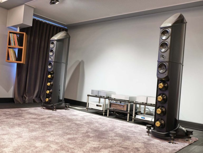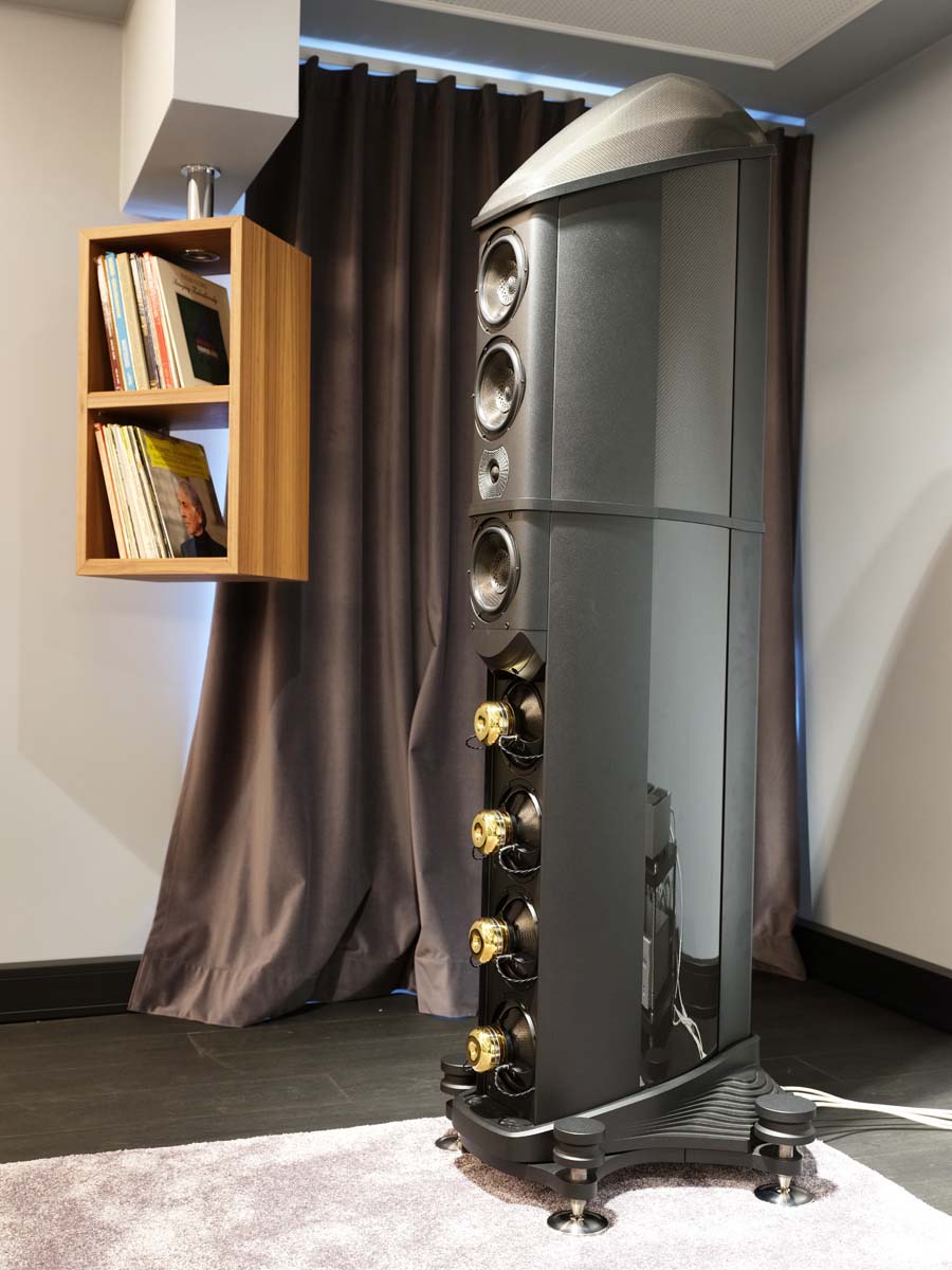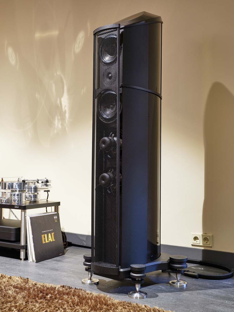 Besonderheiten: Gehäuse-Monocoque aus Carbon/Kompositmaterial, geschlossener Woofer mit isobarischem Basskonzept, justierbare Spikes mit Bodenschonern