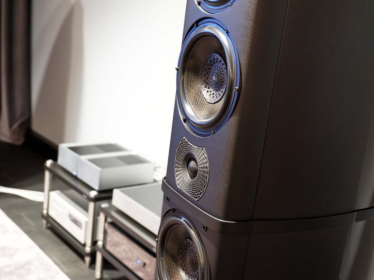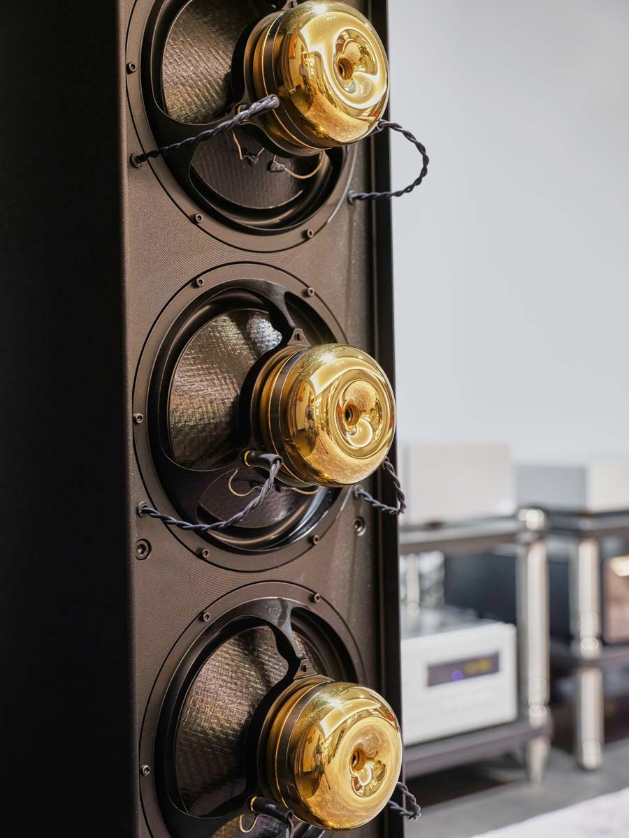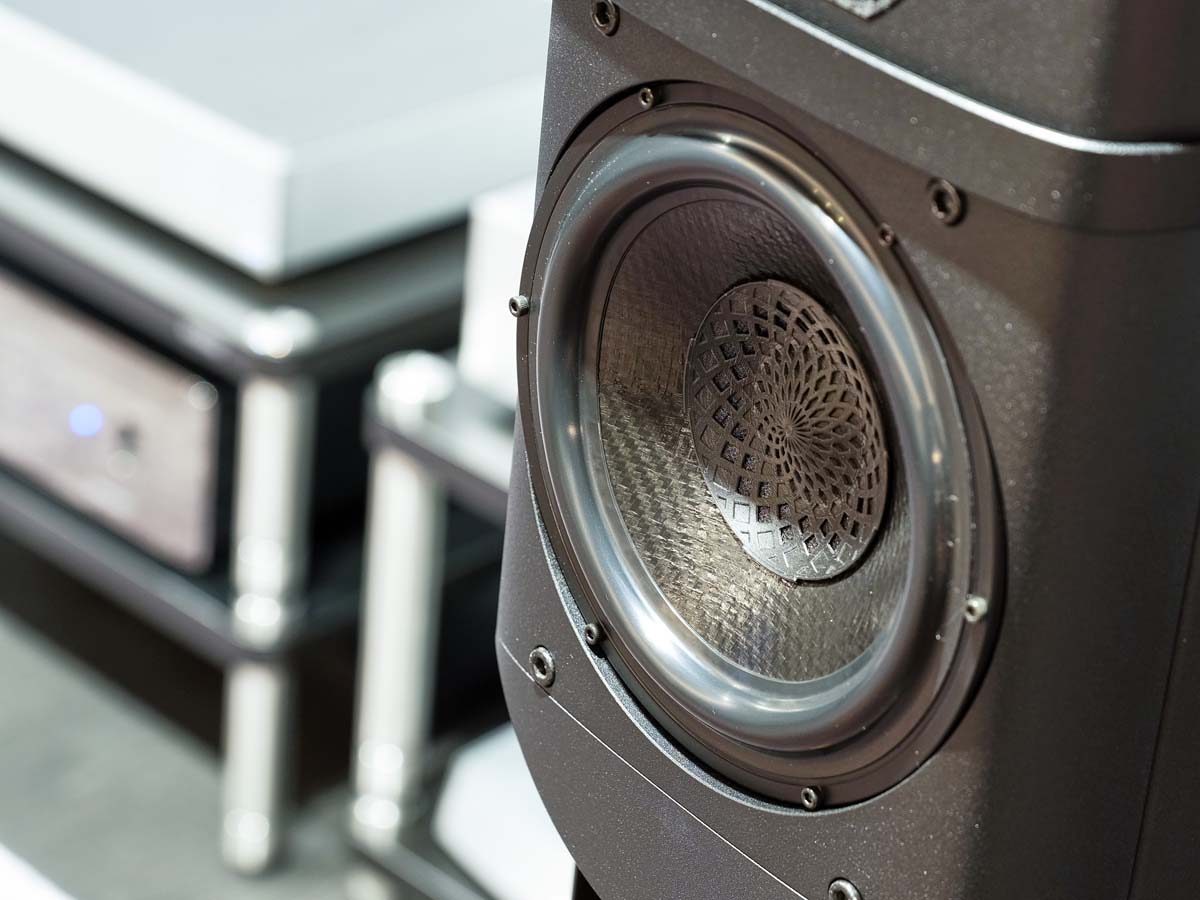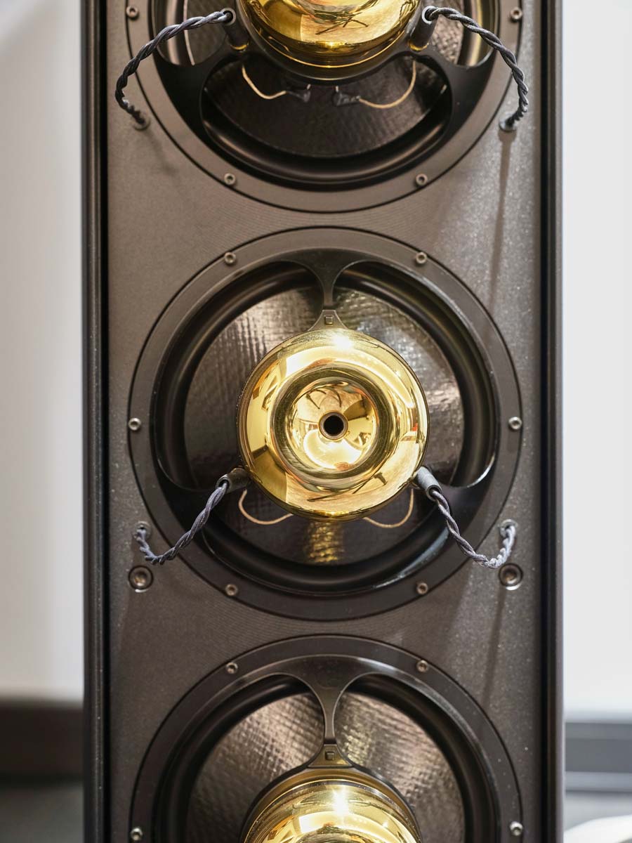 Oberhalb des Mitteltöners sitzt der Tweeter, dessen federleichte Seidenkalotte zur Gewichtsreduzierung mit Kohlefasern durchwebt wurde. Sie ist zur Abfederung in einem gedruckten Fibonacci-Tragrahmen montiert und erklimmt Sphären bis 30 Kilohertz. Ein spannendes Detail könne man von außen nicht erkennen, wie mir Milnes erklärt: Tweeter hätten die unangenehme Eigenschaft, sich ab einer gewissen Schwingfrequenz nach innen zu verformen, und um dem entgegenzuwirken, montiert Wilson Benesch direkt hinter der Membran eine Metallspange, die negative Auslenkungen verhindert. Die beiden oberen Treiber sind als „Oberbässe“ ausgelegt.