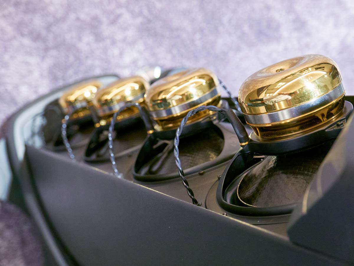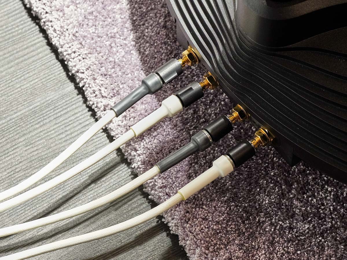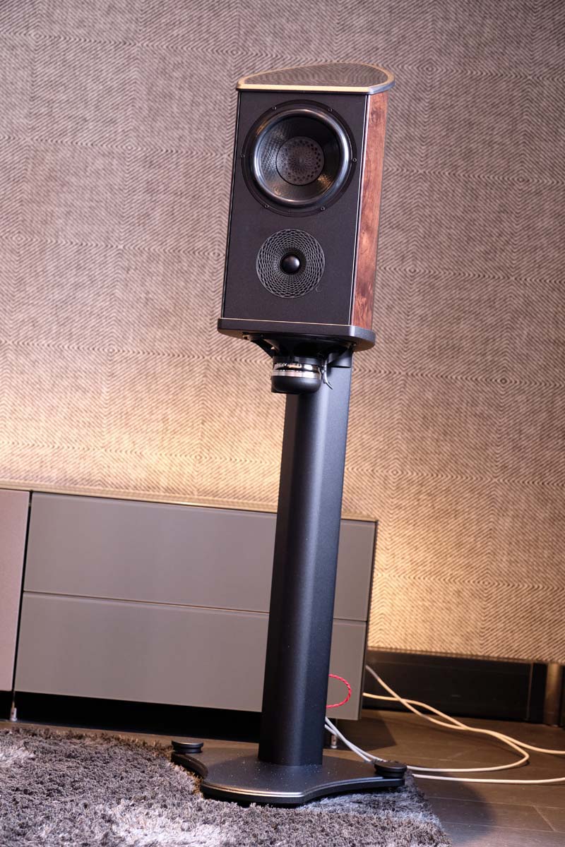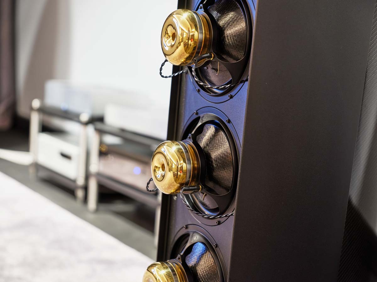 Oberhalb des Mitteltöners sitzt der Tweeter, dessen federleichte Seidenkalotte zur Gewichtsreduzierung mit Kohlefasern durchwebt wurde. Sie ist zur Abfederung in einem gedruckten Fibonacci-Tragrahmen montiert und erklimmt Sphären bis 30 Kilohertz. Ein spannendes Detail könne man von außen nicht erkennen, wie mir Milnes erklärt: Tweeter hätten die unangenehme Eigenschaft, sich ab einer gewissen Schwingfrequenz nach innen zu verformen, und um dem entgegenzuwirken, montiert Wilson Benesch direkt hinter der Membran eine Metallspange, die negative Auslenkungen verhindert. Die beiden oberen Treiber sind als „Oberbässe“ ausgelegt.