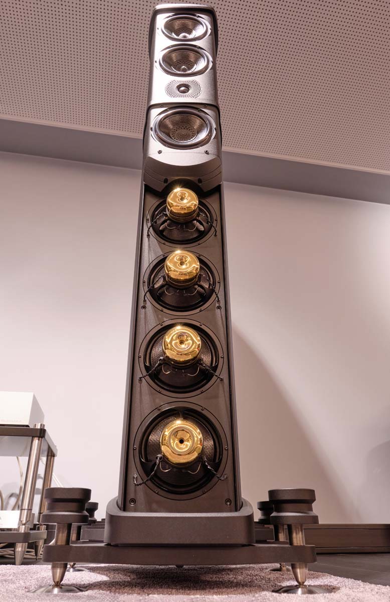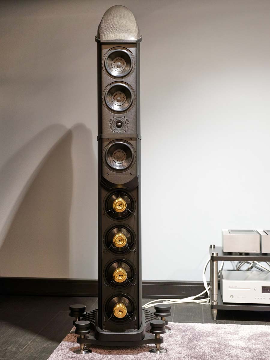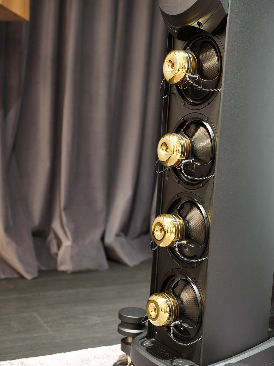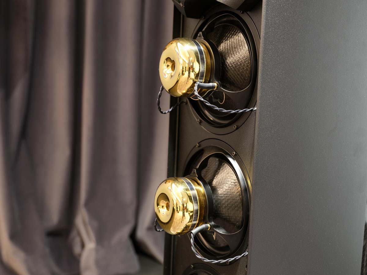 Bestückung: 1″-Hochtöner (Seide/Carbongewebe), 9 identische Tactic-3.0-Treiber (Carbonkomposit, 170 mm) als 1 x Mittelton, 2 x Oberbass, 2 x Bass und 4 x Woofer