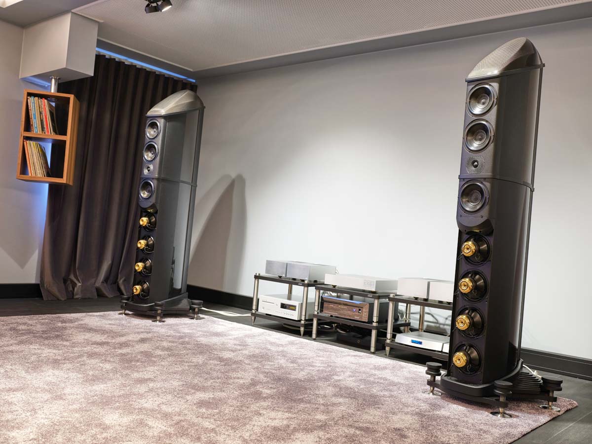 Wie feinfühlig sie auf ihre Umgebungsvariablen reagiert, demonstrierte uns die Box nur wenig später. Wir wollten Verstärkeralternativen ausprobieren und gingen auf einen Raubzug durch die verschiedenen Vorführräume. Als Beute ergatterten wir zwei kraftvolle Ovation MA 6.3 von AVM und einen Luxman L-595A SE. In beiden Fällen arbeitete die Eminence die charakterlichen Eigenschaften der Verstärker heraus, legt mit AVM ein gehöriges Pfund mehr an Power in die unteren Lagen und begeistert uns kurz darauf mit der überirdischen Musikalität des Luxman-Boliden. Auch wenn die durchprobierten Kombinationen sich klanglich merklich unterscheiden, einte sie die wichtigste Kernkompetenz der Eminence: So exakt und präzise die riesige Standbox auch reproduziert, so galant verführt sie ihr Auditorium, die Zeit und alles andere um sich herum zu vergessen …