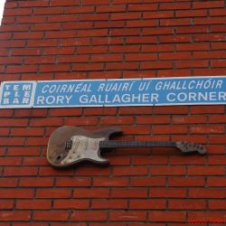 Eine von diesen Straßenecken wurde benannt nach Rory Gallagher. Der 1995 verstorbene Blues-Gitarrist hat eine typisch irische Biographie: Als Kind lebte er mal in der seit 1922 unabhängigen Republik, mal in dem zu Großbritannien gehörenden Norden – und zwar in jenen Zeiten, die heute von den Iren gerne als „Troubles“ verharmlost werden. Die knapp zwei Autostunden nördlich von Dublin verlaufende Grenzlinie ist heute nicht mehr erkennbar. Hinweisschilder fehlen, weil sie von irischen Unabhängigkeits-Fanatikern oder von ausländischen Souvenir-Sammlern sofort wieder abgeschraubt würden. Oder man müsste sie mindestens in der gleichen Höhe platzieren, in der auch die Nachbildung von Rory Gallaghers Fender-Gitarre an der ihm gewidmeten Straßenecke in Dublin hängt.