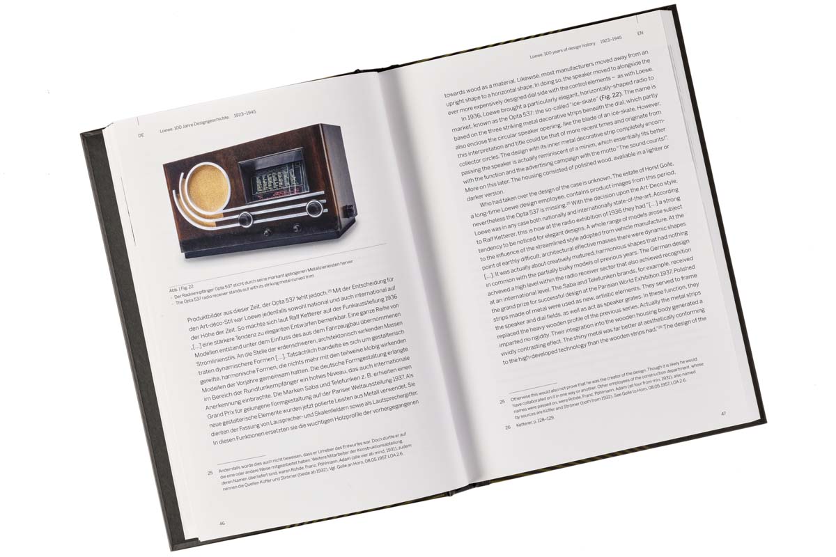Begleitend zur Ausstellung verfasste Kilian Steiner eine ausführliche Dokumentation der Loewe-Geschichte, die man auszugsweise auf der Homepage findet oder in gedruckter Form im Museum kaufen kann. Dort lernt man, dass der Wiederaufbau der Marke nach dem zweiten Weltkrieg mehr als nur etwas Kreativität erforderte oder dass die Gründerfamilie Loewe bei ihren Reisen in die USA regelmäßig mit einem gewissen Herrn Einstein verkehrte. Außerdem ist minutiös recherchiert, welche Designer für welche Produkte verantwortlich waren – bekanntlich ein entscheidendes Argument für den Erfolg der Marke.