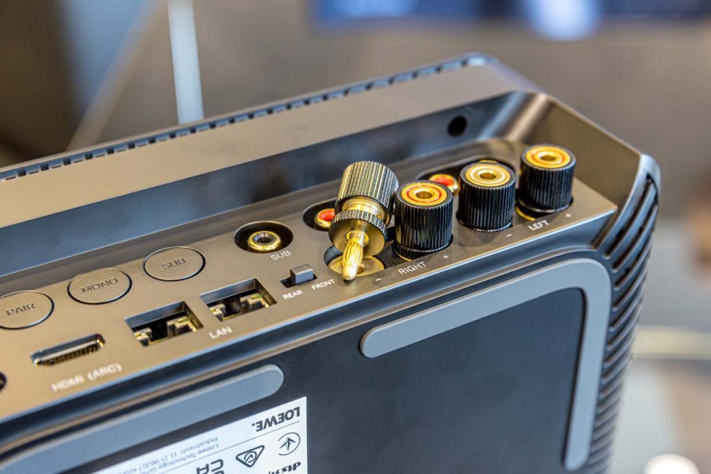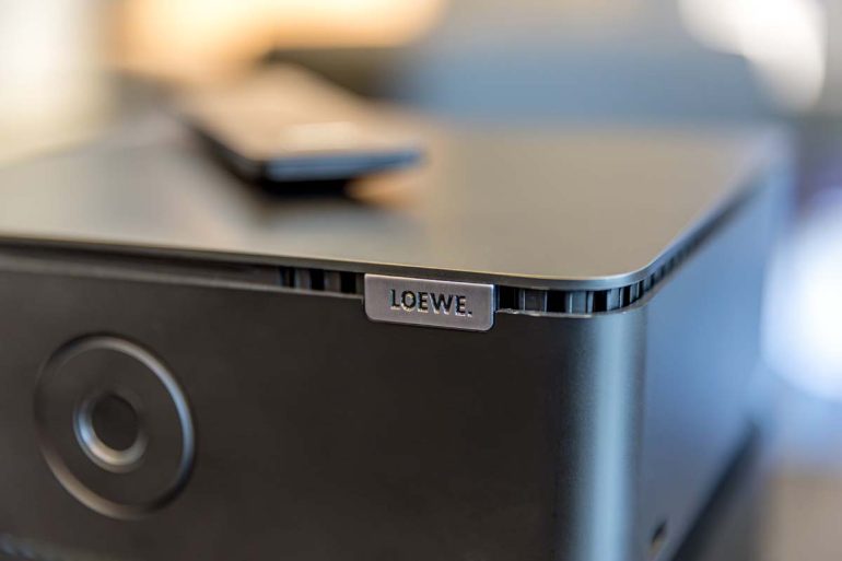 „Was sagt ihr?“, fragte er und wartete gespannt auf unsere Reaktion. Ich muss zugeben, dass mein erster Eindruck noch vergleichsweise nüchtern ausfiel: Ein schwarzes Kästchen im Kunststoffgehäuse, das ich in meiner Hand hin und her wiegte und auf kaum drei Kilo schätzte. Das Loewe-Logo an der Front verriet, dass Design und Optik – wenn auch noch nicht zu 100 Prozent final – bereits weitestgehend der Serie entsprachen. Dann entdeckte ich die Rückseite: Strom, HDMI-Zugang, LAN-Ports, analoge Ein- und Ausgänge sowie „amtliche“ Lautsprecher-Terminals und – Tusch! – eine Reihe von Tastern, die mich sofort für die kleine Maschine begeisterten: „WPS“, „Pair“, „Mono“ und „Sub“ prangt auf den Schaltern, die so dezent eingebettet sind, dass man sie beinahe übersieht.