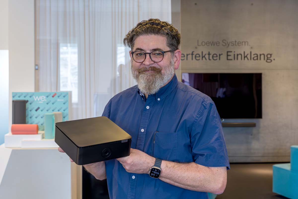 Ich muss gestehen, dass ich zunächst an eine saftigere Soundbar oder an größere Standlautsprecher-Varianten der mr-Modelle dachte. Doch weit gefehlt: Nach einem Begrüßungskaffee und der in Bayern/Franken obligatorischen Frühstücks-Brezn machte sich unser Gastgeber Alfred Hassaoui an einem kleinen Karton zu schaffen und zauberte einen schwarzen Kasten im klassischen „Midi-Gehäuse“ hervor – etwa 20 mal 20 Zentimeter in den Grundmaßen und vermutlich sieben bis acht Zentimeter hoch. Wie viele Kronacher wurde Hassaoui zeitlebens von der Marke geprägt. Der Ingenieur hat vor über dreißig Jahren bei Loewe gejobbt, war später Praktikant und blieb dem Unternehmen auch während und nach seinem Studium treu. Heute ist er – nach einer kurzen Pause in den späten Neunzigern/frühen Zweitausendern – als leitender Entwickler für die Hardware verantwortlich. Und Audio scheint für ihn ein echtes Herzblutthema zu sein.