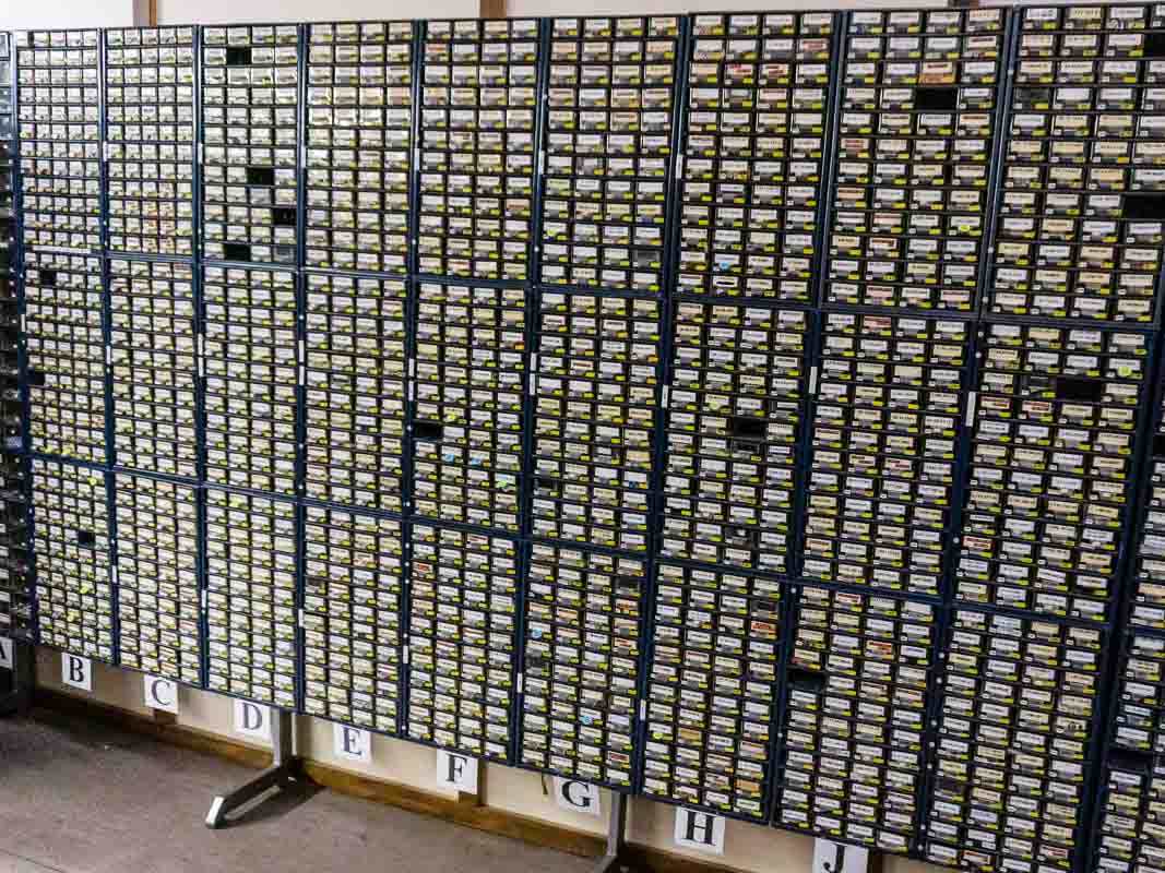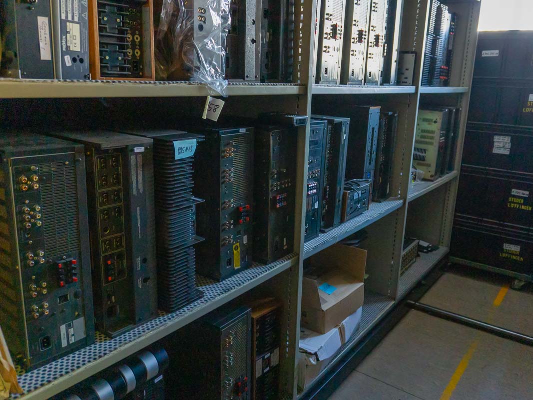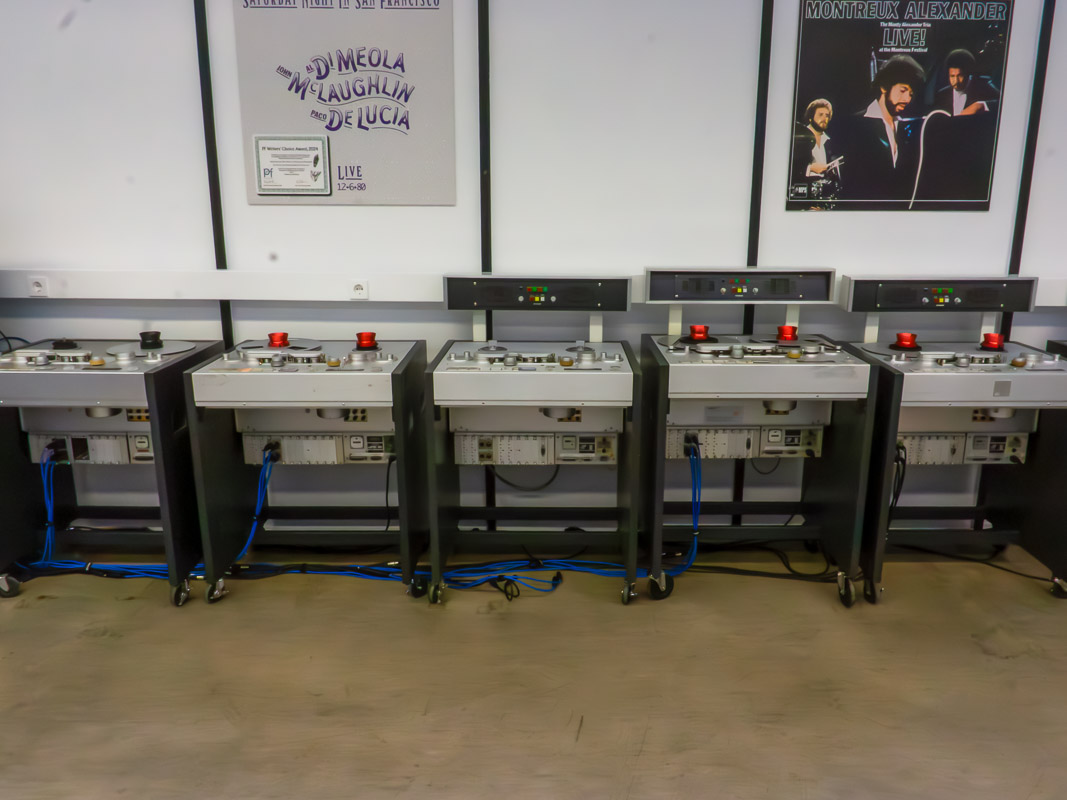 Anschließend ging es weiter in die Tonbandproduktion. Jeder Analogfan würde angesichts des Arsenals von Studer-A80-Bandmaschinen feuchte Augen bekommen: Die Studiolegenden kopieren Band um Band in Original-Geschwindigkeit auf Rohmaterial von RTM. Pro Monat entstehen etwa 950 Masterbandkopien aus dem ständig wachsenden Revox-Musikkatalog. Ausgeliefert werden die Bänder in klimafesten Archivboxen, wie sie in professionellen Musikarchiven verwendet werden. Anschließend führte unsere Tour durchs Lager und die Qualitätskontrolle.