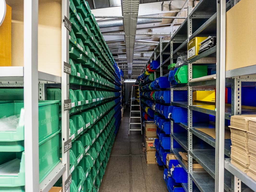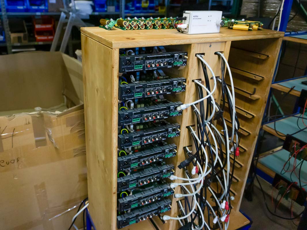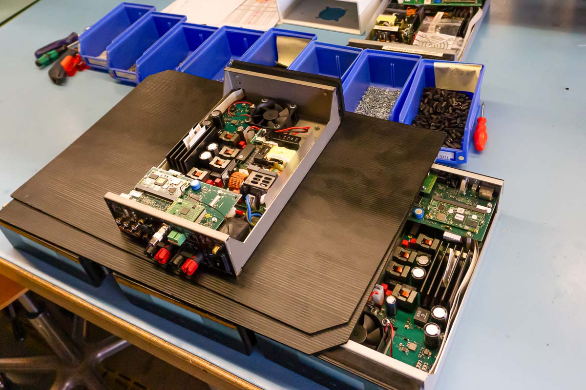 Jedes einzelne Produkt wird vor der Auslieferung auf Herz und Nieren überprüft. Direkt neben dem Lager befindet sich die Produktion, die eine eigene Burn-in-Abteilung für Platinen besitzt – der Prozess verkürzt die Einspielzeit beim Kunden und garantiert volle Qualität ab der ersten Spielminute. Neben Plattenspielern und Lautsprechern (auch unsichtbare Unterputz-Varianten) erfolgt hier die Montage der B77. Aufgrund der hohen Qualitätsstandards des Unternehmens können monatlich lediglich 20 Exemplare gefertigt werden. Alles entsteht in Handarbeit, Maschinen oder Automatisierung sucht man vergeblich.