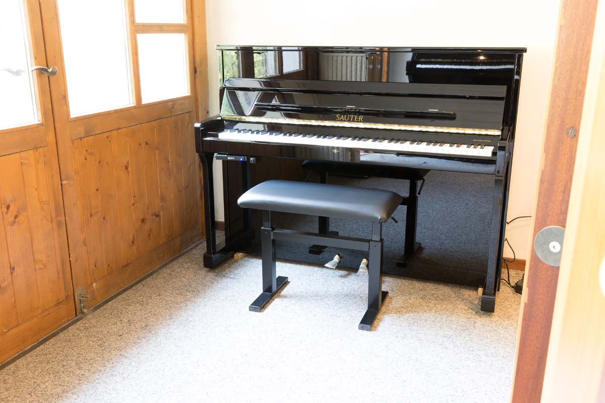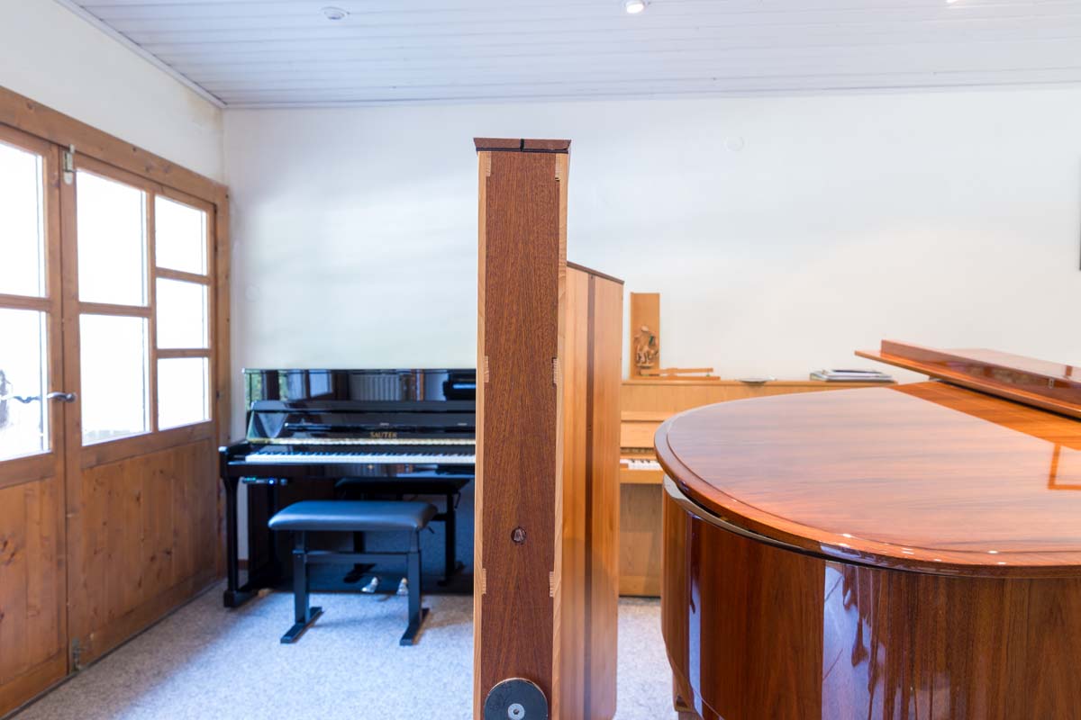 Ich lausche den Ausführungen des Herzblut-Handwerkers in ungewohnter Umgebung. Statt in einem Hörraum sitzen wir gemütlich an einem Esstisch im Wohnzimmer der Symanns. Abgesehen vom großen Ecksofa nebst Beistelltisch, einem Fernseher und dem HiFi-Rack Marke Eigenbau ist das Zimmer überschaubar ausgestattet. Ein „modern“ eingerichteter Wohnraum – nicht gerade leichtes Terrain für eine Lautsprecherdemonstration. An der schmalen Wand gegenüber einer Glasfront zur Terrasse steht ein Klavier, das Meisterstück Michael Symanns, wie ich erfahre, das er seit Jahrzehnten hegt und pflegt. Links und rechts davon erheben sich mannshohe und vollständig aus Holz gefertigte Monumente, die uns in genau diesem Moment in wohlige Klaviertöne, Streicherflächen und endlos tiefe Hallfahnen hüllen.