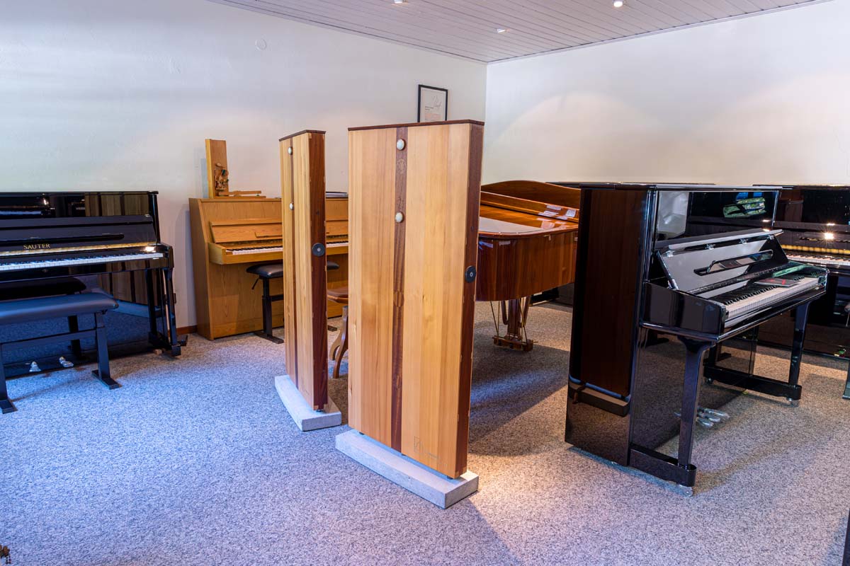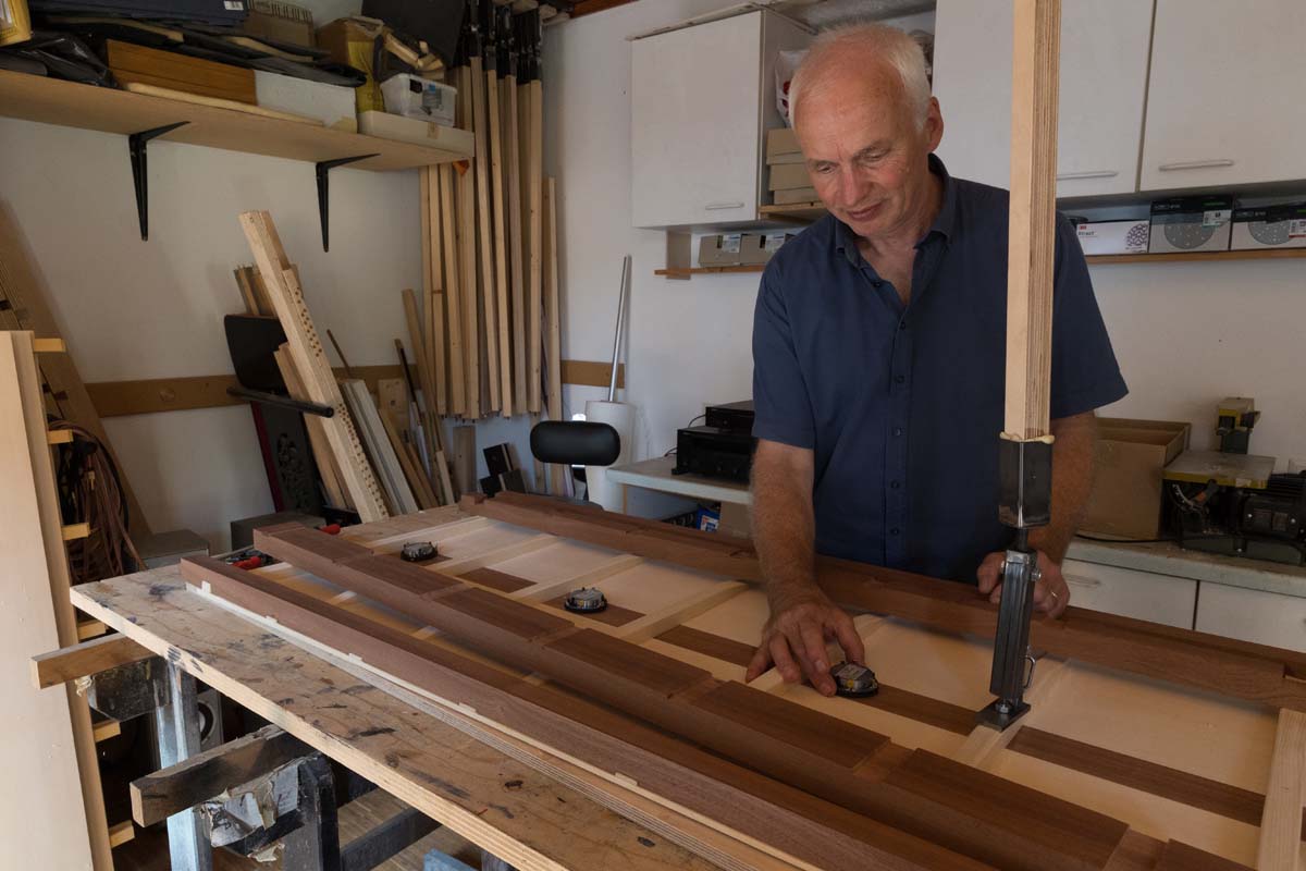 Doch dann gibt es Momente, in denen einfach die richtigen Leute ineinanderlaufen. Ein Kunde hatte ihn 2017 auf Flächenanregung angesprochen, erinnert sich Michael Symann. Ob er als Experte für Instrumentenhölzer nicht einen Tipp habe, wie man einen Exciter-getriebenen Lautsprecher in den Griff bekommen könne. Der im ostwestfälischen Verl beheimatete Klavierbaumeister und unermüdliche Tüftler kam ins Grübeln und begann, in seiner Werkstatt mit Holzsorten und Materialstärken zu experimentieren. Schon nach kurzem gelangte er zu der Erkenntnis, dass sich die Sache völlig analog realisieren lässt und für die Anregung keine Leistungs-Superlative nötig sind – bei seinen Klavieren macht er das schließlich den ganzen Tag.