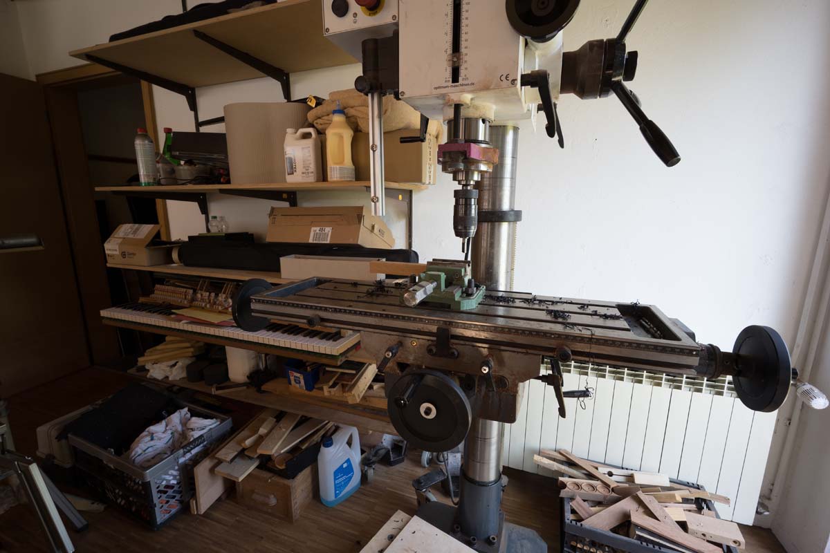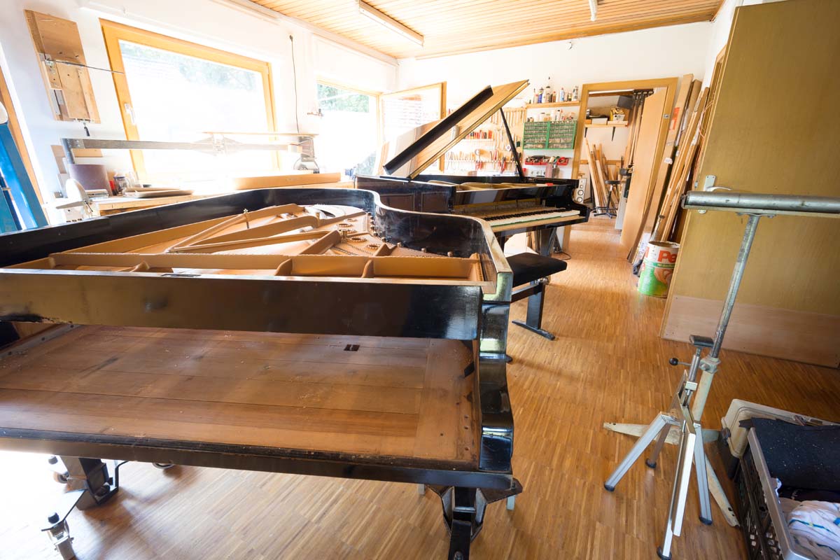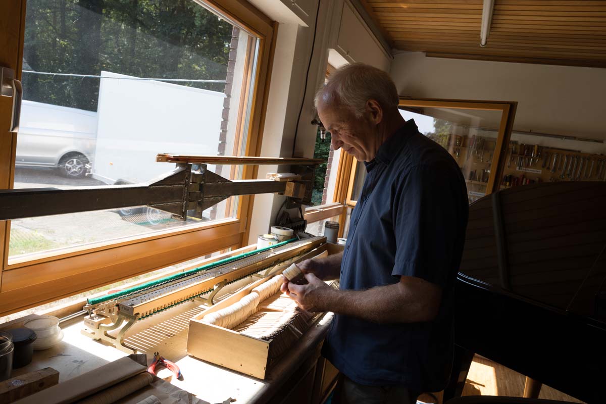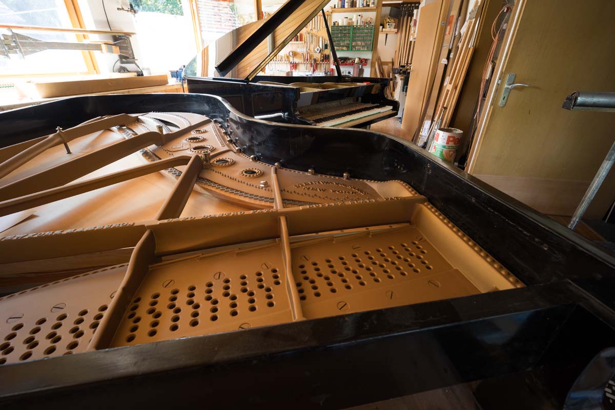 Wenig später stehen wir in der Werkstatt, die aus zwei verbundenen Räumen besteht. Im ersten Zimmer warten zwei Steinway-Flügel auf ihre Fertigstellung. Einer davon erhält im Kundenauftrag eine neue Mechanik – über Jahre werden die Filzhämmerchen plattgespielt und müssen dann und wann erneuert werden. Auf einer Fensterbank liegen die bereits aufgearbeiteten Teile in Reih und Glied und warten auf ihre Montage. Der zweite Flügel ist ein Langzeitprojekt Michael Symanns: Er wollte schon immer einen eigenen Steinway besitzen und entdeckte ein erschwingliches Exemplar, das jedoch noch viel Liebe und Sorgfalt benötigt.
