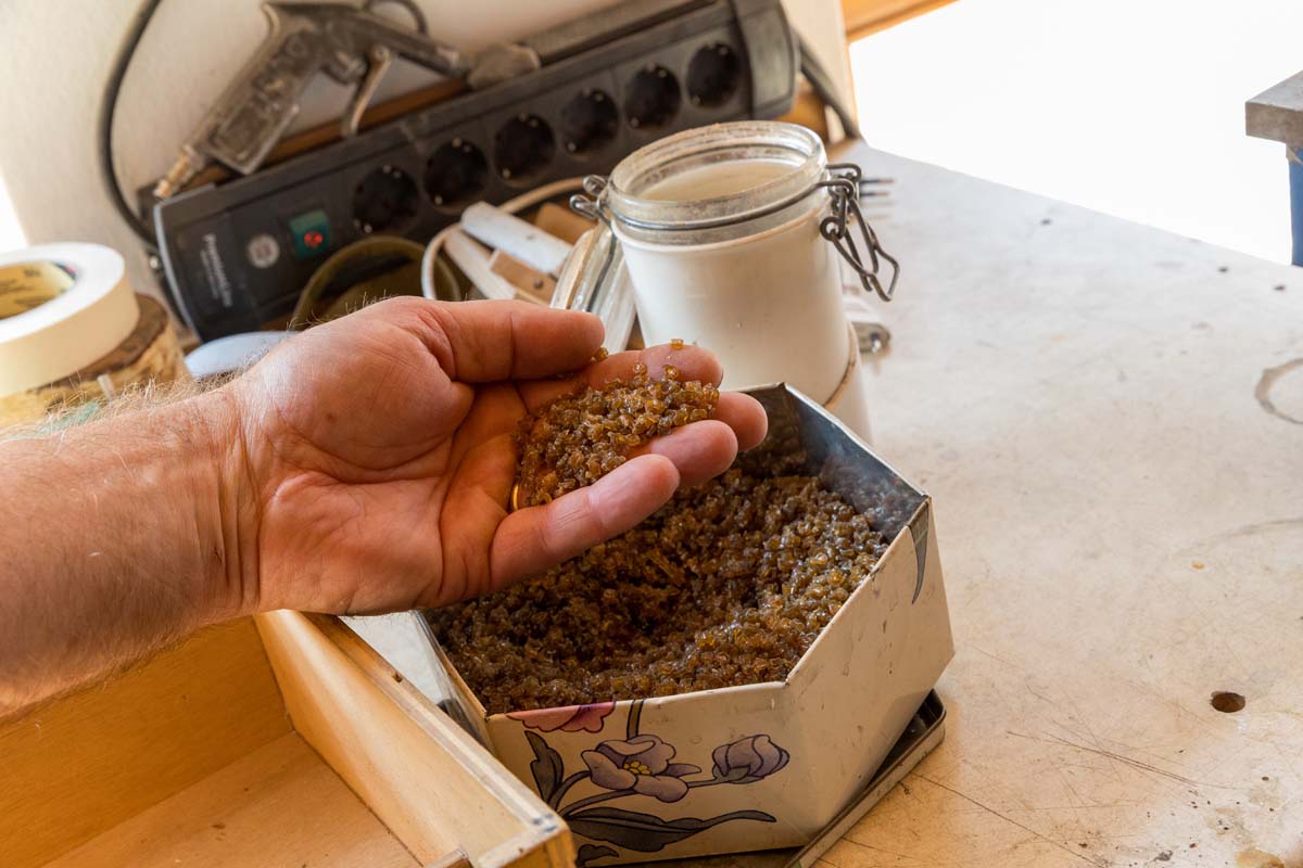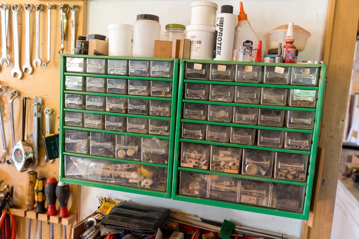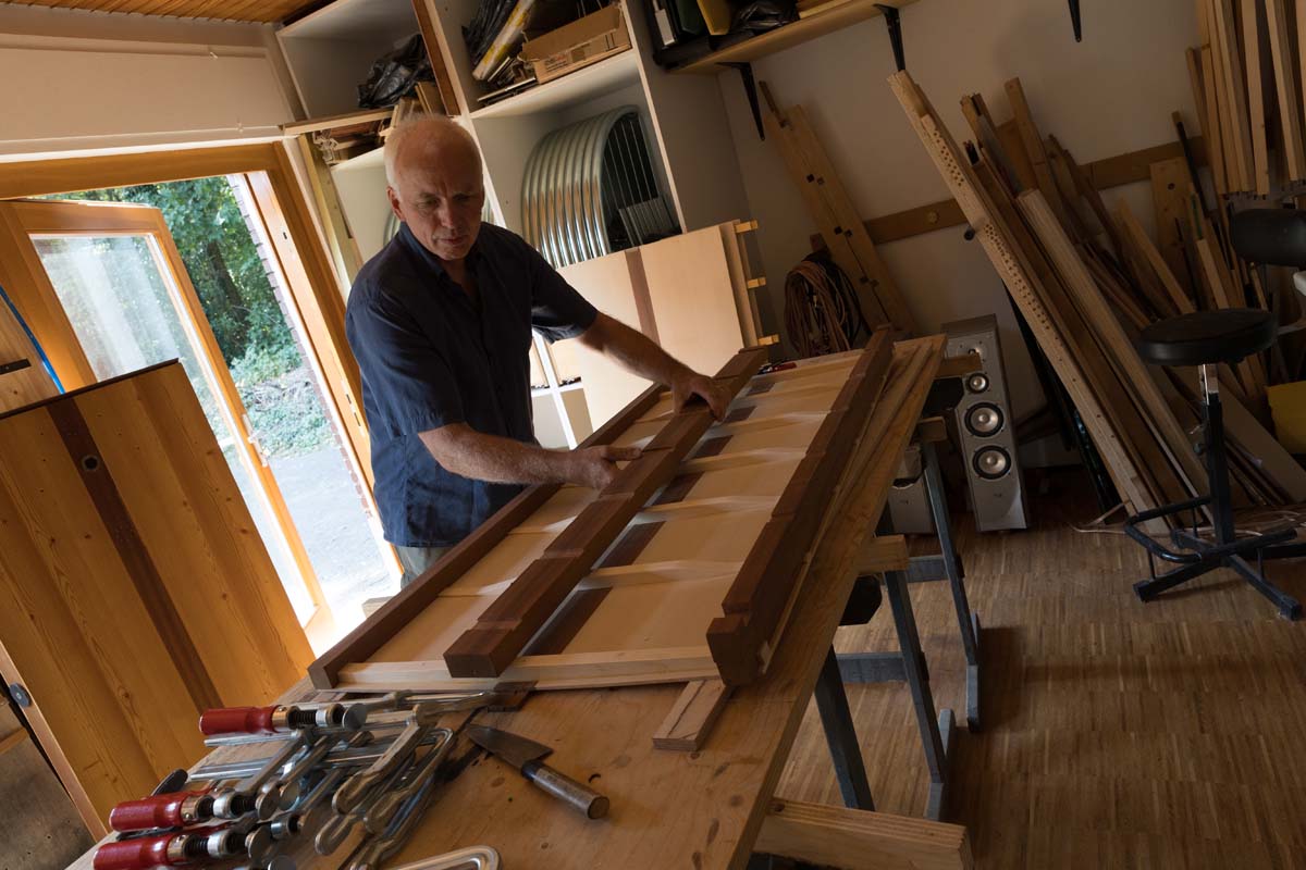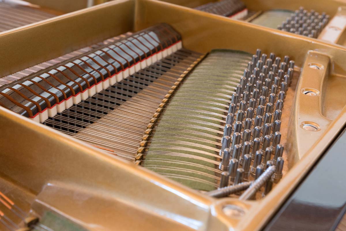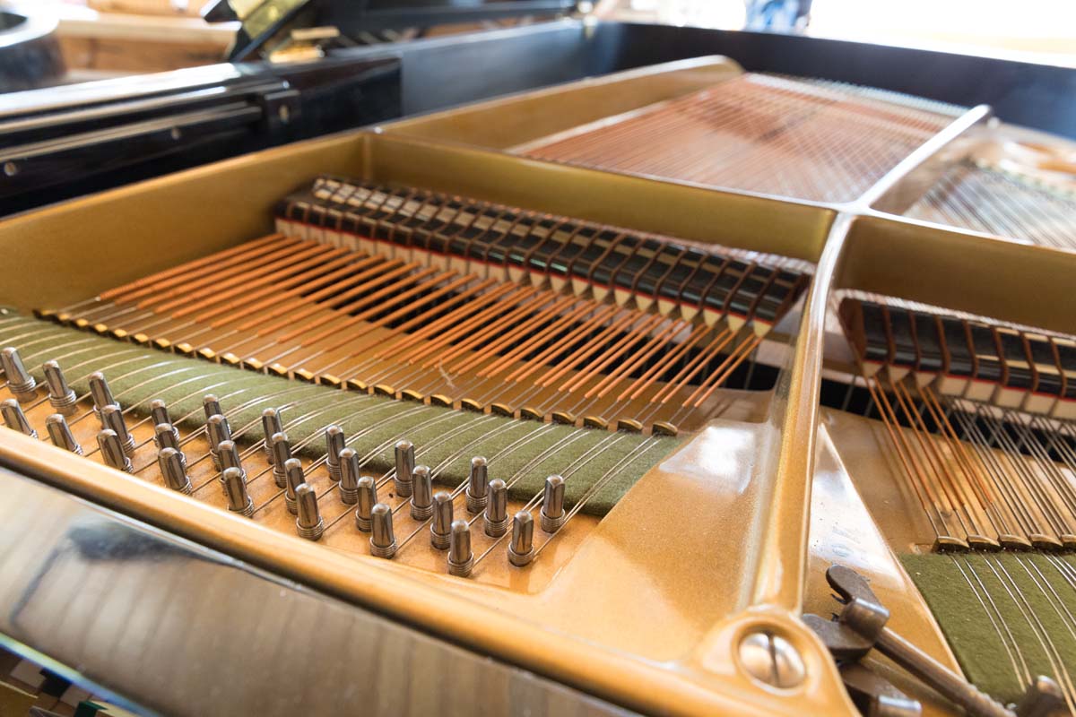 Wenig später stehen wir in der Werkstatt, die aus zwei verbundenen Räumen besteht. Im ersten Zimmer warten zwei Steinway-Flügel auf ihre Fertigstellung. Einer davon erhält im Kundenauftrag eine neue Mechanik – über Jahre werden die Filzhämmerchen plattgespielt und müssen dann und wann erneuert werden. Auf einer Fensterbank liegen die bereits aufgearbeiteten Teile in Reih und Glied und warten auf ihre Montage. Der zweite Flügel ist ein Langzeitprojekt Michael Symanns: Er wollte schon immer einen eigenen Steinway besitzen und entdeckte ein erschwingliches Exemplar, das jedoch noch viel Liebe und Sorgfalt benötigt.