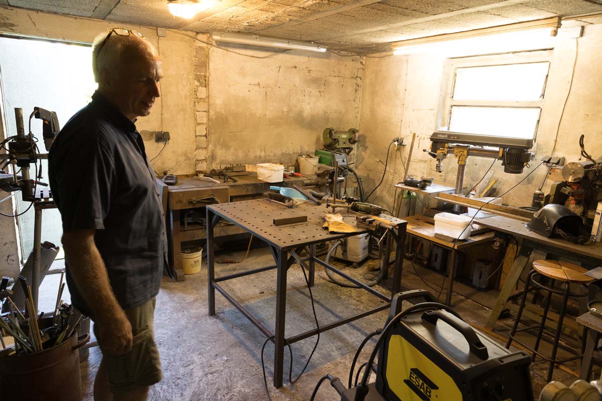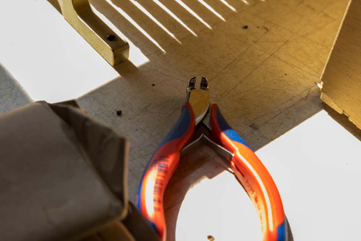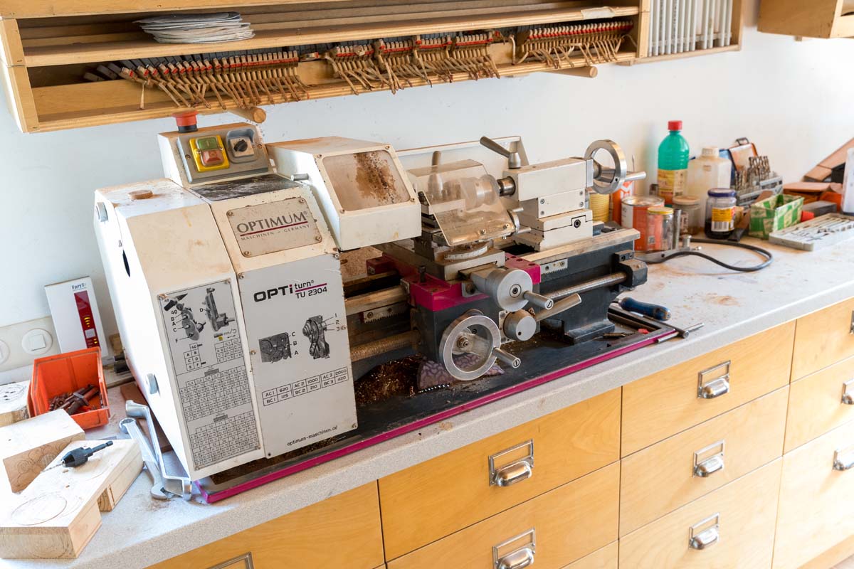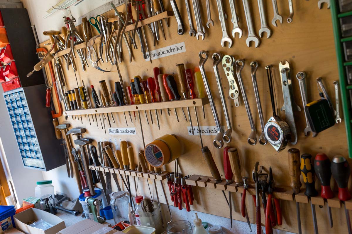 Die Lochdecke ist nicht das einzige Hilfsmittel, das der Klavierbaumeister ersonnen hat. Michael Symann zeigt mir einige gebogene Metallprofile mit Scharnieren, Bohrungen und Hebeln, unter denen ich mir absolut nichts vorstellen kann. Es handele sich um Teile eines Klavierhebers und -schwenkers, den er selbst entwickelte: Man montiert ihn unter dem Flügel, hebt das Instrument an, schwenkt es um 90 Grad in der Längsachse und rollt es einigermaßen bequem durch die Tür – all das kann eine einzelne Person bewältigen. Um das zu beweisen, bringt er einen der Heber unter einem der Steinway-Flügel an und bittet mich, den Hebel zu betätigen. Beinahe erschreckend leicht gleitet das Instrument unter meiner Bewegung in die Höhe – auf die richtige Hebelwirkung kommt es an, so lerne ich. Michael Symann war auf dieses Hilfsmittel angewiesen, da seine Werkstatt mit normalen Zimmertüren ausgestattet ist. Und er erzählt, dass er sich schon vor geraumer Zeit, weil er immer wieder Schraubendreher etc. in speziellen Größen benötige, eine eigene Metallwerkstatt zugelegt habe. Dort fertigt er die Transporthilfen auf Bestellung. Neben Speditionen und Klavierbauern habe er auch schon Konzerthäuser damit ausgestattet. „Man mag es kaum glauben“, ergänzt er, „auch die haben oft zu kleine Türen.“